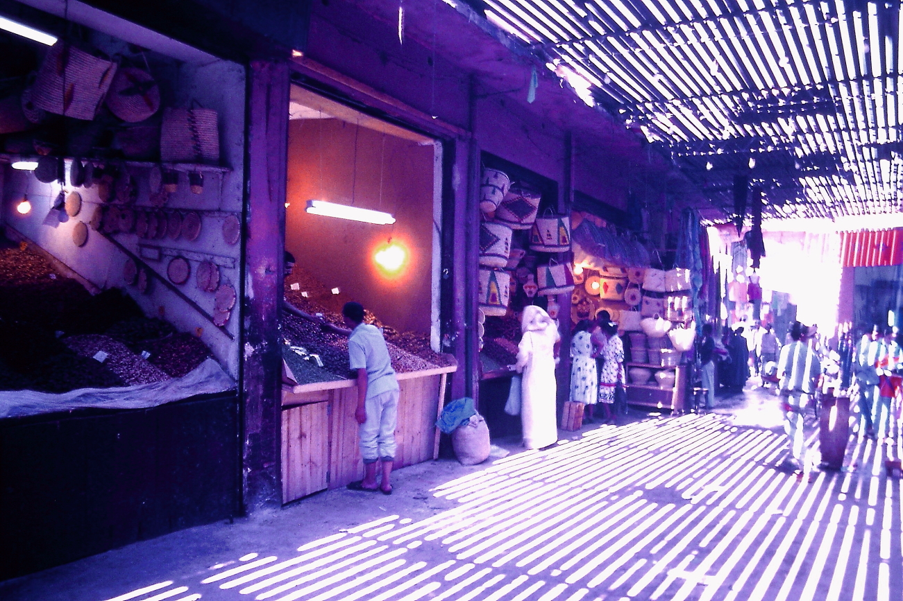 Il siparietto più “tenero” lo vivemmo uno degli ultimi giorni, quando, girando per la città ed osservando i Suk ed i negozi una signora avvolta da una tunica nera dalla quale si intravedevano solo occhi e mani che ne denotavano una età avanzata, si era avvicinata alla mia compagna chiedendo l’elemosina, ovviamente senza rivolgersi a me. Senza farmi notare presi alcuni Dirham cercando di passarli di nascosto alla mia compagna senza darlo a vedere, mentre lei, non capendo, non voleva prenderli ed insisteva che li dessi io alla Vecchietta; fu difficile, spiegare e convincere la ragazza che non era opportuno, ma ci riuscii. I ringraziamenti della vecchietta alla ragazza furono commoventi. Poco dopo ci sentimmo chiamare: un negoziante che parlava un pò di italiano aveva visto la scena e ci aveva chiamati da lui, ci spiegò che mi ero comportato correttamente e ci volle offrire un sacchetto dei dolci che vendeva nel suo negozio. Molte fotografie sono perse e rovinate, questi ricordi non sbiadiscono ancora.