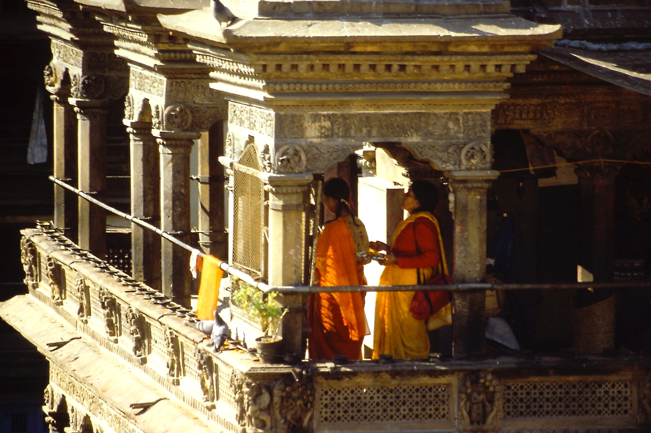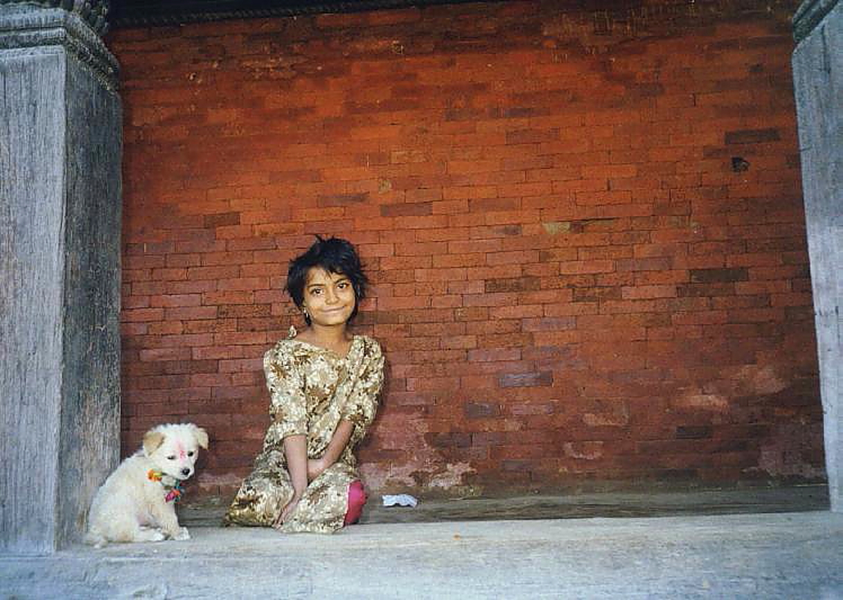 Sotto una vicina tettoia notiamo un cagnolino prima ed una bambina poi, Assunta parte e fotografa entrambi, io parto e fotografo il cucciolo, Assunta regala qualche caramella alla bambina che subito la ricambia con un sorriso: l’unica lingua in comune poi improvvisamente ricompaiono i bambini di prima ad infastidire la bambina, ci mettiamo allora tra i bambini e la piccola sino a quando i bambini scompaiono, ora il sorriso della bimba è ancora più radioso ed Assunta la fotografa ancora “conversando” più di prima. Apprendiamo che chiama Sita ed il cane Popi. Scollo Assunta dalla bambina e proseguiamo. Continuiamo a girare a caso, ovunque andiamo troviamo qualche cosa da vedere; ad un ulteriore tempio, il Nyatapola, ci fermiamo, è uno dei più grandi che abbiamo trovato, ci sono scolaresche che lo visitano; qui ci fermiamo sui suoi gradini piu in alto ad ammirare la città ed il viavai. Proseguiamo verso sud sino ad una piccola piazzetta con bancarelle assortite, dove mentre stiamo osservando, ritroviamo Sita con Popi, ci sorride e ci invita a seguirla sino ad una bancarella seminascosta dove una giovane ragazza avvolta in un Sari azzurro ci sorride. Sita ci fa capire che è sua mamma. Assunta Sita e la Signora si intendono a gesti, tra donne è facile 😊. E’ difficile staccarle per proseguire ancora la scoperta della città. Continueremo sino sera pre rientrare e raggiungere l’autista. L’ultima cosa da fare prima di lasciare Piazza Durbar è comprare tre CD a caso, della musica ascoltata al mattino al mattino e che ancora si diffonde nell’aria, li riascolto spesso tuttora. Back to Kathmandu, dopo una bella giornata! Cena Cinese. BELLA GIORNATA, BELLE SENSAZIONI