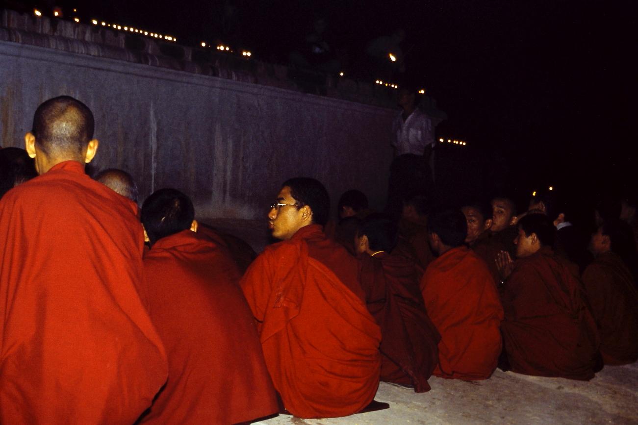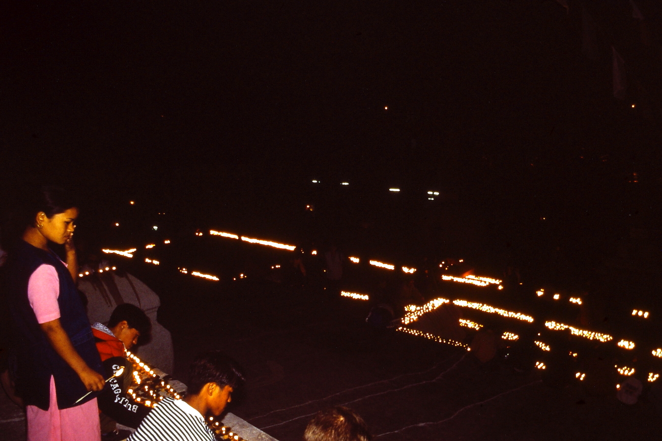 La sorpresa arriva inaspettata: contemporaneamente, dai monasteri circostanti, arrivano file di monaci che si accodano all’ingresso della struttura, ordinati dal più grande al più piccolo, tutti in fila risalgono lo Stupa, noi, come altri turisti, siamo lì, sorpresi, a guardare. Per alcuni minuti i monaci pregano, poi si disperdono, alcuni verso i turisti, altri verso i locali, distribuendo dei lunghi bastoncini ed iniziano ad accendere i Lumini, “uno a uno”, un’immagine di pace e tolleranza! Si è fatto buio ora l’unica luce proviene dai lumini, noi siamo lì, ammirati ed imbambolati, io fotografo e filmo; un giovanissimo monaco ci si avvicina e ci invita a partecipare, offre un bastoncino ad Assunta poi la prende per mano e la accompagna ad una nicchia insegnandole come accendere. Non ci sono differenze tra l’umanità presente, non chiedono di che razza siamo, che religione seguiamo, che cosa mangiamo, che gusti abbiamo: ci invitano a partecipare, TUTTI ASSIEME. Accendo, filmo e fotografo, fotografo, filmo ed accendo, ma soprattutto ammiro e mi lascio avvolgere da quella situazione e dalle sensazioni. Il tempo si è fermato, non esiste altro, solo esseri umani che inondano di luce lo Stupa accendendo migliaia di lumini! Quando ci rendiamo conto di che ora è usciamo a malincuore: l’autista ci attende da ORE, aveva capito che eravamo rimasti “ammaliati”. Decido che gli darò un lauto Extra, ed è giusto così! Nel percorso di rientro ci spiega: I monaci festeggiavano il “Capodanno del calendario Nepalese”. Non lo sapevamo. Questa serata non la scorderò più! Mi ha toccato nel profondo.