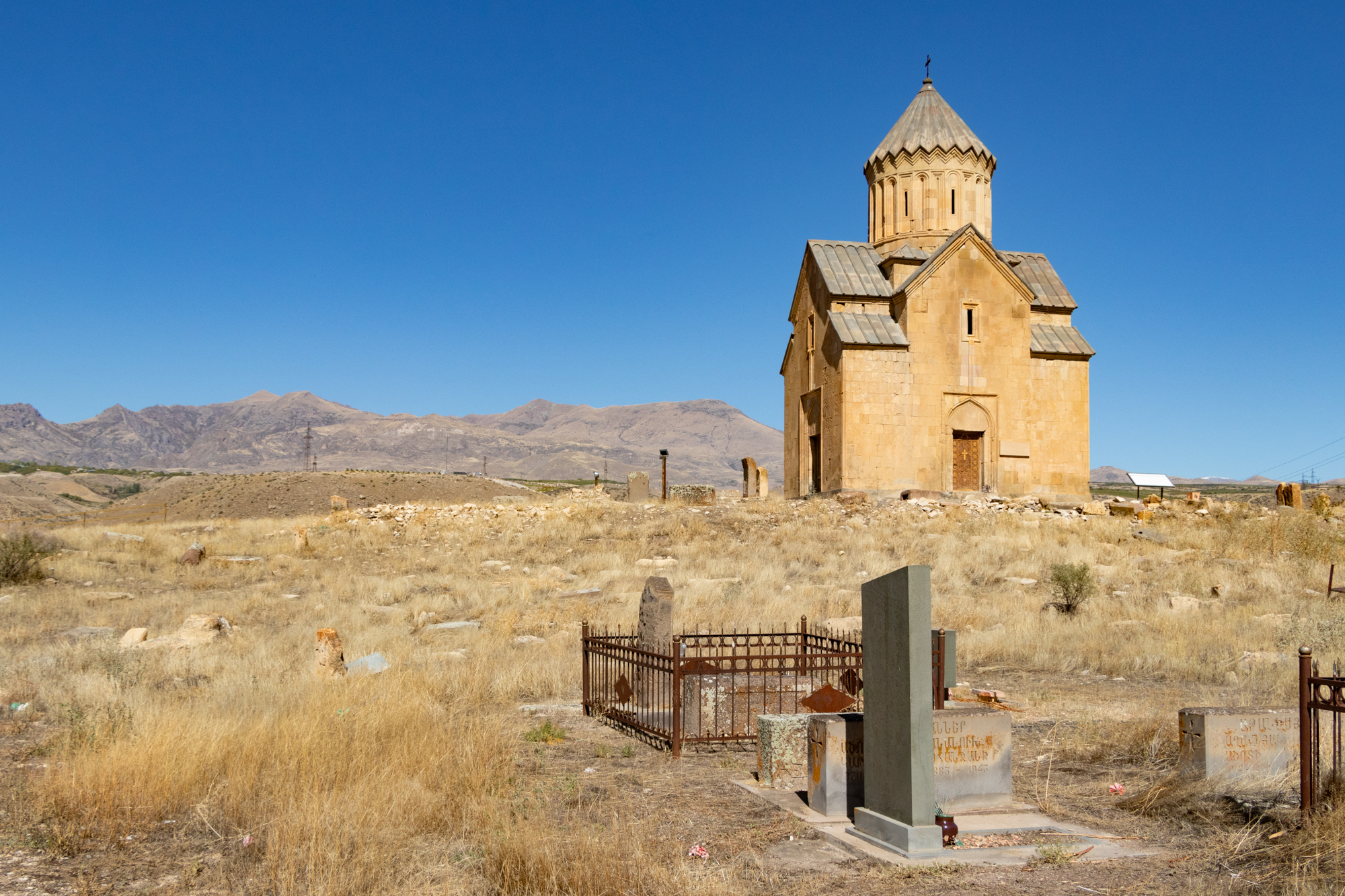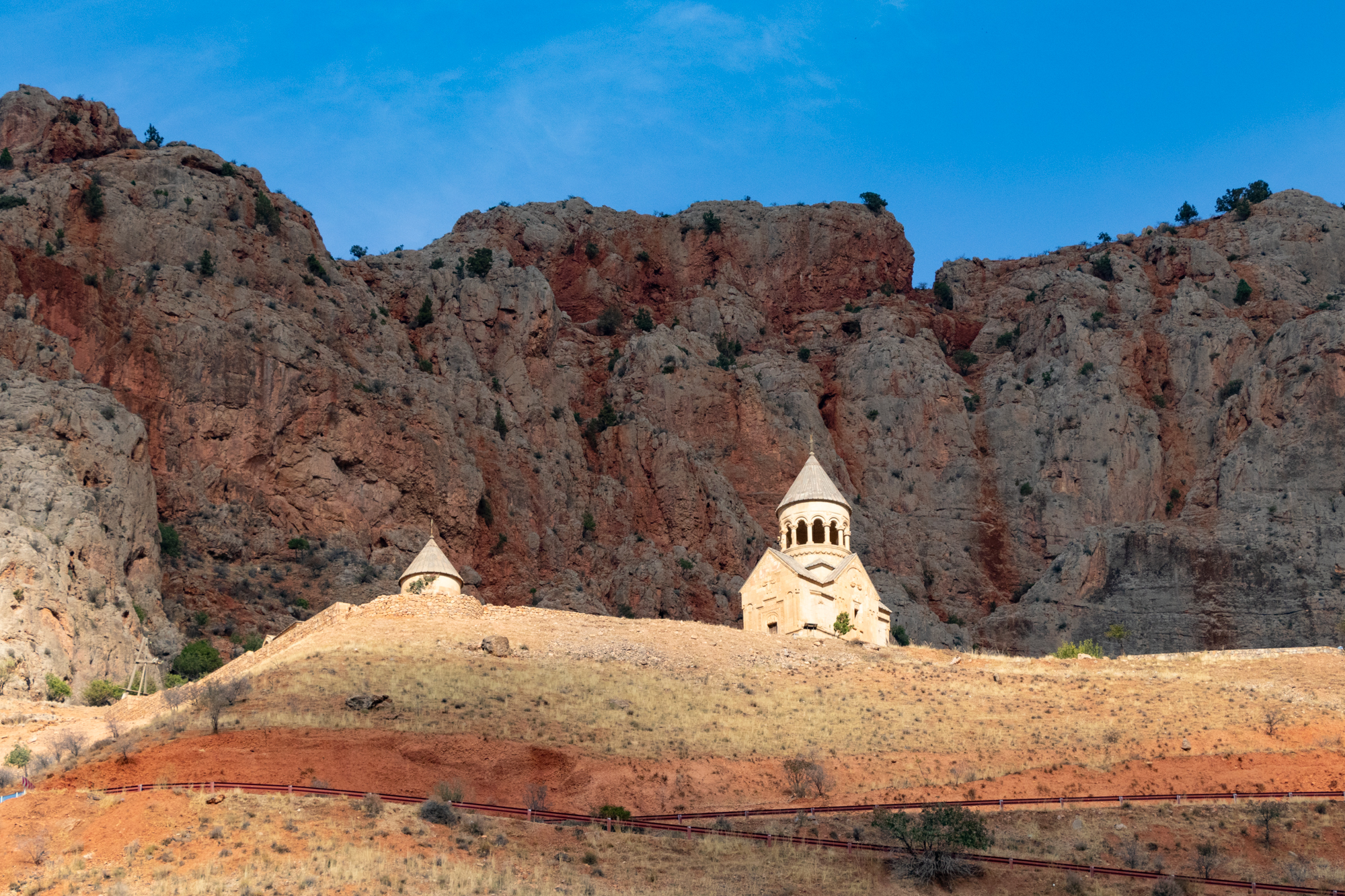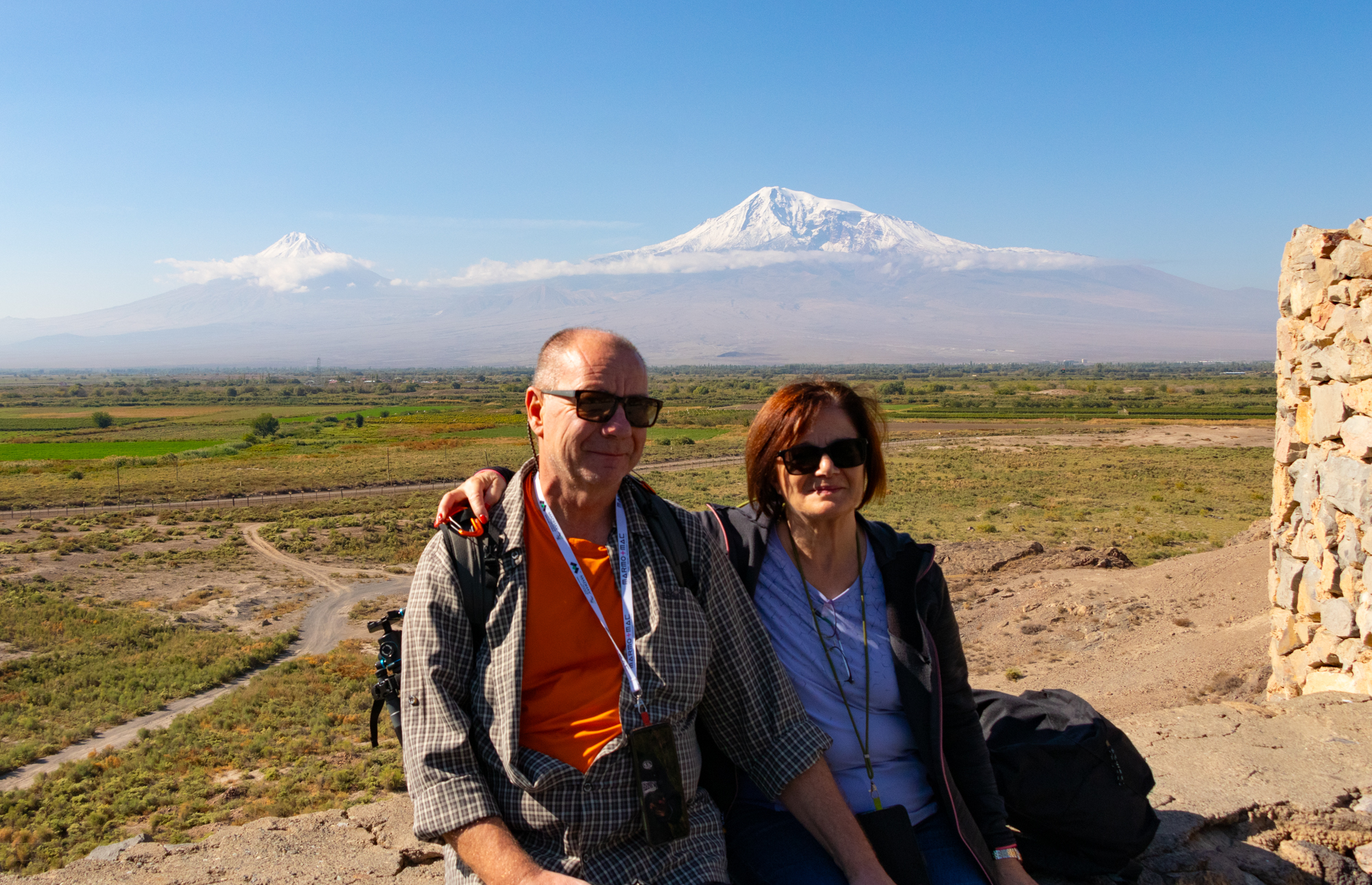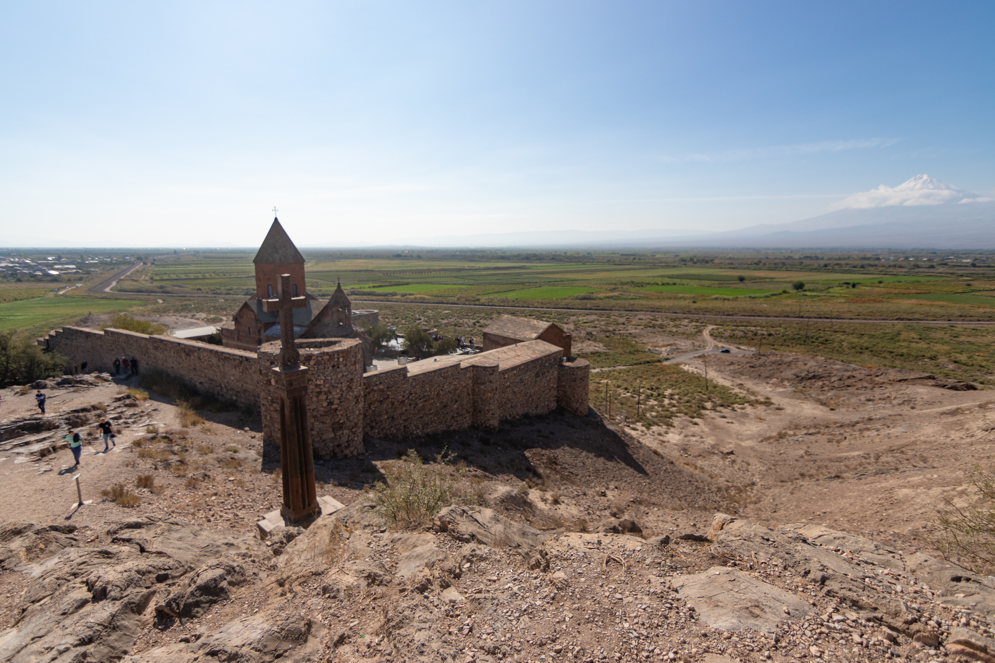 In una splendida soleggiata limpida giornata con ottima visibilità siamo diretti a sud mentre l’Ararat diventa sempre più grande. Lasciamo l’autostrada diretti a Khor Virap e dopo una breve pausa “Caffè e Frutta secca”, raggiungiamo il monastero con la vista mozzafiato verso la pianura e le montagne in direzione Est, ma soprattutto sull’Ararat ad Ovest, oltre all’orribile recinzione che separa la Turchia dall’Armenia. La Turchia si trova a duecento metri, sull’altra sponda del fiume Aras. Molti i visitatori ma c’è comunque tranquillità, simpatico il siparietto della scolaresca, guidata dalle maestre, che viene ricevuta dal prete, siparietto al quale abbiamo l’immenso piacere di assistere, pur senza capire i dialoghi e gli insegnamenti. Bellissimo il monastero e le vedute che offre, bello lo scorcio dalla collinetta che lo sovrasta interessante anche la vista sul cimitero che si trova nei pressi del posteggio e che visiterò prima di ripartire, constatando la differenza con altri cimiteri sino ad ora visti in giro per il mondo e restando “colpito” dalle tombe dei militari morti nelle diverse guerre che hanno coinvolto questa nazione, in particolare negli anni tra il 2016 ed il 2020. La Turchia è vicina, mentre l’Azerbaijan è a soli pochi km più a sud.