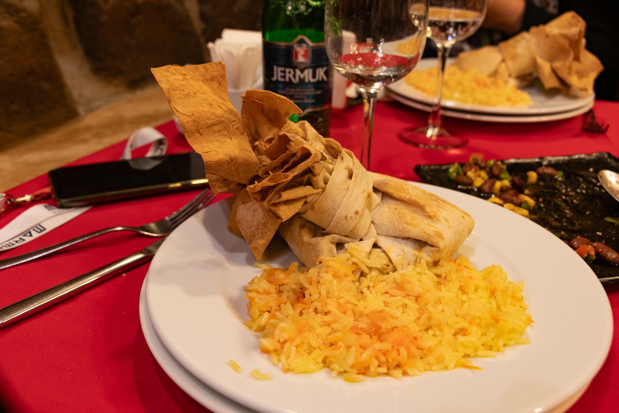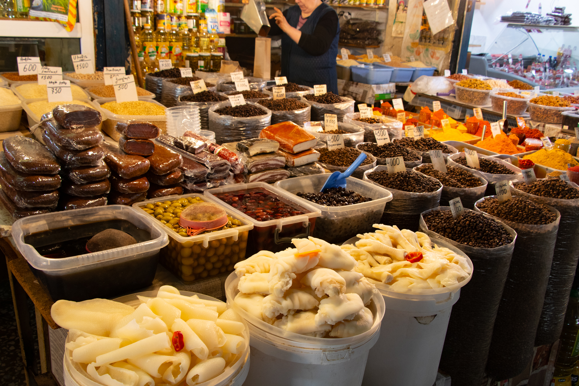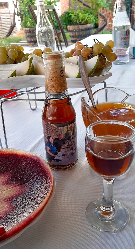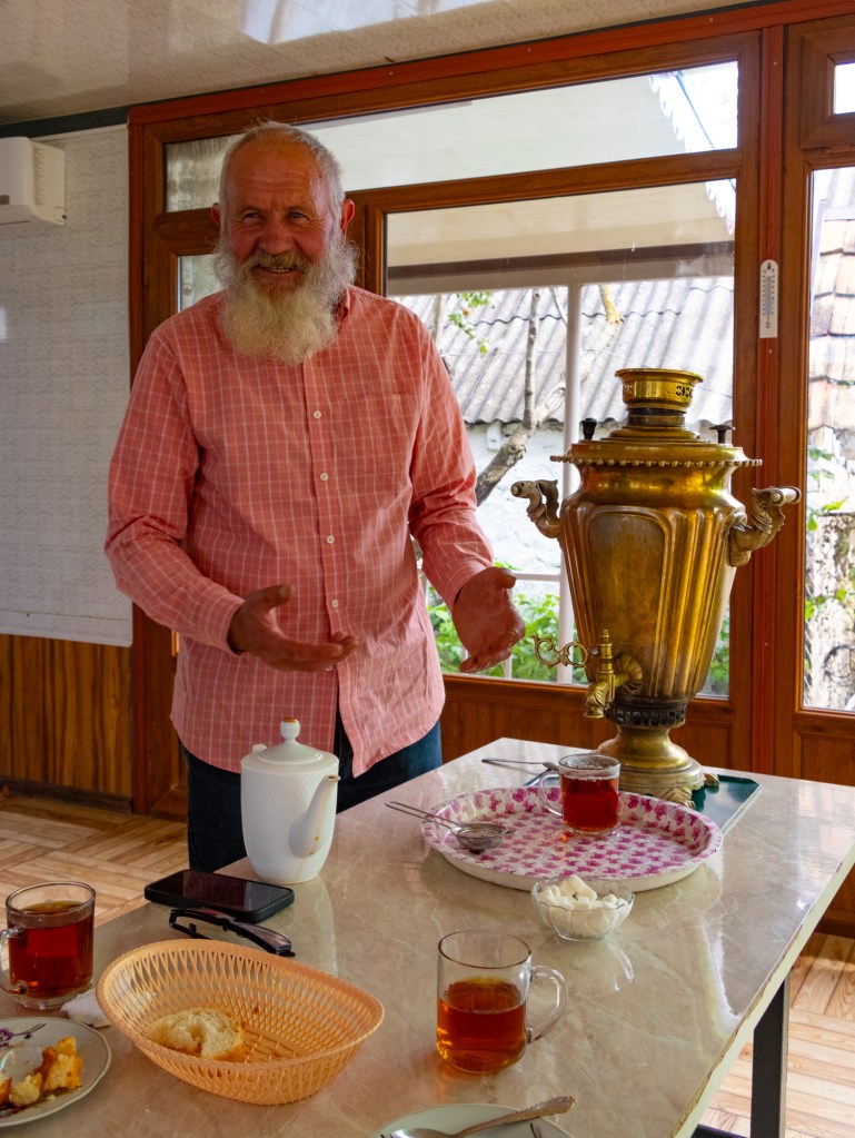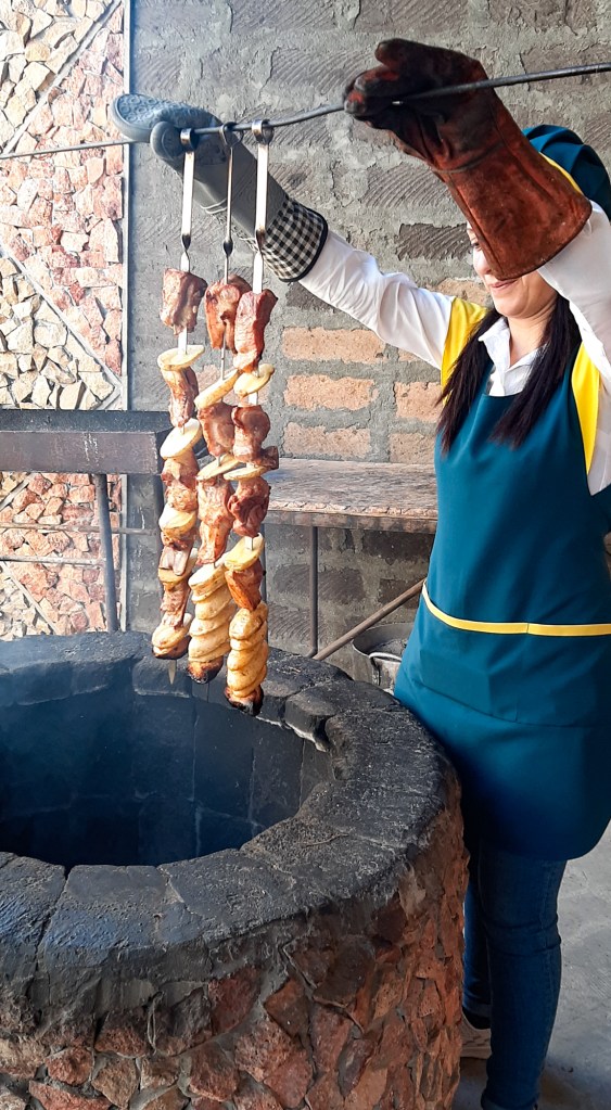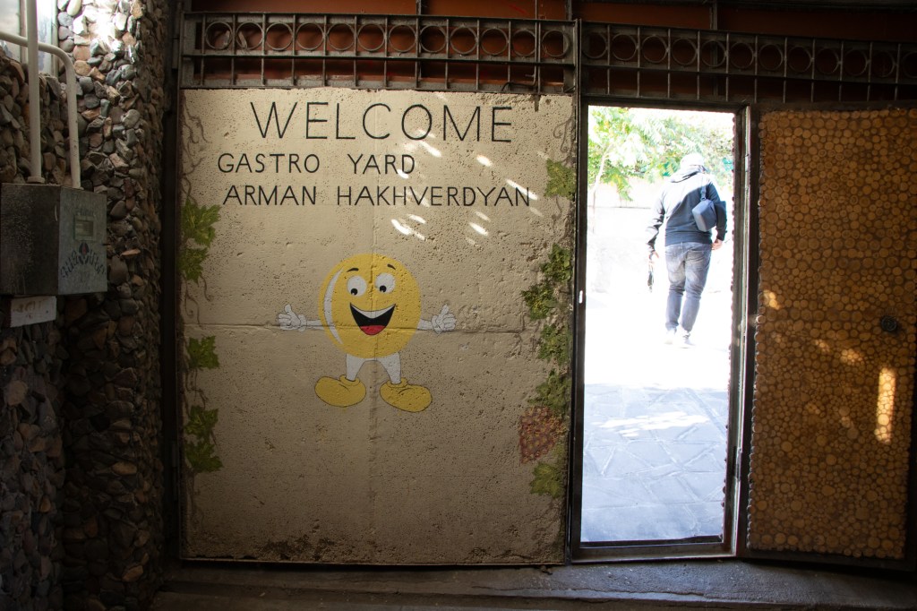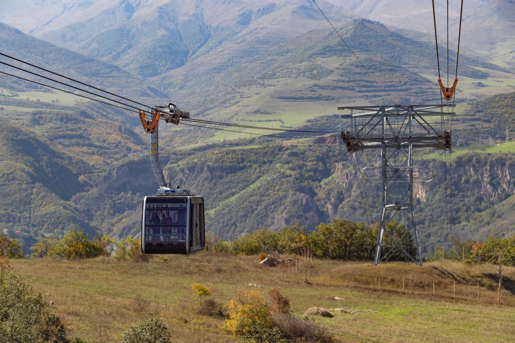 7 Ottobre – Sabato Ci svegliamo ancora in “un’alba timida” e limpida, il terrazzino si affaccia sulla strada alberata, dal sottostante panificio risale un piacevole profumo. Ricomponiamo le valige e scendiamo per colazione, ma la sala è piena così decidiamo di attendere; o meglio, Assunta attende lì, io no 😊! Io raggiungo il panificio dove ordino “un Lavash”, lo pago e chiedo di poter fare 2 fotografie, le commesse, sconcertate dalla richiesta, mi rispondono di SI così scatto quindi rientro all’Hotel soddisfatto. Faremo colazione nel giardino in quanto la sala brulica ancora di turisti tedeschi. Poi ripartiamo in macchina alla volta di Halidzor, diretti al “vero motivo” della mia richiesta di includere questa tappa: l’odierna prima visita è Il Monastero di TATEV. Soffro di Vertigini e memore dell’esperienza del volo su Nasca (Perù) sono perplesso; 6km di Funivia, circa 10-15 minuti sospesi nel vuoto con 300m di “salto” sotto di me mi perpliggono. Partiremo con il primo viaggio della giornata, assieme alla comitiva di tedeschi, visiteremo il monastero per poi rientrare, un’ora dopo quando saremo gli unici passeggeri dopo la velocissima visita. A parte la perplessità iniziale andata e ritorno sono andati lisci! Ho chiesto di non includere nella giornata, che sarà comunque lunga, le visite ai vicini villaggi abbandonati perché non so se saremmo riusciti ad attraversare il ponte sospeso. In sostituzione o chiesto la visita del monastero di Vorotnavank che però non potremo raggiungere: lavori sulla strada, sterrata e sconnessa, dopo il villaggio di Noravan; Il Mercedes Vito è comodo, spazioso ma basso così, alla seconda volta che tocca il fondo, suggerisco a Davit di rinunciare all’idea e di fermarci per altre pause lungo il percorso. La prima di queste sarà immediata, al villaggio di Noravan ed alcuni edifici abbandonati nelle sue vicinanze, poi ancora il paesaggio sul lago di Spandarian prima di raggiungere Yeghegnadzor per le prelibatezze del pranzo incluso nel programma. Il proprietario ci attende all’ingresso della cittadina e ci guida sino al ristorante, dobbiamo solo seguirlo. Si ferma su una stradina con piccoli edifici attorno ed un portone sul quale ci accoglie una ragazza in “grembiule” da cameriera; siamo arrivati all’ ARMAN HAKHVERDYAN GASTRO YARD. Pranzeremo sotto un pergolato ottenuto da viti. Siamo gli unici clienti e ci presentano la “proposta” culinaria, ma soprattutto “Etilica”; Ristorante, Vignaiolo, Produttore di specialità gastronomiche…. Ci fanno vedere il “Forno” dove stanno preparando il nostro BBQ, poi mi lascio attrarre dalle pietre che rivestono le pareti della struttura e quando spiego ad Arman che mi occupo di pietre, mi invita a vedere anche l’interno: sta facendo tutto lui, tutti i rivestimenti in pietra li esegue da sé.