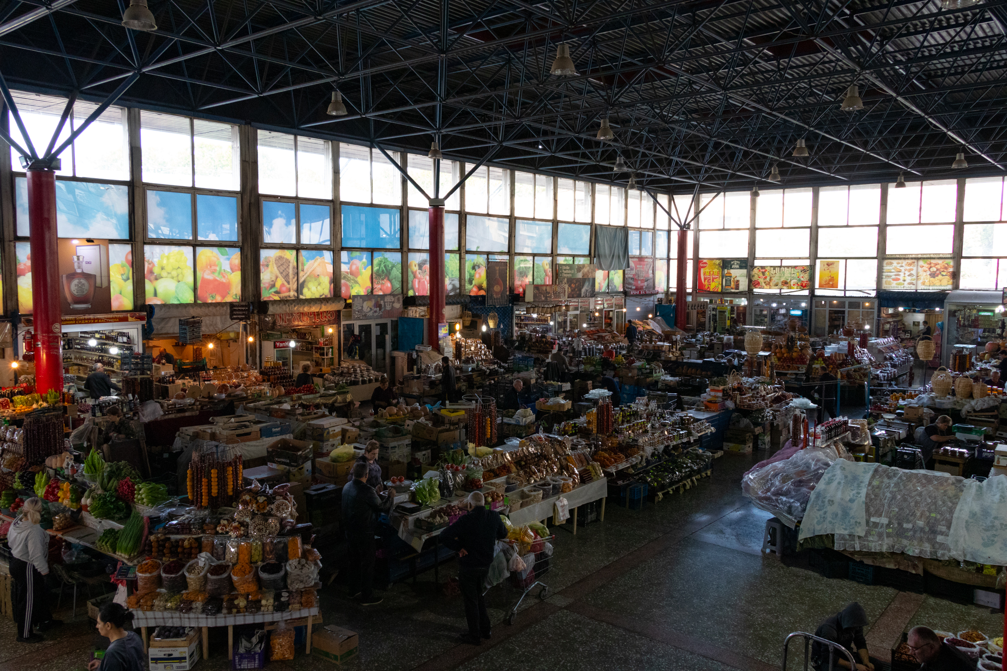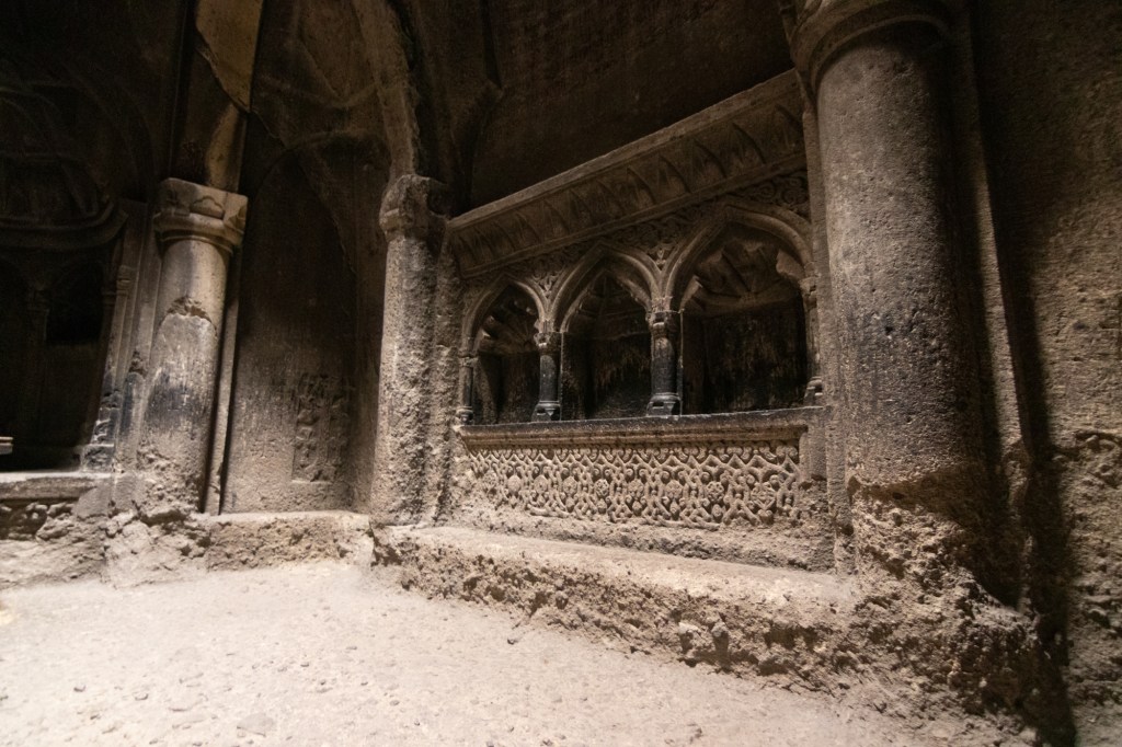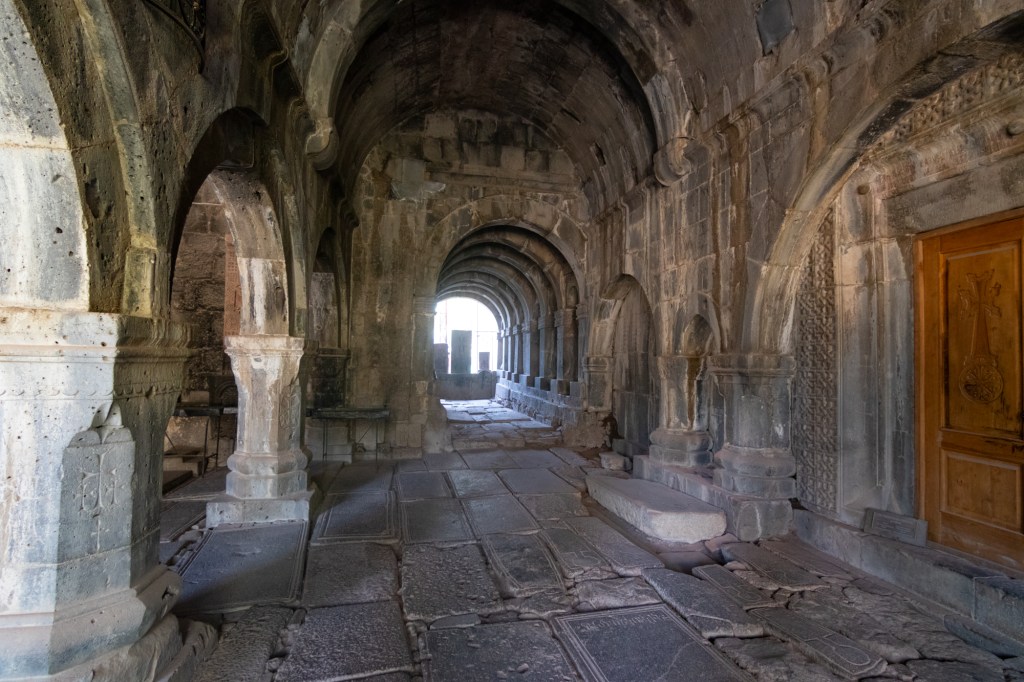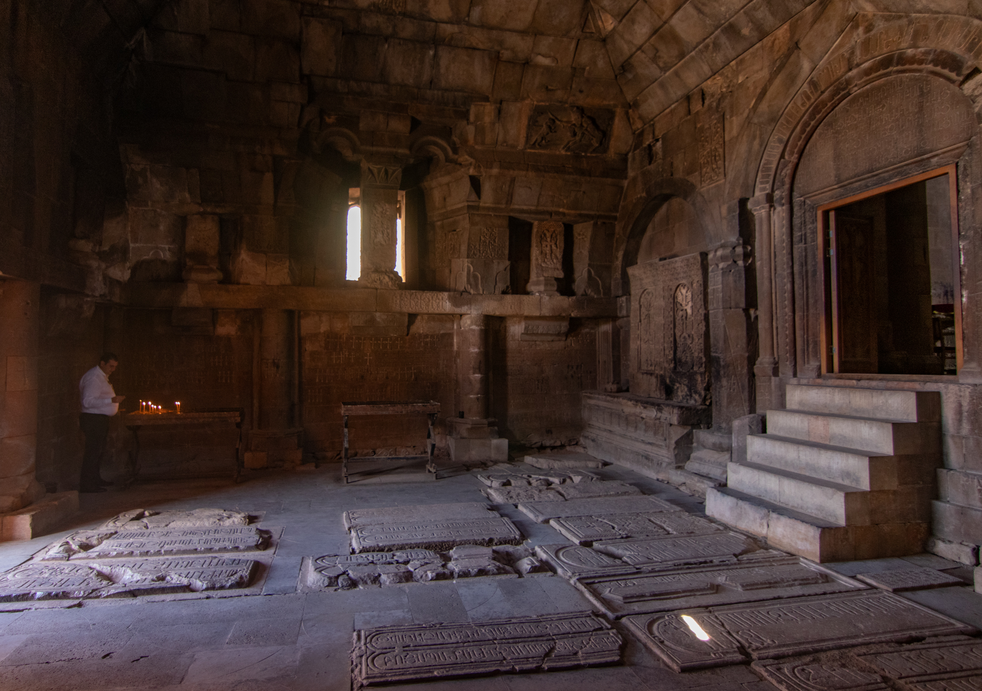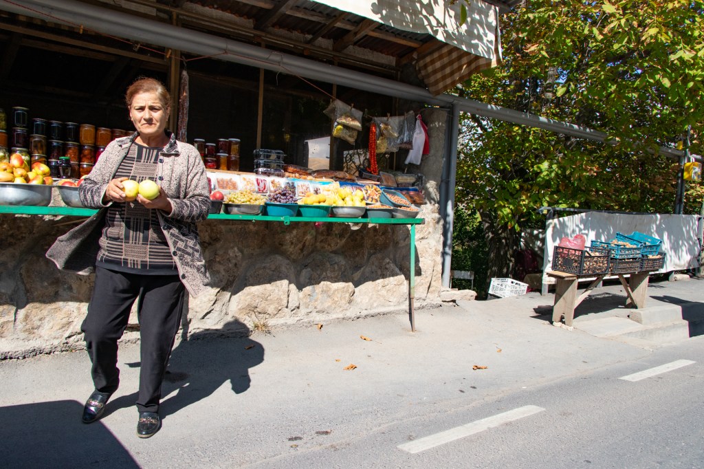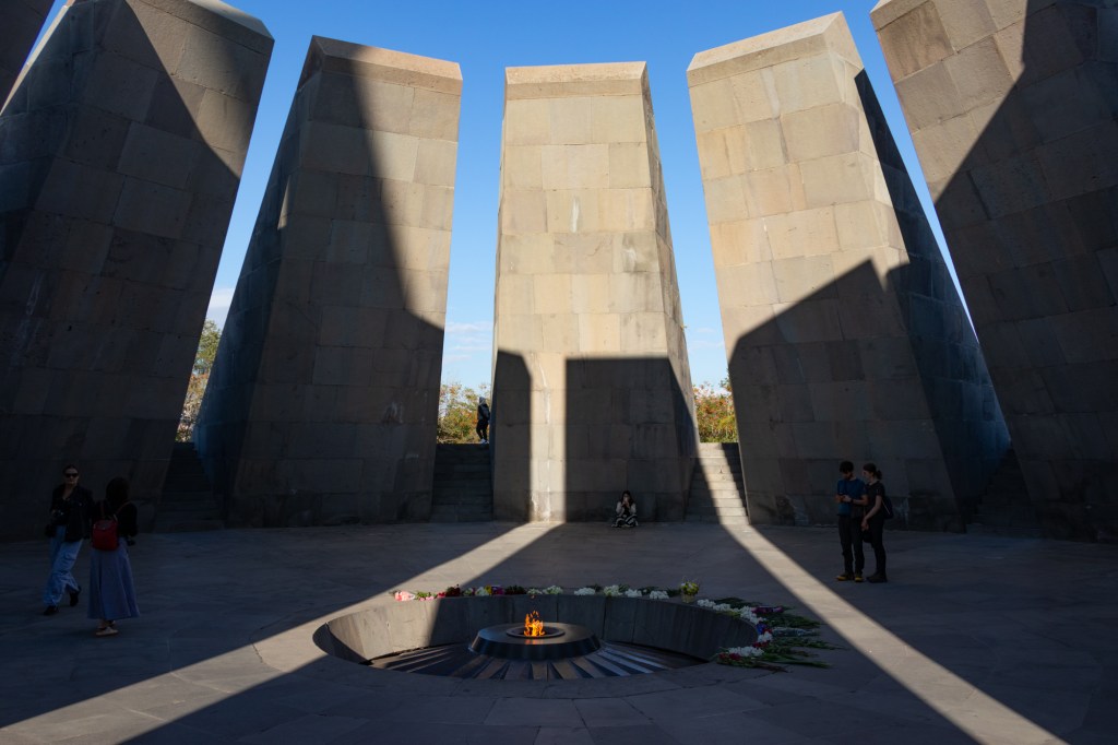 A Garni c’è un tempio ellenistico, in gran parte ricostruito dopo un devastante terremoto con molti pezzi completamente rifatti; dal tempio scendiamo poi sino all’ingresso della sottostante gola, questa molto più interessante soprattutto per l’aspetto geologico: una profonda gola, scavata nelle rocce basaltiche composte da infinite colonne di basalto verticali ed incurvate, di sezione geometrica. Ho già visto strutture simili in Islanda ho visto fotografie di quelle in Irlanda… sono interessanti ed enormi. Da Garni, dopo questa passeggiata, proseguiamo alla volta di Geghard e lungo il tragitto noto due bancarelle di frutta e verdura, estremamente fotogeniche, di cui memorizzo la posizione per fermarci al ritorno. Geghard è il primo monastero di questo tipo che visiteremo in queto viaggio; Davit ci dà le spiegazioni prima di lasciarci “liberi” a girare ed ammirare, esterni ed interni, ma soprattutto gli interni, dopo che abbiamo scoperto un gruppo corale che si esibisce in una sala del monastero scavata nella roccia. Terminata l’interessante visita ripartiamo diretti Garni per il pranzo e fermandoci a fotografare una delle bancarelle che ho notato all’andata dove ricevo la prima impressione positiva del viaggio: l’umanità e la cortesia delle persone: Chiedo di poter fare delle fotografie, la signora non parla le mie lingue ma capisce e mi autorizza, scatto, poi cerco di attraversare la strada per una immagine più ampia allora la signora, preoccupata mi chiama, facendomi capire di non andare via, sceglie 2 mele e 2 pere bellissime e me le offre, cerco allora di pagare ma non vuole, cerco di lasciare spiccioli sul bancone, ma insiste: mi fa segno di prendere la frutta per me 😊. Grazie Signora, inizia a piacermi l’Armenia, Davit sorride dicendo che è normale; Assunta ed io siamo sorpresi, anche dal profumo di quei frutti e subito arriviamo al ristorante per il pranzo, dove brevemente ci mostreranno come si prepara il loro pane tipico, il Lavash, patrimonio dell’umanità! La presentazione non è granché, è fatta per turisti, sarà più interessante entrare 2 giorni dopo di mattina presto nel panificio di Goris dove lo staranno preparando per i locali ed acquistarlo lì per poi mangiarlo. Terminato il pranzo si rientra a Erevan. C’è ancora una visita nel programma di oggi così raggiungiamo il Memoriale del Genocidio Armeno del 1915, avvenuto prima di quello ben più noto ed a noi geograficamente più vicino, entrambi esempio della bestiale stupidità della “belva umana”, quella “belva” citata da un noto cantautore dei miei tempi. Questo del 1915, qualcuno lo nega tuttora, pur spacciandosi per statista illuminato, ma che di illuminato ha solo il proprio obiettivo a discapito di popolazioni che sarebbero ben felici di starsene tranquille, colpevoli solo di una cosa, quella di non seguire la stessa religione o corrente.