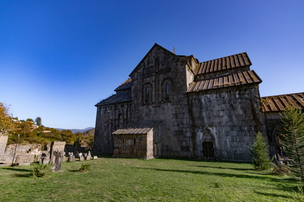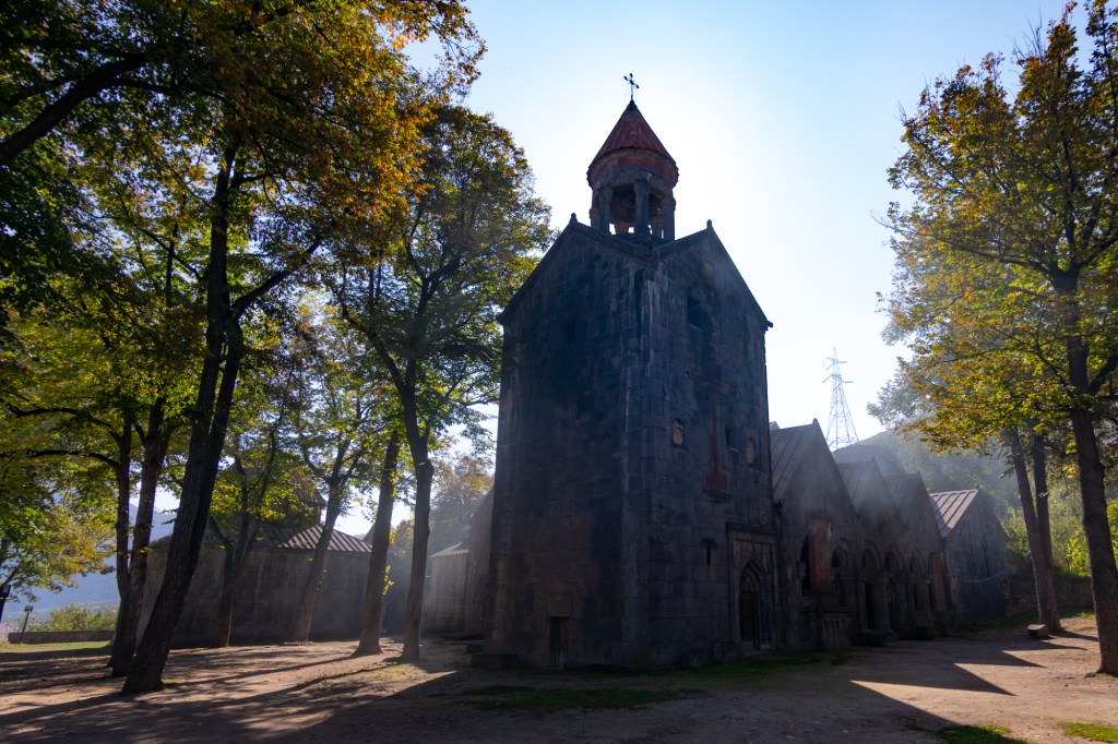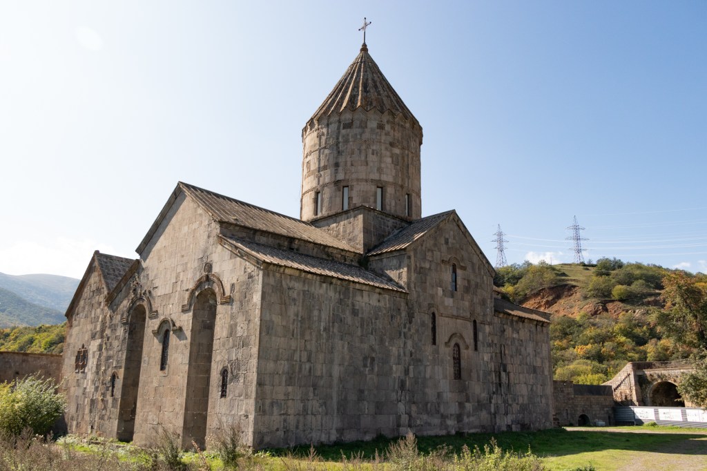 8 Ottobre – Domenica Non siamo ancora consci di quanto sua accaduto in Israele, scarse le notizie. Partiamo subito dopo la colazione diretti a Sevan ed al Monastero Sevanavank da visitare anche per il bellissimo il panorama. Poi, lungo la strada, un paio di soste, da dei “pescivendoli” che non strillano, prima di raggiungere Dilijan. Non ci piace Dilijan la “svizzera” dell’Armenia, dove l’unica strada “storica” è in realtà un tratto di albergo, sono invece interessanti l’Anfiteatro ed un paio di vecchi edifici decadenti di cui uno proprio davanti all’Anfiteatro; forse sarebbe stata interessante una visita al museo delle Tradizioni locali, ma bisogna proseguire per raggiungere Ljevan dove pranzeremo in una casa privata gustando delle ottime Tolma che assomigliano incredibilmente ad alcuni Sarmale che ho mangiato in Romania. Il viaggio è ancora lungo e prevede molta strada e due monasteri. Dopo il rientro in italia mi chiederò perché sia stato organizzato così il tragitto odierno e l’unica risposta che mi riesco a dare è: per pranzare in questa casa privata. Lasciata Ljevan, infatti, proseguiamo verso nord, sfiorando dapprima il confine con l’Azerbaijan, poi quello con la Georgia. Prima di partire ho letto un pò della storia di questa zona, non pensavo saremmo passati di qua, pensavo piuttosto verso Fielotovo, ma questo è il percorso. Mi sono segnato sul GPS alcuni punti che sfioriamo mentre noto come l’autista stia accelerando, gli chiedo informazioni sulla chiesa della Madonna di Vokespar, so che è adossata al confine, comunque in zona armena, ma mi risponde secco: “non ci si può fermare” cosi verifico il GPS avvicinandomi e la scorgo da lontano, imposto la macchina fotografica per scattare quando rallenterà, come gia accaduto in altre occasioni, invece… Non rallenta! Guardo e scatto, mentre scatto mi spiega che il paese che vedo (poche case il resto sta oltre la collina che stiamo sfiorando) è stato abbandonato trasferendo la popolazione negli anni attorno al 1990 e 1991, l’occhio nota qualche cosa è scatto, scoprirò a casa, ingrandendo, che erano delle postazioni militari una torretta con telecamere ed un camion mimetizzato. Dopo altri 10-15 km di guida “sportiva” finalmente rallenta. Poi arriveremo ad Akthala , bellissimo l’interno affrescato della Chiesa, purtroppo rimango colpito dal Battesimo collettivo che si sta celebrando all’interno, così mentre ammiro il battesimo arriva l’autista, “The time is gone, the song is over… Thought I’d something more to say” recita una canzone dei Pink Floyd. Davit ci aveva detto “prendetevi tutto il tempo che volete, il prossimo monastero è vicino e dormiremo li, quindi non c’è fretta” … sino a quando la fretta non la mette lui. Ripartiamo quindi controvoglia alla volta di Haghpat. La visita di Haghpat ci riappacifica con il poco tempo avuto ad Akthala. Fa parte della lista Patrimonio Unesco, grande, molti edifici, interessante, troppa gente… forse perché è domenica? La visita meriterebbe più tempo. Anche da qui si parte presto, bisogna raggiungere il vicinissimo Hotel QEFO, così vicino che, quando arriviamo il sole non è ancora tramontato, ammiro il tramonto dalla finestra della camera, poi scendiamo: siamo in anticipo, ci hanno “riservato” il tavolo al ristorante per le 19.30 … se lo chiamano ristorante e se per loro è “riservare”: la persona che ci ha cordialmente accolto e “riservato il tavolo per le 19.30″, guarda la sala, composta da lunghe tavolate quasi tutte piene di stoviglie e resti di pasti e ci indica l’unica tavolata non ingombra e non apparecchiata, dicendoci che quello è il nostro posto. Poi arrivano i menu separati per Mangiare e Bere. Ho già avuto modo di osservare alcuni locali, così, individuato in inglese quello che desideriamo quando arriva il cordiale Ragazzo Barbuto gli Indico direttamente dal menu: 1x BBQ, 1x BEEF STEAK, 2xGlass Red Wine, e gli chiedo se i piatti includano “Vegetables” così alla risposta negativa iniziamo chiedere le scelte che, pur se sul menù, “non ci sono”, optiamo allora per 2x Potatoes, indicando il tutto con l’indice sul menù per evitare dubbi. Il BBQ è arrivato dopo 20 minuti, per la BEEF STEAK abbiamo atteso altri 20 minuti (20+20), poi, dopo ulteriori 30 minuti (20+20+30) mi sono alzato considerato che nessuna delle 3 cameriere ci rispondeva ai richiami, e mi sono diretto alla cucina da dove “miracolosamente” in quel mentre sbucava sorridendo la nostra cameriera con 2 piatti di patate, il sorriso le è passato quando ho fatto cenno di NO e di tornare indietro.