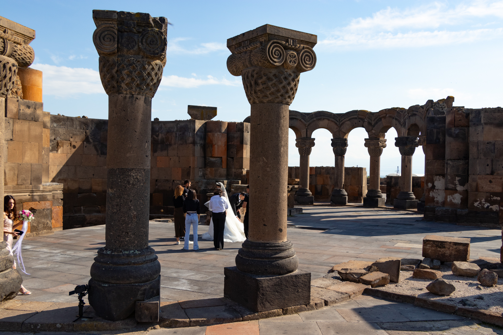11 Ottobre – Mercoledì Sveglia, Bagagli, Colazione, carichiamo le valigie ed alle 9.15 siamo diretti al Mercato GUM, dove acquistiamo formaggi, salumi e frutta secca, spendiamo la gran parte degli gli ultimi Dram rimasti. Da Erevan procediamo diretti ad ovest, alla volta di Metsamor per visitare il Museo Archeologico, risulterà molto interessante apprezzerò soprattutto la bellissima la “Rana Amuleto” che vi è esposta. Viaggiamo dapprima verso Ovest, poi quando l’autista cambia direzione in direzione Ararat capisco che ha girato verso Sud. L’autista è lui, io avrei continuato verso Ovest, ma forse le mie mappe sono vecchie e ci sono nuove strade non segnate! Quando finalmente l’Ararat mi si riposiziona a sinistra, verso le mie spalle, è per imboccare una strana strada sterrata, percorribile a passo d’uomo a causa di dossi e cunette prodotte dal traffico di camion per movimento terra. L’autista continua a guardare il Suo navigatore, così, dopo 20 minuti, attivo il mio Gps con la mappa OpenStreetMap (con la quale ho gia girato tra le altre Islanda , San Pietroburgo, Slovacchia e Giordania) e realizzo: “dove Ca..o sta andando?” Il museo o davanti a noi, a 3km in linea d’aria, la mia mappa indica una “mulattiera”. Dopo altri 10 minuti di buche e colpi sotto la vettura, l’autista impreca per la “mappa non aggiornata” e mi rendo conto che sta per cedere, allora gli spiego: “la strada (usiamo l’eufemismo) non è delle migliori, comunque, Il museo e ora ad 1 km davanti a noi, proseguiamo così, se percorribile, poi a circa 300m giri stretto a DX e passi il ponte…” Lui mi interrompe e chiede “Ponte…?” “Si”, rispondo io: “ponte e dopo il ponte prosegui altri 400m sino a quella linea elettrica, dove dovrebbe esserci un secondo ponte, lì giri a sinistra costeggi la linea elettrica e dopo il secondo pilone dovresti riprendere a SX la strada asfaltata” Non mi crede! Si ferma a chiedere ad un contadino che credo gli dia le medesime indicazioni, almeno dai gesti che fa. Infatti, prosegue esattamente come gli ho detto prima. Il secondo ponte non mi piace, ma non vuole farmi scendere a verificare le condizioni, decide di passare comunque, e ci va bene. Grazie al cielo raggiungiamo finalmente il museo ed iniziamo la nostra visita accompagnati da una bravissima addetta che ci spiega gli oggetti esposti e la storia del sito, prima di accompagnarci all’esterno e lasciarci a visitare anche la parte esterna e gli scavi prima di raggiungere nuovamente l’autista per ripartire. C’è però un problema: L’autista comunica un concetto del tipo: Huston, abbiamo un problema! “ok, dimmi qual è?” “mi serve il tuo passaporto” prosegue lui. Così apro lo zaino e consegno il passaporto; lui lo ignora ed aggiunge: “Ha chiamato l’hotel, hanno trovato un Passaporto ed un Portafoglio”. Guardo Assunta, “lo hai fatto davvero? 😊” (la sera prima mi aveva confessato che sarebbe rimasta volentieri a Erevan 😊). Scherzi a parte: siamo sconvolti! Abbiamo già perso circa un’ora per il percorso “smart”, ci troviamo ad almeno 45’ da Erevan ed abbiamo ancora visite da fare, per essere in aeroporto entro le 17.30; David sostiene che si può fare tutto e rientrare all’albergo, io ci ragiono e dopo l’esperienza della “stradina” opto per accorciare il programma, concordiamo allora come e raggiungiamo la sintesi: visitiamo il vicino Tempio del Pavone ad Aknalich (non interessante) dove Lui si fa il solito filmato con il drone, poi raggiungiamo Echmiadzin dove hanno prenotato il pranzo, lì vedremo solo da lontano la Cattedrale, comunque chiusa e non visitabile, poi Santa Hispirne, quindi la Cattedrale di Zvartnos; al termine, di volata, raggiungeremo l’albergo per recuperare il passaporto e poi all’aeroporto. Ottimo e come sempre abbondante il pranzo, molto interessante la Cattedrale di Zvartnos e giunti qui ci rendiamo conto di aver “saltato” la sosta a Santa Hispirne. Non è giornata! Zvartnos è bellissima, saltiamo un gruppo di italiani con la guida che gli spiega il sito e mentre camminiamo David fa altrettanto, in inglese, ma con meno informazioni, quindi, raggiunto il sito vi troviamo la coppia di sposi, con damigella e fotografi, intenti al servizio video e fotografico per la loro splendida giornata, mentre la nostra lo è meno. Davit si intrattiene con gli addetti al Drone lasciandoci liberi così ci immergiamo nella visita cercando di scattare le nostre foto, senza impallare il “set” agli Sposi, perlomeno sino a quando l’orda dei connazionali che prima era trattenuta dalle spiegazioni non si riversa nel sito e nel “set” innervosendo sposi e fotografi. E’ finita la tregua così, mentre i fotografi diventano intolleranti, decidiamo di avviarci. Prima di raggiungere il posteggio incrociamo altre 3 comitive, appena scaricate da altrettante corriere, due delle quali sono orientali, abbiamo fatto appena in tempo. “Game Over!” Il sole splende su Erevan mentre attraversiamo il centro, diretti all’albergo per recuperare portamonete e passaporto; qui lasciamo una buona mancia ringraziando per la cortesia, ma soprattutto per l’onestà e risaliti in macchina ripartiamo alla volta dell’aeroporto. Assunta non voleva partire, troviamo allora il compromesso: Ci torneremo!