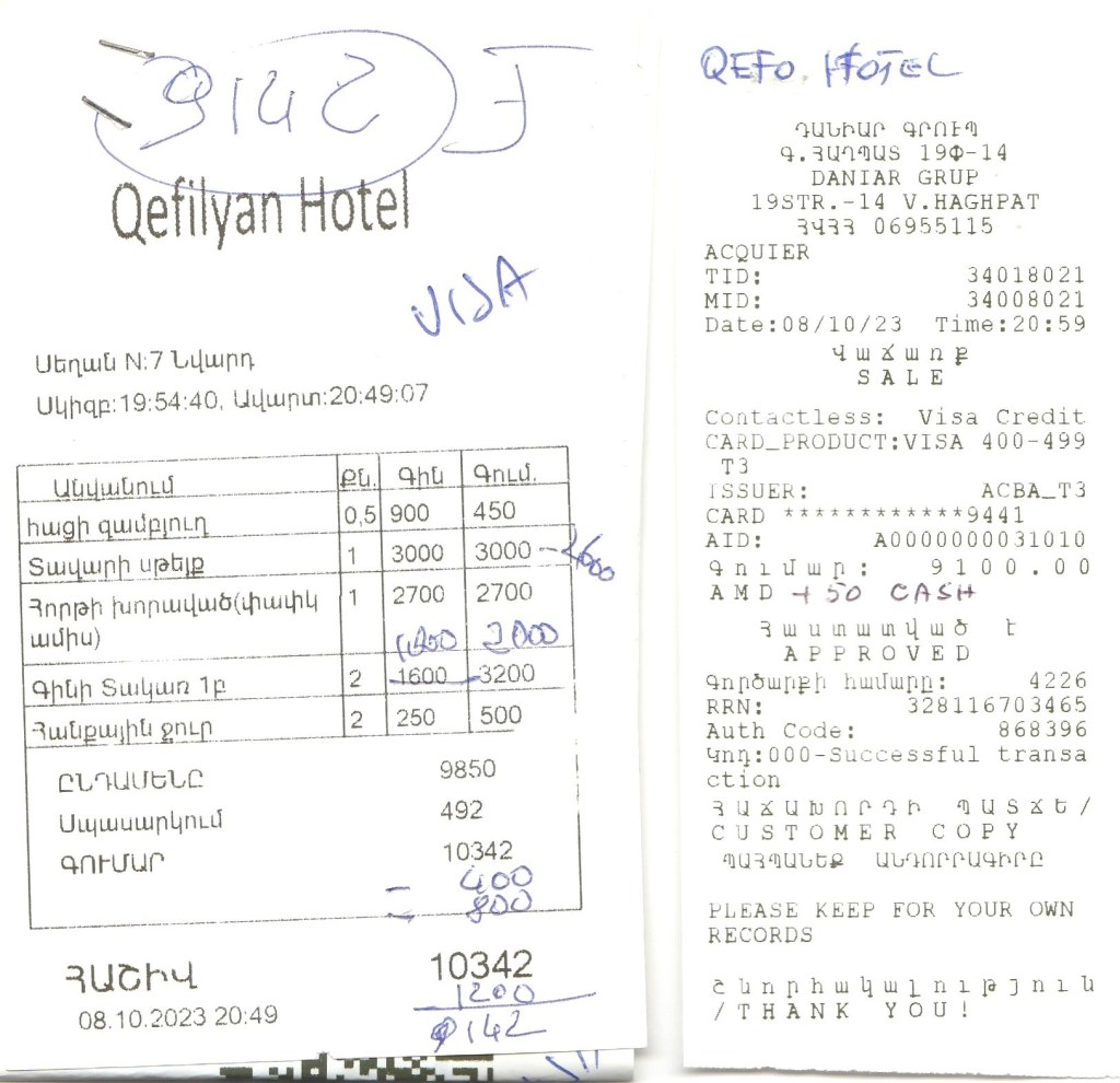 A quel punto ho provato in inglese a chiedere di parlare con il Manager, ma non capiva, neppure l’uso di termini come “Manager, Boss o Chef” hanno dato esito; in quel mentre il nostro autista presente in sala ha visto la scena e mi ha raggiunto chiamando poi il “Cortese Ragazzo Barbuto che parlava inglese” al quale ho spiegato le mie rimostranze mentre Lui mi dava ragione. Per tagliare la discussione ho chiesto il conto dicendo che avrei certamente pagato, ma solamente quanto ricevuto. Per il conto sono stati velocissimi, penso fosse già pronto, così, leggendolo ho notato come alcuni prezzi non corrispondessero a quanto indicato sul menu e, non comprendendo la scritta in armeno, ho chiesto chiarimenti. Il Giovane cortese Barbuto Anglo-parlante si era nel frattempo volatilizzato per non comparire più, mentre la cameriera cercava di spiegarmi i piatti, facendomi capire che le “Cartofi” non erano nel conto. Tutto bene, ma non quadravano i prezzi: ho quindi preteso di avere i menu, che sono arrivati “a rate” dopo ripetute insistenze, mie e dell’autista che si era fermato con noi. Risultato: I prezzi della Beef-Steak e dei 2 bicchieri di Vino erano stati maggiorati. La giustificazione è venuta fornircela il Capo Cuoco, nella sua lingua tradotta dall’armeno all’inglese dal nostro autista, Cuoco che “nessuno aveva interpellato” e con il quale “nessuno di noi aveva mai parlato prima”: “Ci avevano Dato dei Vini selezionati“, sosteneva Lui, mentre la Beef-Steak “Aveva il vecchio prezzo sul menu, prezzo che era cambiato“. Nelle mie poche ed arruginite parole di Russo sono stato in grado di estrarre quanto basta per esprimere un semplice concetto: “Sono italiano e non parlo Russo, ma non sono stupido; l’effetto è stato che, senza dire nulla, si è dileguato anche il cuoco lasciando sola la cameriera palesemente imbarazzata ed il nostro autista al quale ho spiegato che “il problema è la gestione del ristorante che è ridicola, la cameriera non ha nessuna colpa”. A quel punto ho semplicemente preso una penna, corretto i prezzi sul conto, rifatto il totale e fatto capire alla cameriera che “quello era l’unico prezzo che erano autorizzati ad addebitarmi sulla Carta di Credito”, mi ha risposto OK ed ha addebitato l’importo INFERIORE. La differenza l’ho data “brevi mano” in contanti davanti all’autista.