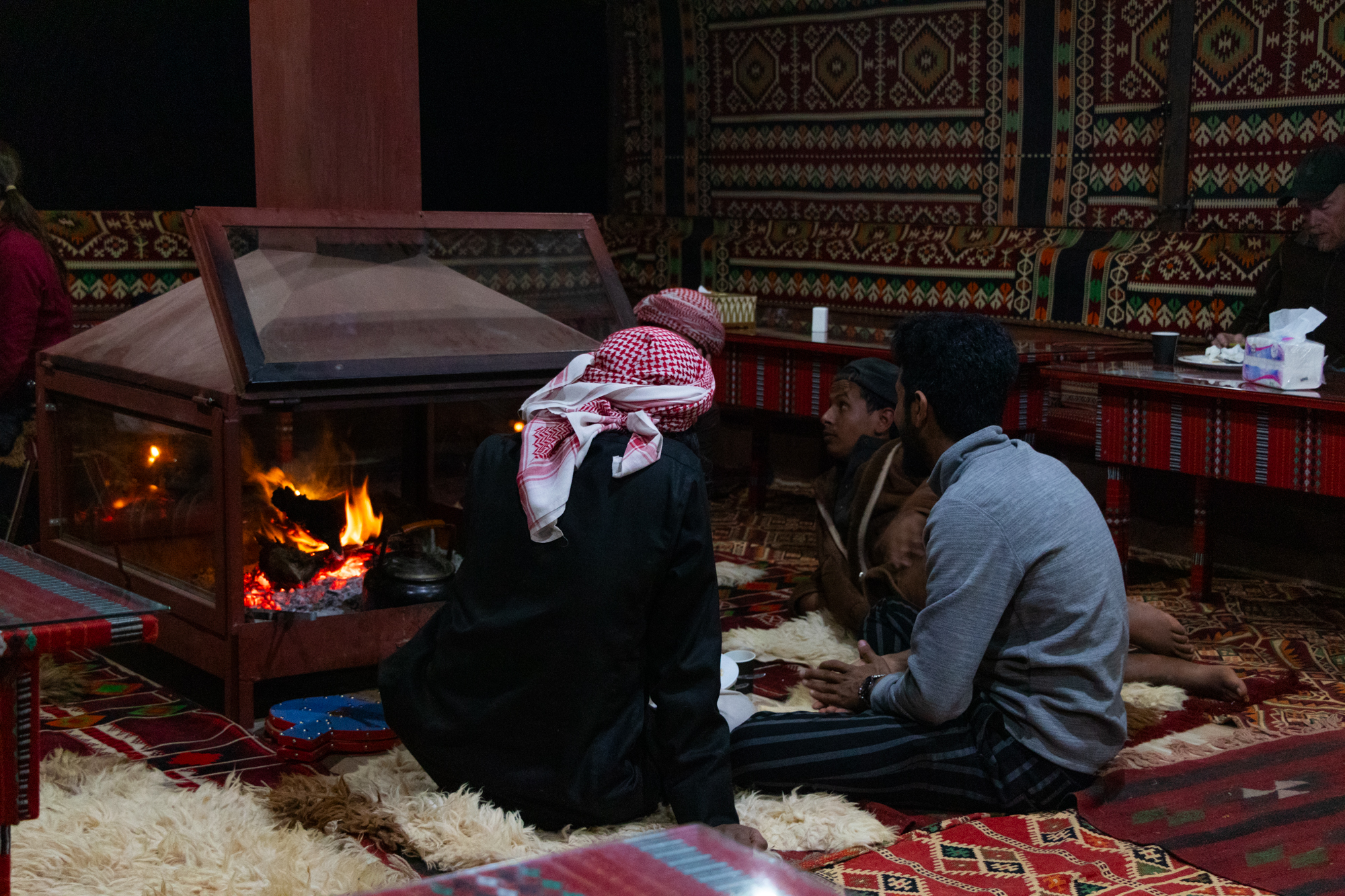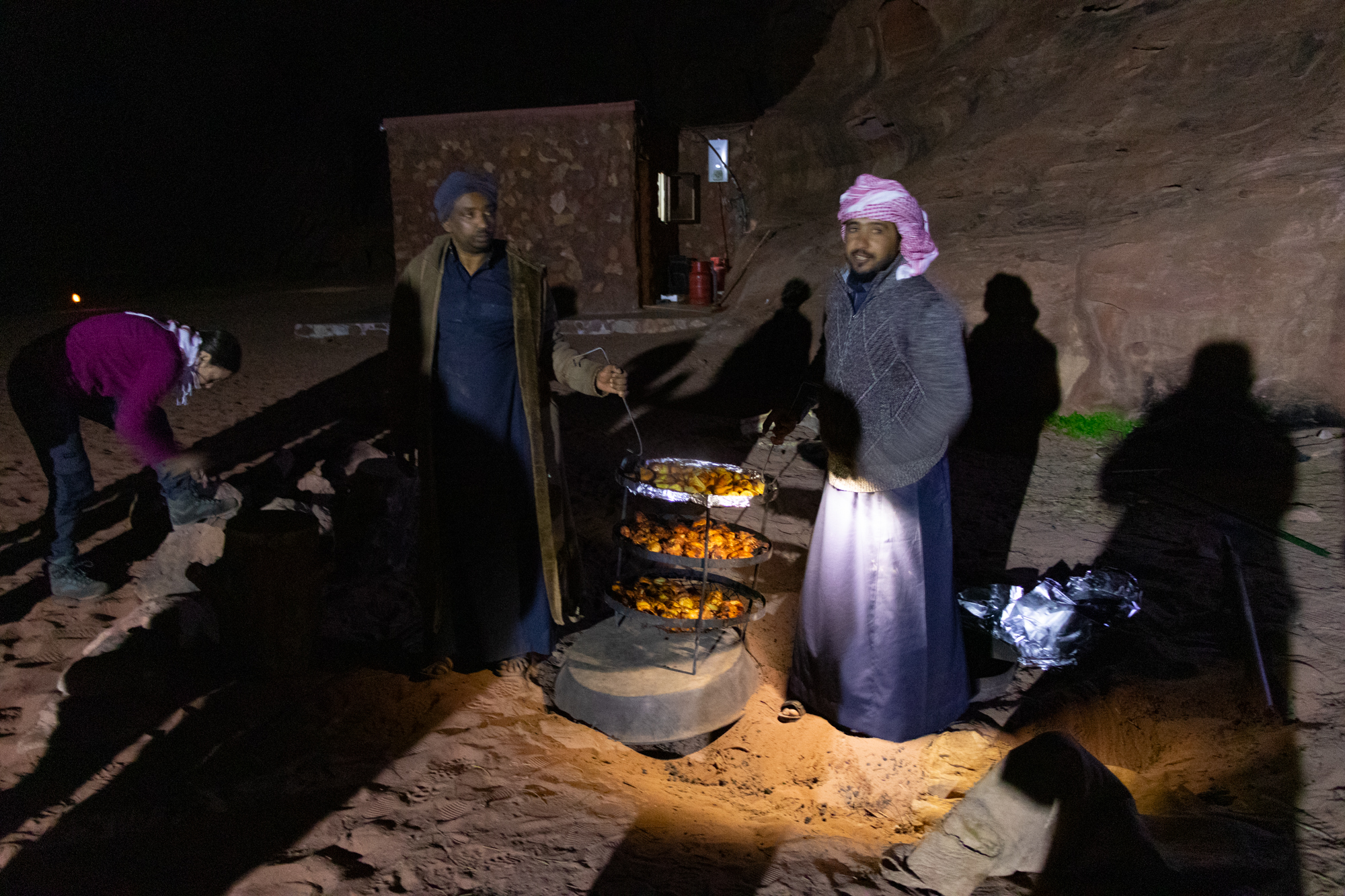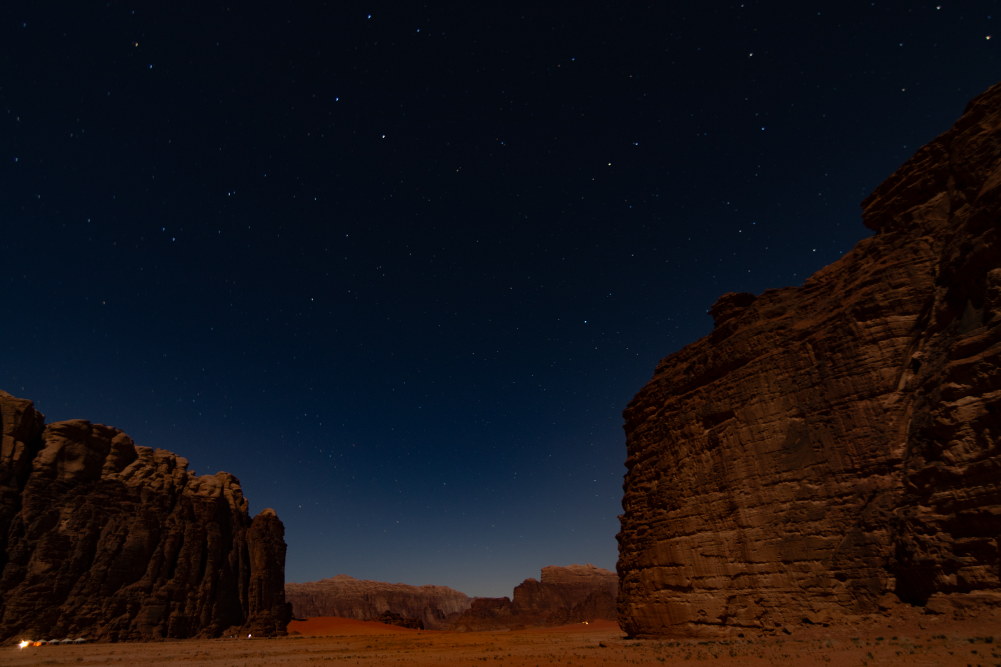 La cena nella tenda, con le guide autisti e responsabili del Camp è particolare, ovviamente insolita. Un gruppo di Spagnoli festeggia un compleanno, poi Svizzeri e Belgi, di italiani solo noi: 30 persone al massimo. Dopo cena rientriamo per accendere la caldaia e pausa doccia. Si, “pausa doccia”, perché la notte deve ancora giovane e la Canon munita di grandangolo scalpita! …saranno fotografie fino alle 2 del mattino, poi nuovamente dopo le 6. L’effetto della luce della luna che illumina le pareti di roccia nell’oscurità quasi totale è particolare. Le luci del Camp si sono spente verso le 23, come quelle dell’altro camp a 1 km di distanza, resta solo il lontano riverbero dell’inquinamento luminoso nella direzione di Aqaba… e mi chiedo: Come sarà, in una notte senza luna, fotografare in direzione Sud? Spero di scoprirlo in una prossima occasione. Durante la Cena, con Salam ed il responsabile del Campo abbiamo valutato un programma per il giorno seguente, costruito sulla base delle nostre osservazioni.
