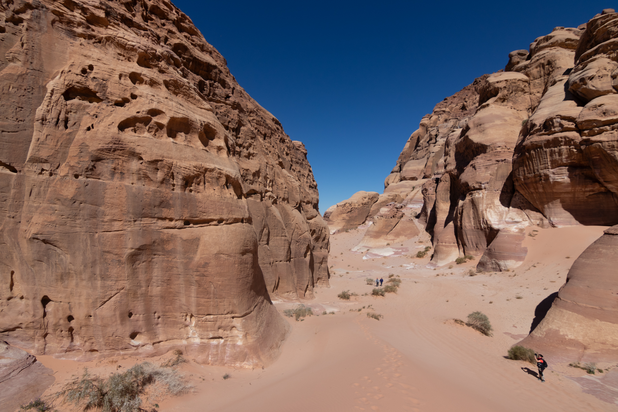 11 marzo, sabato Dopo la Notte magica e fotogenica in cui non ho quasi chiuso occhio, mi alzo che sta iniziando ad albeggiare e continuo l’opera immortalando il panorama, questa volta con entrambe le Canon. Poi a colazione prima di imbarcarci sul nostro Pick-Up “personale”. Alle 9 di mattina fa ancora fresco! La prima tappa sarà l’arco di roccia di Um Fruth che il pomeriggio precedente era una bolgia, questa mattina no, sarà vivibile e fotografabile. Simpatico l’intermezzo del bambino arabo che gioca a pallone con i turisti sotto l’arco. Un tea con biscotti nella tenda beduina e qualche acquisto di souvenir prima di ripartire verso sud. Salam ci ha informati, viaggeremo per circa 40minuti sino a quello che chiama “Withe Desert” così Assunta si accomoda in cabina mentre io, stoicamente, resisto sul cassone con la giacca a vento, accompagnato dalle fide Canon, sfidando il vento che a tratti alza mulinelli di sabbia. Cammelli e qualche uccello sono gli unici incontri che facciamo lungo questo tragitto al termine del quale Salam ci indica il percorso. “Sono circa 15 minuti di salita, poi prendetevi tutto il tempo che vi serve” dice. Prendiamo anche l’acqua mentre arriva una seconda Jeep con quattro spagnoli con i quali iniziamo l’arrampicata. La salita è breve, ma farla sulla sabbia fine non è una passeggiata. Lo spettacolo che ci si presenta una volta raggiunti i terrazzamenti rocciosi vale tutto lo sforzo fatto: sotto di noi si estende il deserto in un panorama che si estende per chilometri, sin oltre alle montagne che si alzano dalla sabbia. Montagne e sabbia a perdita d’occhio! Rocce colorate scavate dal Vento. Salam mi ha tranquillizzato (od almeno ci ha provato) “Non ci sono serpenti, fa troppo freddo”, ma lo Stellagama Stellio di circa 40cm che prende il sole lo troviamo, fortunatamente per me, ha le zampe 😊 Ci siamo presi il tempo che volevamo così, salutati gli spagnoli, scendiamo, per rocce ruvide e sabbia morbida, sino alla Jeep, con la quale, dopo un paio di foto ricordo, ripartiamo attraversando un’altra porzione di deserto diretti al villaggio di Wadi Rum, da dove, ripresa la macchina partiremo alla volta di Petra. Una serie di cantieri sulla Highway ci deviano e mi ritrovo così a percorrere una strada diversa da quella che avevo previsto. Anche l’albergo di Petra non è granché… “Luxury” solo di nome! Ci avevano detto che per cena non serviva prenotare, ma non avevano aggiunto che “sarebbe stato inutile perché non aprivano il ristorante solo per noi”. Ad ogni modo il ragazzo alla Reception è cortese e ci fornisce una caterva di informazioni, anche non richieste, ma utili nel complesso. Così, invece di cenare in albergo come sarebbe stata nostra intenzione siamo costretti ad uscire avviandoci alla ricerca di un ristorante… Il più vicino ci fa sentire spettatori di una barzelletta: appare deserto, con i camerieri seduti ai tavoli dell’ingresso che, come entriamo, scattano in piedi avvisandoci che “aprono alle 19.30”, guardo l’orologio e vedo che sono le 19.15 ma ci invitano a ripassare dopo l’orario di apertura! Noi obbediamo e ci passeremo davanti dopo….. dopo aver cenato bene al ristorante che troveremo 400 metri oltre.