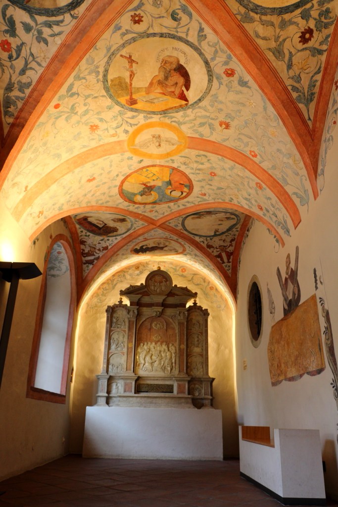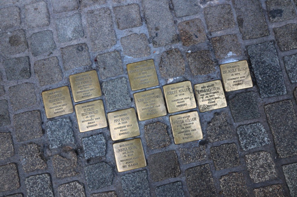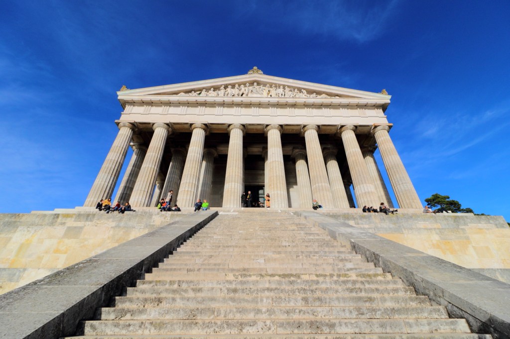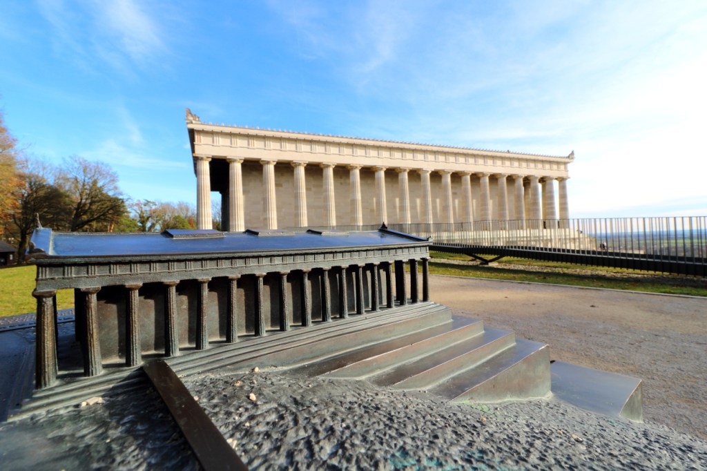 24.11 Sabato  Il mattino ha il sole in bocca, è una giornata splendida: Sole e cielo limpido! Per colazione troviamo una buona pasticceria esattamente all’opposto della rotonda che c’è nei pressi dell’albergo Conditorei CHOCOLAT.  Sarà una colazione “leggera” Cappuccino e Torta, non abbiamo prenotato e ci adattiamo ai “trespoli” vicino all’ingresso, prenotiamo però per il giorno seguente!  La splendida giornata ci convince a modificare il programma: andremo fuori città per visite panoramiche.  Dopo 40 km siamo al Burg PRUNN, piccolo e bello, arroccato su uno spuntone di roccia 70m piu in alto del fiume Altmhul; il posteggio è a 100m dal castello ed una leggera porta all’ingresso. Apre alle 10 e siamo arrivato mezz’ora prima, approfittiamo quindi per ammirare il Castello da fuori ed il panorama sulla vallata, nel frattempo arriva la Giuda/Custode che apre, verifica i biglietti e farà da guida… solo per noi.  La visita dura poco meno di un’ora, attraverso 3 piani del castello, e le relative stanze, ci fornisce spiegazioni sulla storia del castello ed usi dell’epoca. Terminata la visita risaliamo al posteggio ammirando ancora il panorama. La tappa seguente è l’Abbazia di Weltenburg. L’ho vista in fotografia, sorge su una stretta ansa del Danubio prima delle pareti di roccia. Per non allungare il percorso con il rischio di perdere tempo, dato che non sapremo come sarà la giornata, decido di non raggiungere proprio l’Abbazia per visitarla, ma di limitarmi ad andarla a vedere dal lato opposto del fiume quello piu scenico ed in battuta di sole. Arriviamo prima di mezzogiorno, una stretta strada costeggia il fiume per 3 km e trovo due piccoli spiazzi dove lasciare la macchina per scendere sulla sponda per … fotografare. Un venticello fresco ci accompagna in una giornata limpida e soleggiata. È proprio una bella ambientazione, passano anche alcuni canoisti che, remando, ci salutano.  40 km oltre, lungo il Danubio c’è il WALHALLA, la nostra prossima meta, dove arriviamo attorno le 13.30.  Sembra un “Tempio Greco” quasi bianco, circondato da alberi ed affacciato dal fianco di una collina, lo si distingue da lontano.  In macchina si arriva ad un posteggio e da qui una breve passeggiata tra alberi conduce allo spazio erboso che lo circonda. Poca gente, poche macchine tanto sole e bel paesaggio verso sud …per chilometri,  piu in basso scorre il Danubio il fiume che ho già visto molte volte, in cinque nazioni e tre capitali,  ogni volta mi affascina.    Walhalla, un nome mitologico: è un tempio neoclassico. All’interno una unica enorme sala con i busti in marmo bianco dei personaggi che hanno fatto la storia della Germania, quelli di cui la Germania è orgogliosa, alcuni di loro hanno influenzato anche la nostra storia e non solo quella. Un’unica stanza e da ogni punto è possibile vedere, tutti assieme, questi personaggi, sono Donne e Uomini.    Donne e Uomini come quelli che, assieme a loro bambini e bambine iniziano ad arrivare in visita al monumento.  Il Walhalla non celebra dei fatti, ricorda ed onora i personaggi.  Ripenso al Pantheon di Parigi, ma qui lo percepisco di più, mi trasmette un senso di “unicità”, sono tutti insieme, al Pantheon sono sparsi in diverse sale;  ed in Italia, dove e come come li ricordiamo i Nostri?   Mentre penso a questo mi vengono in mente alcune parole della poesia di Schiller, “Alle Menschen werden Brüder …. ” c’è anche il suo busto,  non centra con l’ambiente, ma penso al significato della poesia, dell’Inno ed a quanto siamo lontani da quel testo. La poesia è stata messa in musica diventando parte dell’inno alla Gioia, poi e diventato l’Inno di una comunità ancora lontana dall’esistere per i personalismi di troppi che remano in direzioni opposte. Fuori dall’Italia questo inno l’ho sentito spesso, in Italia raramente pur essendone un membro fondatore, da noi basta l’Inno d Mameli, per quelli che lo cantano agli incontri sportivi, spesso intonando solo qualche strofa o suono, più spesso limitandosi al “Si!” Al Walhalla continua ad arrivare gente, è sabato pomeriggio, una splendida giornata di sole, alcuni erano già qui, a fare “picnick” sui gradoni di marmo, altri sono arrivati dopo di noi, molti ancora stanno arrivando: è ora di lasciare spazio anche a loro, liberiamo il nostro posto macchina per altri visitatori, il posteggio ora è pieno e continuano a salire macchine, verso il “Walhalla dei Tedeschi”. A Ratisbona posteggiamo questa volta nei pressi del Ponte di Pietra, ho la sfacciata fortuna di trovare un posteggio libero, non a pagamento, proprio davanti ad una stazione di polizia.  Inizia la scoperta della città. Percorriamo i 200metri che lungo un viale scenografico, lastricato in cubotti di pietra che conduce al “Ponte di Pietra”, uno dei punti più famosi di Ratisbona, sono innamorato del Ponte Carlo di Praga, e mi aspetto la stessa solennità, resto invece deluso nel trovare un “Bel Ponte”, che dicono risalire al 12’ secolo,  restaurato da poco in Granito, ma in uno stile che, pur mantenendo le linee essenziali di quello originale, pare il risultato di un progetto “minimalista”:  Linee dritte e regolari parapetti con morbidi ondeggiamenti, pavimenti perfettamente posati, con lati leggermente lavorati per far pensare ad un antico, di antico non ha nulla.   La vista sulla città quella si è bella. Ed attraversata la BruckTurm si prosegue verso il centro storico, qui ci “perdiamo” volentieri tra Negozi, Chiese, Piazze, Caffè, Palazzi, Pasticcerie, sino ad inciamparmi su undici Stolpersteine, da noi si chiamano Pietre d’Inciampo; sono quelle “cose” che qualche cretino sradica, quelli che, probabilmente, si sarebbero fatti abbindolare da un Austriaco Basso e Moro che di Ariano non aveva molto, ma che parlando ad altri, non usi a pensare con la propria testa, gli ha raccontato cose che questi volevano s