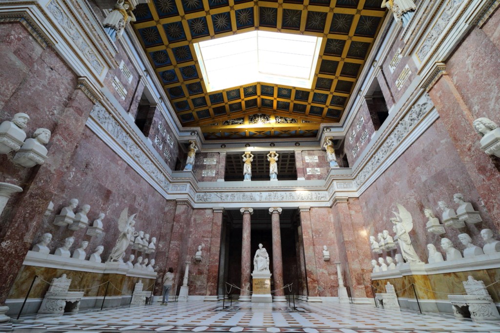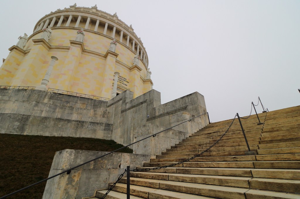 22.11  di Venerdì,  arrivando da Ingolstadt ho programmato gli ultimi appuntamenti nei pressi di Ratisbona e l’arrivo nel primo pomeriggio mi permette di andare  a visitare una delle “attrazioni” gia prima dell’ultimo impegno lavorativo.  Una giornata “muffosa”: un misto di nuvole pesanti e foschie oltre a qualche goccia di pioggia. Seguo il navigatore in direzione Kelheim e decido che con la nebbiolina che c’è non vale la pena deviare verso Weltenburg, la rinvio a domenica e proseguo alla volta della Befreiungshalle; appare davanti a noi attraversando il ponte, chiara sopra collina, subito sopra cominciano le nuvole, basse e grasse: scenica!   Ancora due tornanti e ci siamo: il posteggio è deserto, solo noi ed altre due macchine, una sta partendo, sono le 14.30 e chiuderà alle 16 con l’orario invernale. In biglietteria chiedo informazioni sulla Combi-Karte, il biglietto unico che permette di l’ingresso i nostri tre obiettivi: Befreiungshalle, Walhalla e Burg Prunn, costano 11 euro l’uno e li acquistiamo.  L’addetta chiede “chi di noi di parla meglio il Tedesco” e ci fornisce altre informazioni poi ci saluta in spagnolo, 😊 ci ha scambiati per Spagnoli 😊     …. VALE !  Hasta Luego. Una breve passeggiata di 200 metri, ma l’arietta che tira e l’umidità penetrano, attraversiamo il parco che circonda il monumento che sovrasta la cittadina e da un angolo tra alberi, nonostante la nebbia, scorgiamo in basso il Danubio scorrere tra due pareti di roccia.  Più avanti il “Panettone” a forma di Befreiungshalle:  grande, chiaro, pietroso, bello;   saliamo la scalinata, passiamo i tornelli e ci troviamo nella sala circolare, lungo tutto il perimetro coppie di angeli in marmo bianco, sostengono gli scudi con  i nomi delle battaglie, alle loro spalle la “Galleria”, sopra agli angeli, sulle pareti l’elenco dei comandanti delle varie regioni, più in altro ancora le città tedesche:  è la “Sala della Liberazione”.     Napoleone ed i francesi devono avergli rotto abbastanza le “Scatole” per dedicare questo monumento alla Liberazione. Sono tedeschi e le cose le fanno bene anche belle! Dalla “Galleria” con 80 gradini raggiungiamo la prima terrazza, quella interna, altri 80 portano piu in su; ho visto da fuori dove arriva e le mie “vertigini” suggeriscono di accontentarmi della prima tappa. Percorriamo tutta la terrazza circolare ammirando la sala dall’alto per poi ridiscendere.   Resta il tempo di leggere alcuni nomi che riportano a reminiscenze di storia e di vecchie letture prima di risalire in macchina, il lavoro mi chiama.   Dopo il cliente la tappa successiva sarà l’albergo dove alloggerò, il DREAM INN HOTEL in periferia di Ratisbona, economico, con un buon posteggio e, per chi vuole, l’autobus n. 5 che porta in centro citta ogni 20 minuti nei feriali, ogni ora la domenica.  Passato questo traguardo intermedio ci aspetta Ratisbona, quindi, scaricate le valigie via, verso il posteggio nella Wohrdstrasse, il più vicino al centro, posteggio a pagamento per una sosta massima 3 ore, ma è quasi sera oltretutto… il parchimetro è guasto!        Attraversiamo la città e come nostra abitudine in questi viaggi vogliamo cenare presto per non avere problemi di affollamento sfruttando il tempo seguente per visite. So già dove andare a Cena. Attraversando la citta diretti al ristorante, incontriamo una manifestazione di Curdi, quel popolo abbandonato dal mondo, così come lo è stato nel 1959 il Tibet e ad inizio del ‘900 gli Armeni, come altri popoli,   temo non saranno gli ultimi.  Arriviamo quindi al ristorante MESOPOTAMIA: Cucina Curda!  …che caso!  Molto accogliente, splendide fotografie alle pareti, 2 camerieri cortesi e pazienti, non abbiamo prenotato e ci conducono all’unico tavolo ancora “libero”, ma in una buona posizione. Siamo pronti, liberiamo la curiosità e diamo sfogo al nostro istinto, quello di provare piatti nuovi!   Oltre alla cucina Curda c’è anche una offerta Vegetariana e siamo curiosi!  Iniziamo con due Antipasti diversi e con due secondi diversi, per bere restiamo sul classico: Birra Scura!  La cucina è deliziosa, trovo delle similitudini con alcuni piatti che ho provato a San Pietroburgo in un ristorante Georgiano,  Gli “involtini in “Foglia di Vite” mi ricordano alcune “Sarmale” che ho provato in Romania ma che li erano fatti con “Verza”, la serata procede gustosa per terminare il dolce, un’apoteosi chiamata: Baklava! Appagati ed esauditi nel nostro desiderio di una buona cena, faremo la prima conoscenza con la città scattando le prime fotografie.   Arrivati al Duomo, ci stupiamo di trovarlo aperto, son quasi le 21 e cogliamo l’occasione al volo: oggi sarebbe stato il compleanno di mio padre, abbiamo colto l’opportunità e siamo stati premiati: è in corso una veglia di preghiera, la “Nacht der Licher”  La chiesa è gremita di Bambini, Ragazzi, Adulti, con lumini in mano, alcuni in piedi, altri seduti a terra su coperte e stuoie, la chiesa è illuminata solo da lumini, altri lumini circondano l’altare… affascinante!    Vorrei ma mi trattengo… vorrei Fotografare, ma mi dico No!   Respiriamo l’atmosfera, poi proseguiamo, farò ancora qualche foto prima di raggiungere il posteggio ed in macchina rientrare ed andare a nanna, è stata una giornata intensa e domani… è un altro giorno.