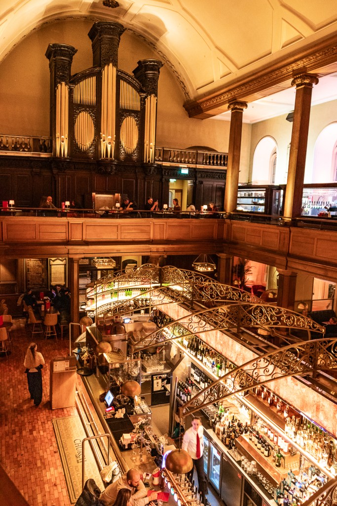 poi si è fatta ora di cena e, sempre camminando, attraversiamo Temple Bar e l’O’Penny Bridge, raggiungendo l’area commerciale di Mary Street, diretti al The Church, un Pub/ristorante ricavato, come dice il nome, in una chiesa sconsacrata. Ceniamo nel ballatoio, sopra il salone con il banco bar; là, dove c’era l’altare, ora è l’area del palco dove suonano e ballano, dalla parte opposta, al piano del ballatoio c’è l’organo, credo restaurato, che decora la parete; il menù un po’ povero, la Smithwick è buona, la serata gradevole.
