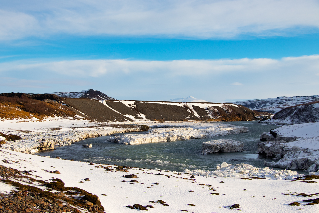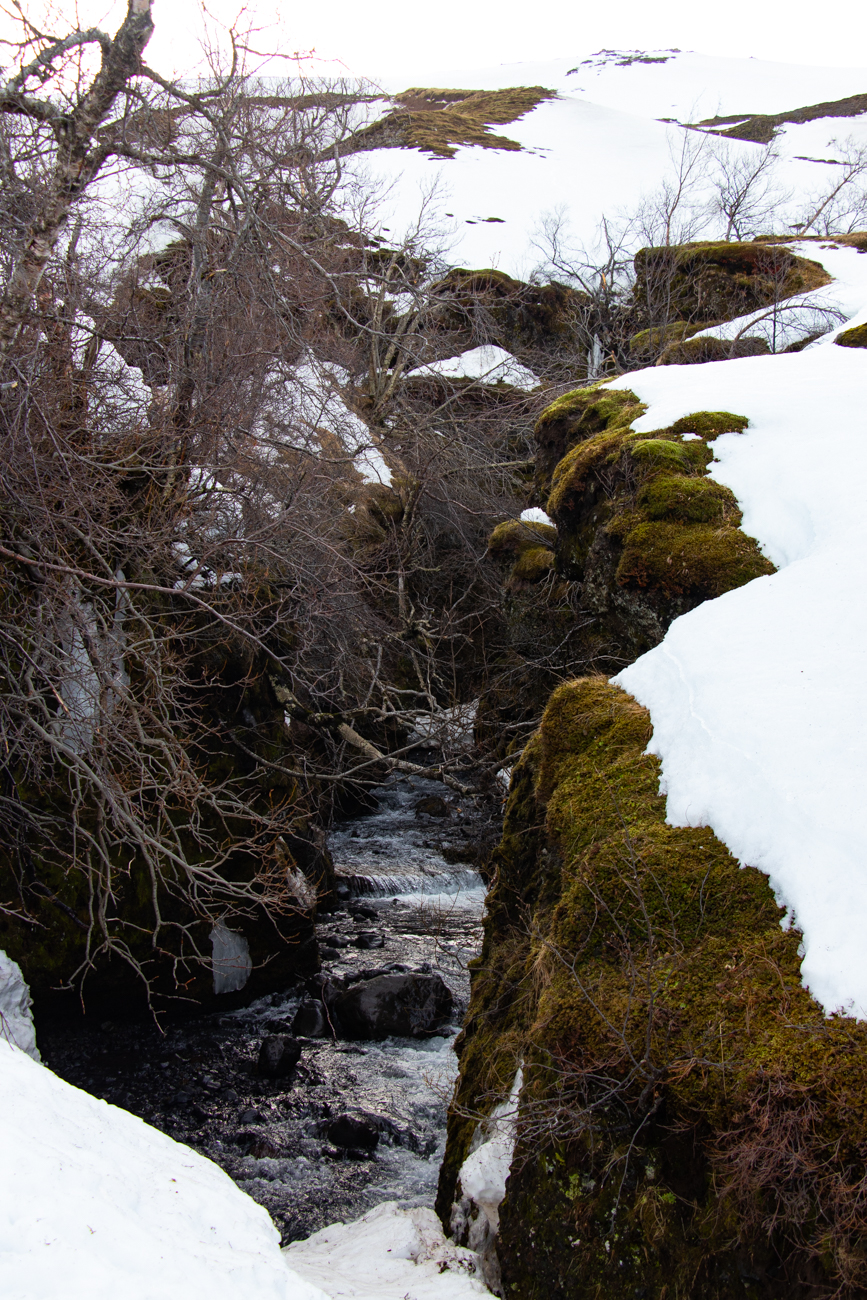 Rientrati sulla F249 la percoriamo per altri 3km sino al posteggio da cui parte il sentiero per Nauthusagil, attorno un paesaggio stupendo. Lasciata la macchina e proseguiamo a piedi su neve ghiacciata, nel vento, in un sole abbagliante. Assunta lascia i ramponi in macchina al riparo dal vento e mi segue con il suo passo verso l’imbocco del Canyon. Raggiunta l’imboccatura mi rendo conto che non è sicuro accedervi ora, nonostante il percorso all’interno sia attrezzato. Per entrare dovrei fare un salto di circa 1,5/2m scendendo sul greto del torrente, poi camminare nel torrente stesso prima di raggiungere il percorso attrezzato, nulla di difficile se avessi i menischi in ordine, ma il vero problema sarebbe poi risalire, senza appigli solidi, il dislivello di neve che tra poco verrà ammorbidita dal sole, decido allora di rinunciare e rientrare verso l’altra cascata più semplice. Nel frattempo, Assunta, iniziato il percorso sul ghiaccio compatto avanza con circospezione, rallegrandosi quando le dico “meglio di No!”