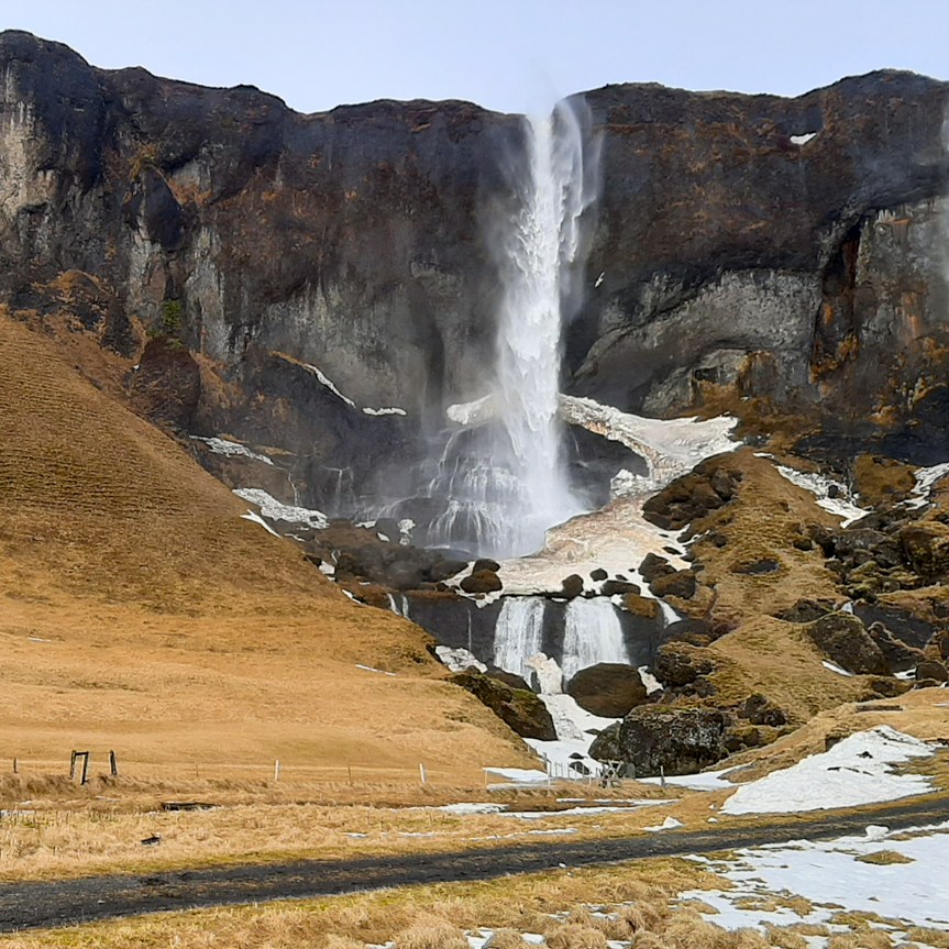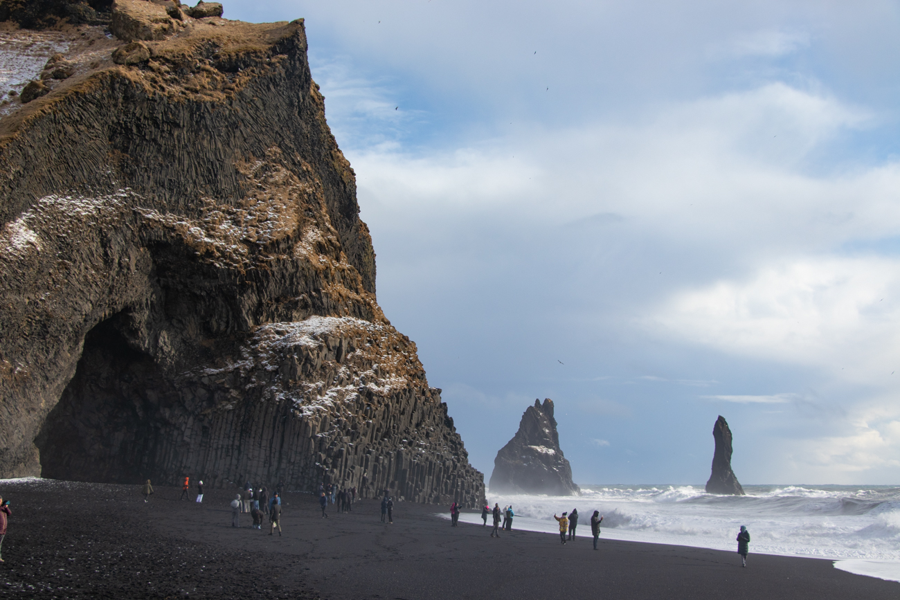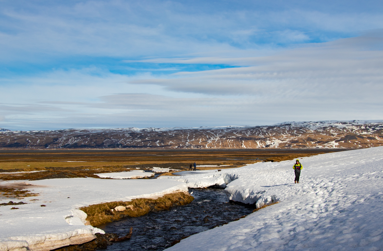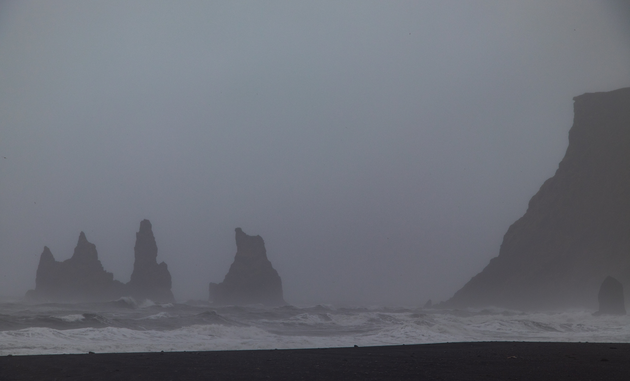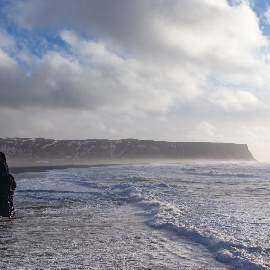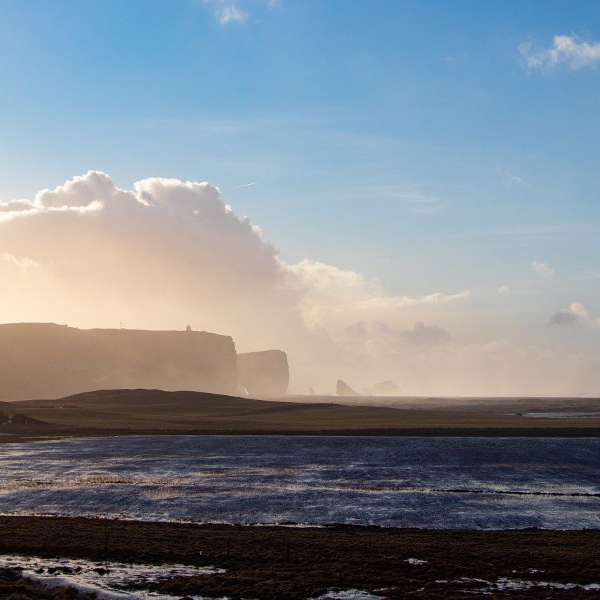 11 Marzo Vik-Skaftafell, 173km. – Islandic Met Office è stato di Parola! Ha “ventato e diluviato” sino alle 5 di mattina, poi la pioggia è cessata, si intuisce che la giornata inizia bene, con poche velocissime nuvole e cielo sereno, permane il vento! Salutiamo Yeva, che ha preparato la colazione, ma deve scappare subito, chiudiamo i bagagli e come esco a caricare la macchina noto come il promontorio del Faro si stagli nitido all’orizzonte così: ancora una passeggiata per qualche foto e poi dovremo partire diretti a Skaftafell dove vorrei arrivare presto per raggiungere la cascata od il ghiacciaio. Le previsioni danno meteo buono al mattino, nuvoloso il pomeriggio. Decidiamo di approfittare della mattina raggiunendo Dyrhlaey: posteggio, scogliera e poi ancora su al Faro. Il vento ha gonfiato ulteriormente il mare: osservare le onde che si infrangono sugli scogli ed ascoltare il vento che ci benedice con spruzzi salati è una sensazione entusiasmante. Poi si parte davvero.