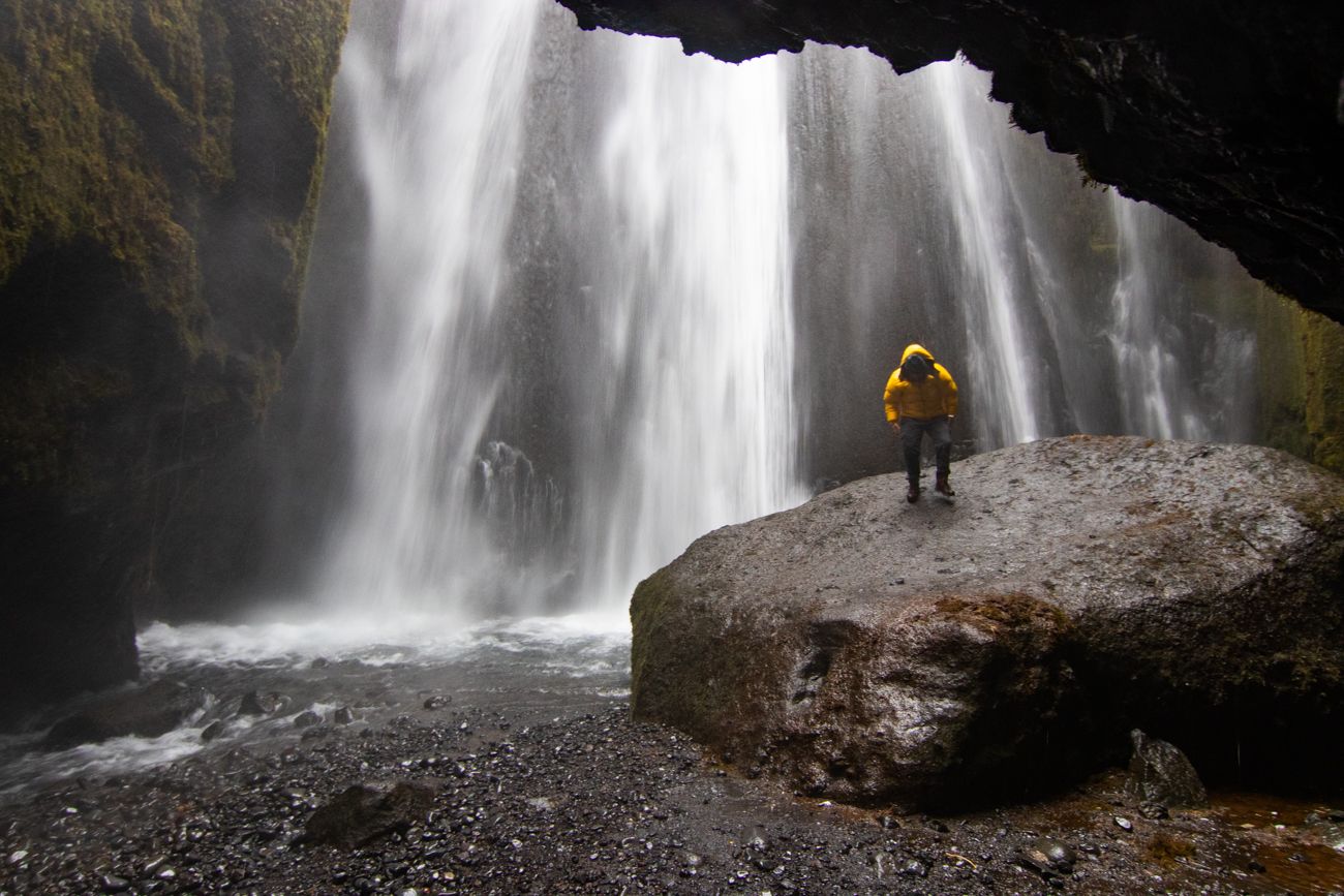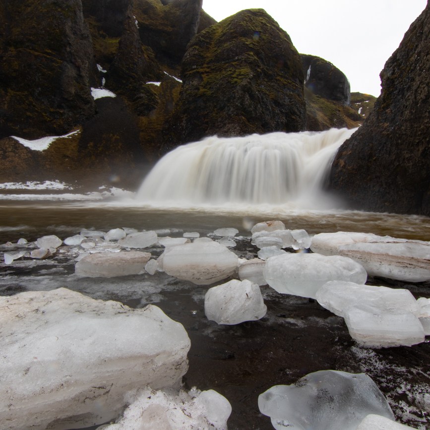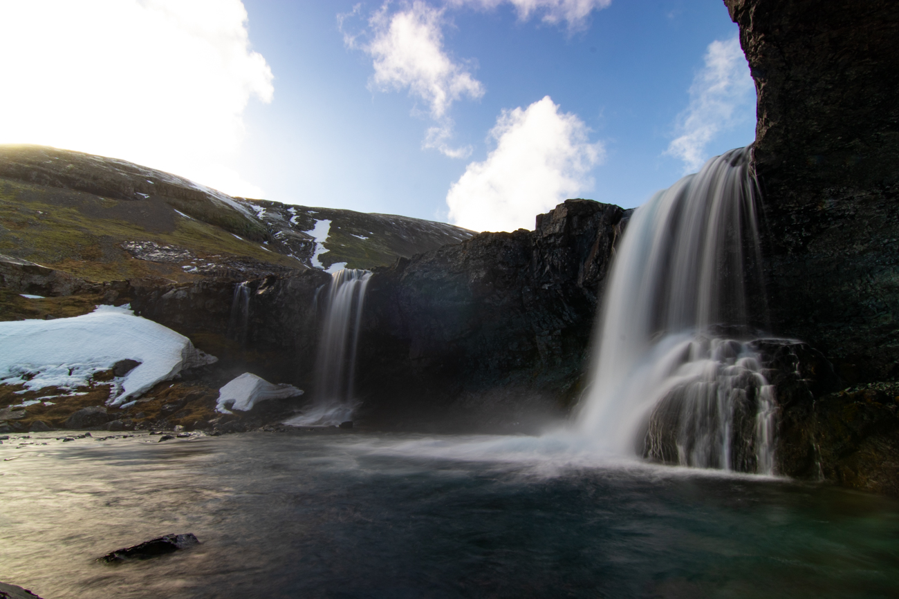 Gljufrabui dista pochi km, si trova nei pressi della strada asfaltata, si percorrono solo 50m da un comodo posteggio, per questo è purtroppo affollata! È molto particolare: vi si accede da una fessura nella roccia, stretta ed alta, sul fondo della fessura scorre il torrentello e bisogna risalirne il greto per entrare. Qualche equilibrista, molti con scarpe inadatte, passano sui pochi sassi usati per appoggio incrociando chi va in senso opposto e senza curarsi di agevolare gli altri visitatori, ne vedo uno che addirittura fa equilibrismo sui sassi con i ramponi ai piedi; io opto per indossare gli scarponi da montagna e camminare direttamente nell’acqua profonda pochi cm e sono subito all’interno. E’ un pozzo alto 10-15 m da dove l’acqua cade dalla somità, negli ultimi giorni ha piovuto e la portata è abbondante. L’andirivieni di visitatori è notevole, ma la sensazione che provo è un misto di Soddisfazione, Leggerezza, Gioia… “Caz..o!“, quanto vapor acqueo si deposita sulla lente da 77mm del mio Tokina: sono costretto a fare la maggior parte delle fotografie con il cellulare che si sporca meno. Quando esco sono euforico e felice, ricevo i primi regali da questo viaggio! Assunta non si è fidata ad entrare preoccupata dal breve tratto di ghiaccio prima dell’apertura nella roccia e dall’andirivieni, in equilibrio precario, attraverso una nuvola di vapore e schizzi che arrivano da tutte le direzioni.