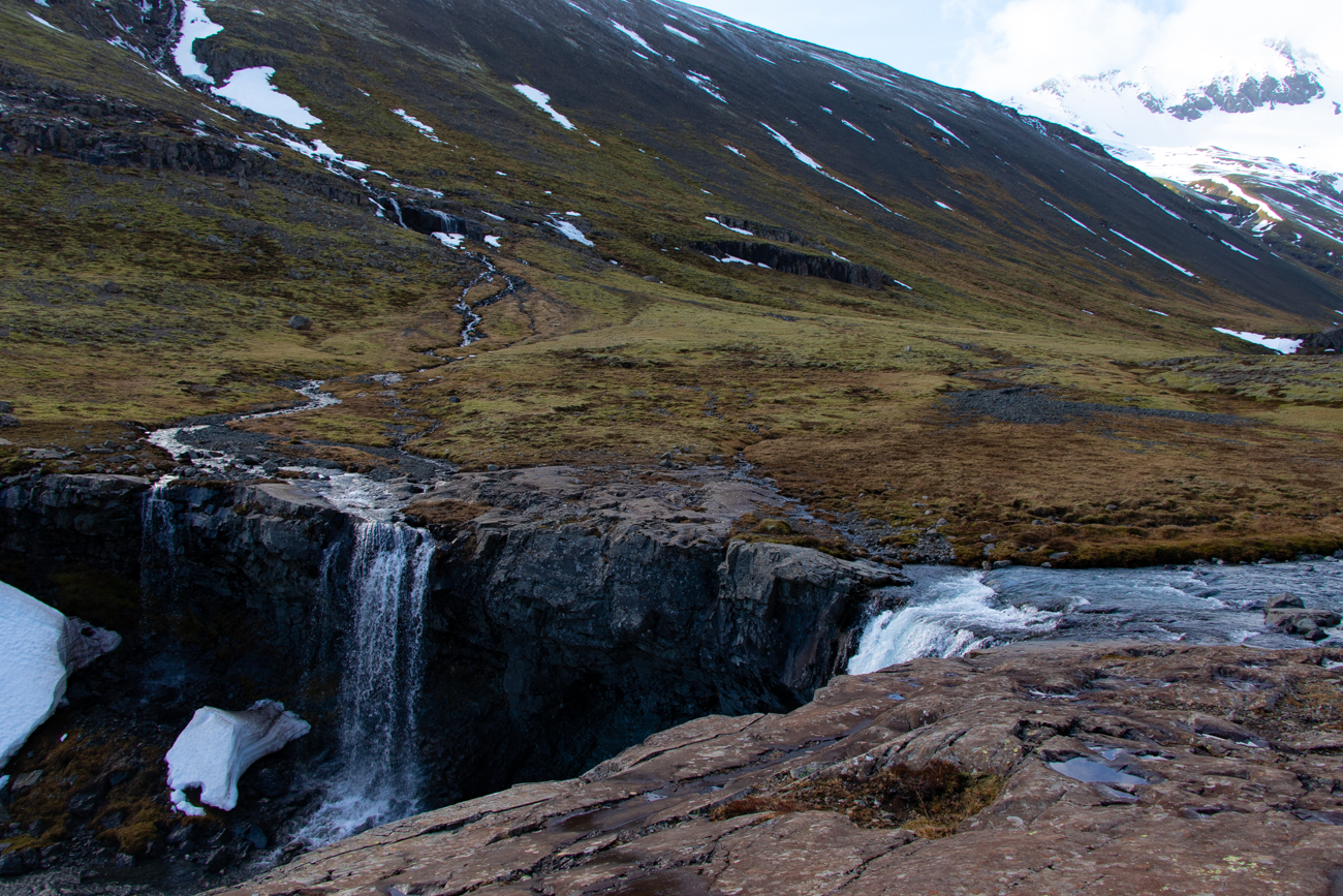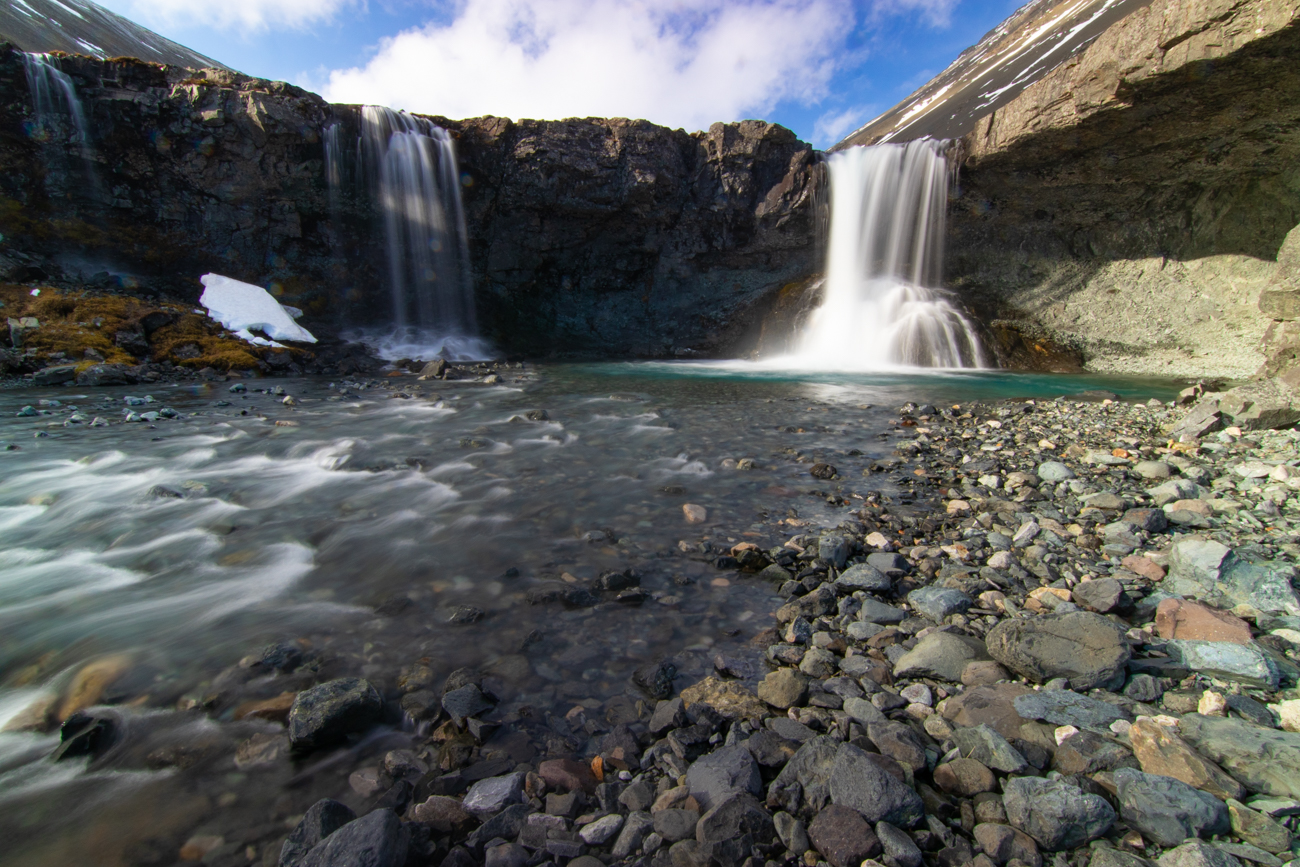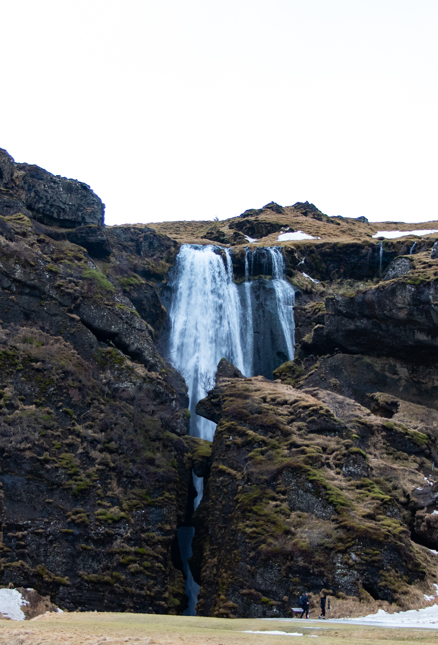Gljufrabui dista pochi km, si trova nei pressi della strada asfaltata, si percorrono solo 50m da un comodo posteggio, per questo è purtroppo affollata! È molto particolare: vi si accede da una fessura nella roccia, stretta ed alta, sul fondo della fessura scorre il torrentello e bisogna risalirne il greto per entrare. Qualche equilibrista, molti con scarpe inadatte, passano sui pochi sassi usati per appoggio incrociando chi va in senso opposto e senza curarsi di agevolare gli altri visitatori, ne vedo uno che addirittura fa equilibrismo sui sassi con i ramponi ai piedi; io opto per indossare gli scarponi da montagna e camminare direttamente nell’acqua profonda pochi cm e sono subito all’interno. E’ un pozzo alto 10-15 m da dove l’acqua cade dalla somità, negli ultimi giorni ha piovuto e la portata è abbondante. L’andirivieni di visitatori è notevole, ma la sensazione che provo è un misto di Soddisfazione, Leggerezza, Gioia… “Caz..o!“, quanto vapor acqueo si deposita sulla lente da 77mm del mio Tokina: sono costretto a fare la maggior parte delle fotografie con il cellulare che si sporca meno. Quando esco sono euforico e felice, ricevo i primi regali da questo viaggio! Assunta non si è fidata ad entrare preoccupata dal breve tratto di ghiaccio prima dell’apertura nella roccia e dall’andirivieni, in equilibrio precario, attraverso una nuvola di vapore e schizzi che arrivano da tutte le direzioni.