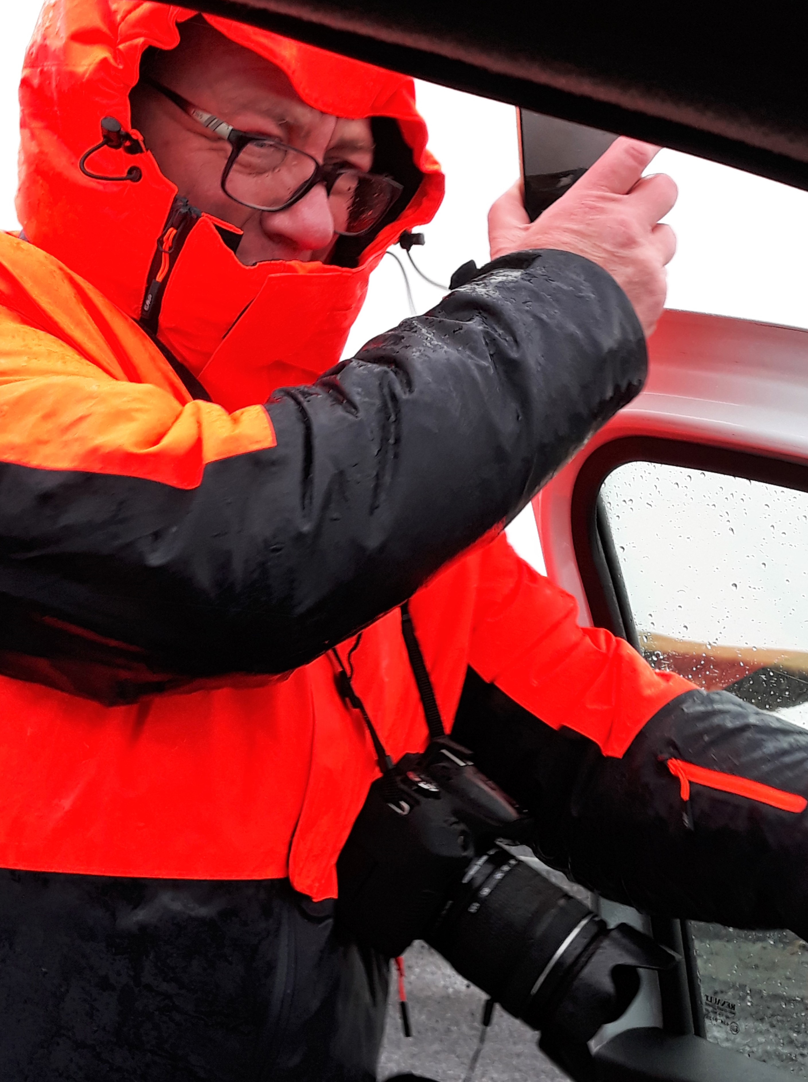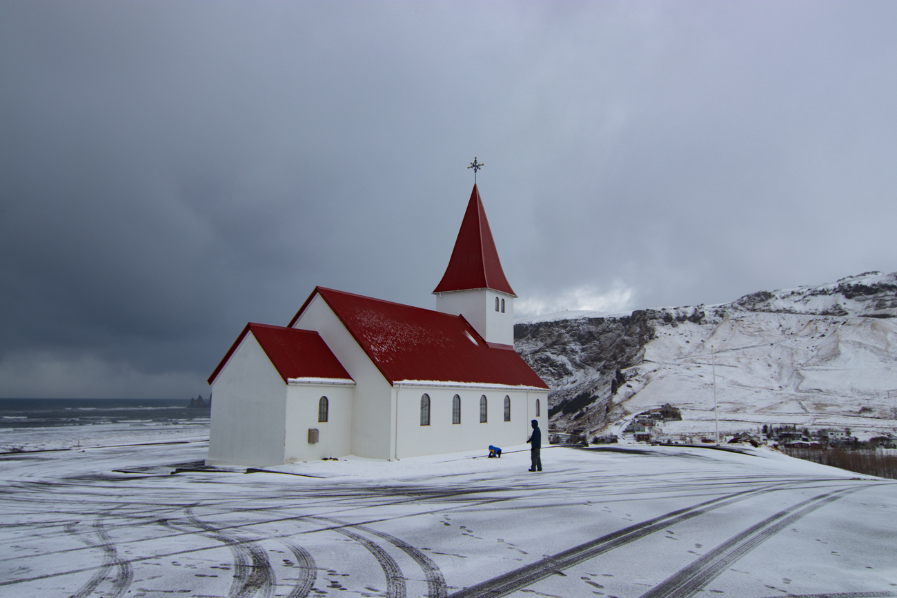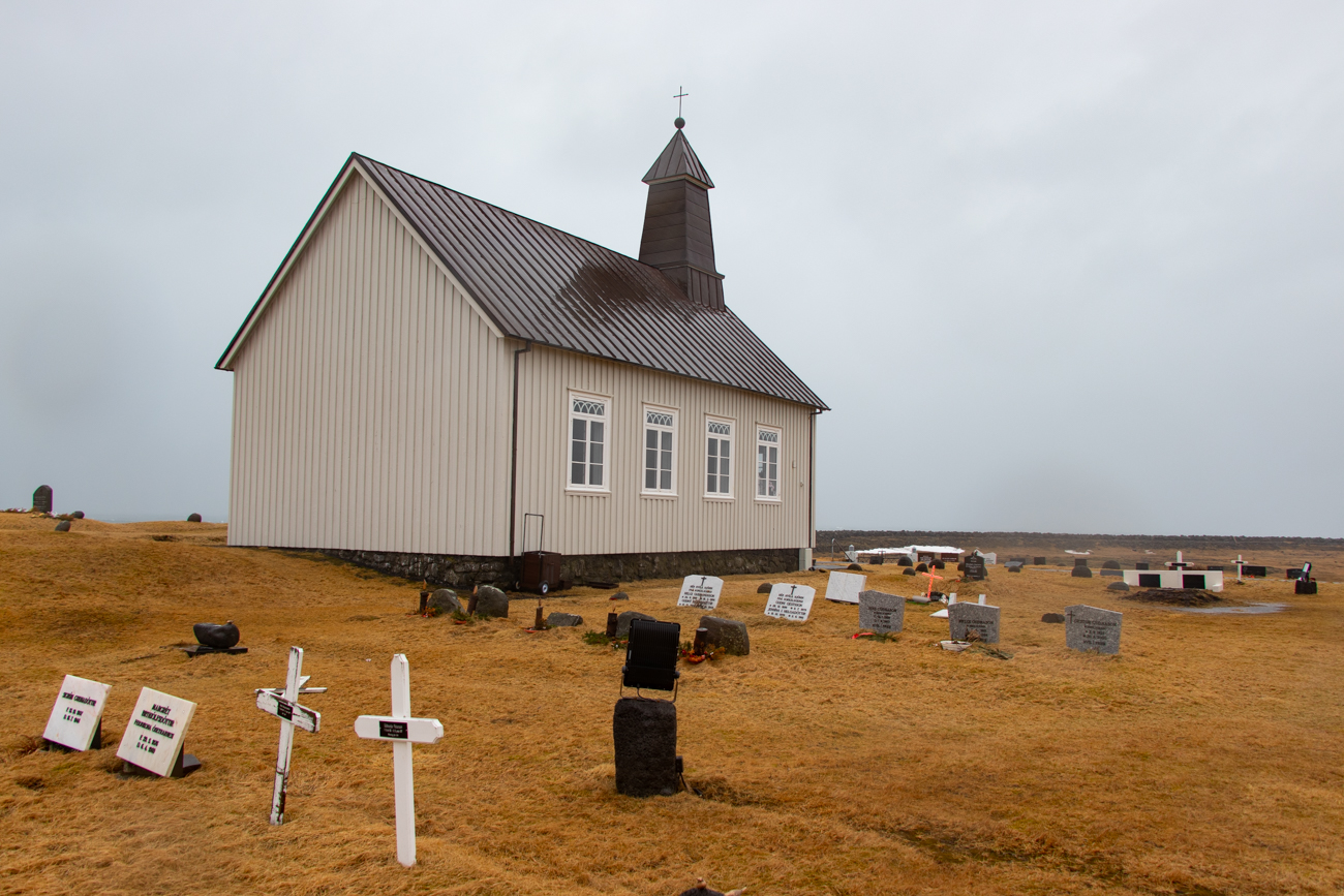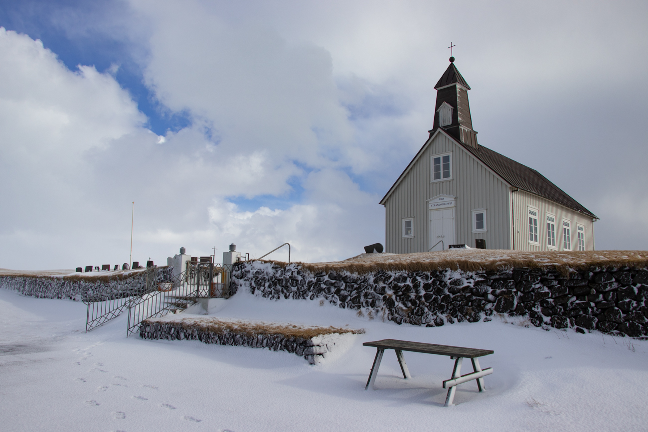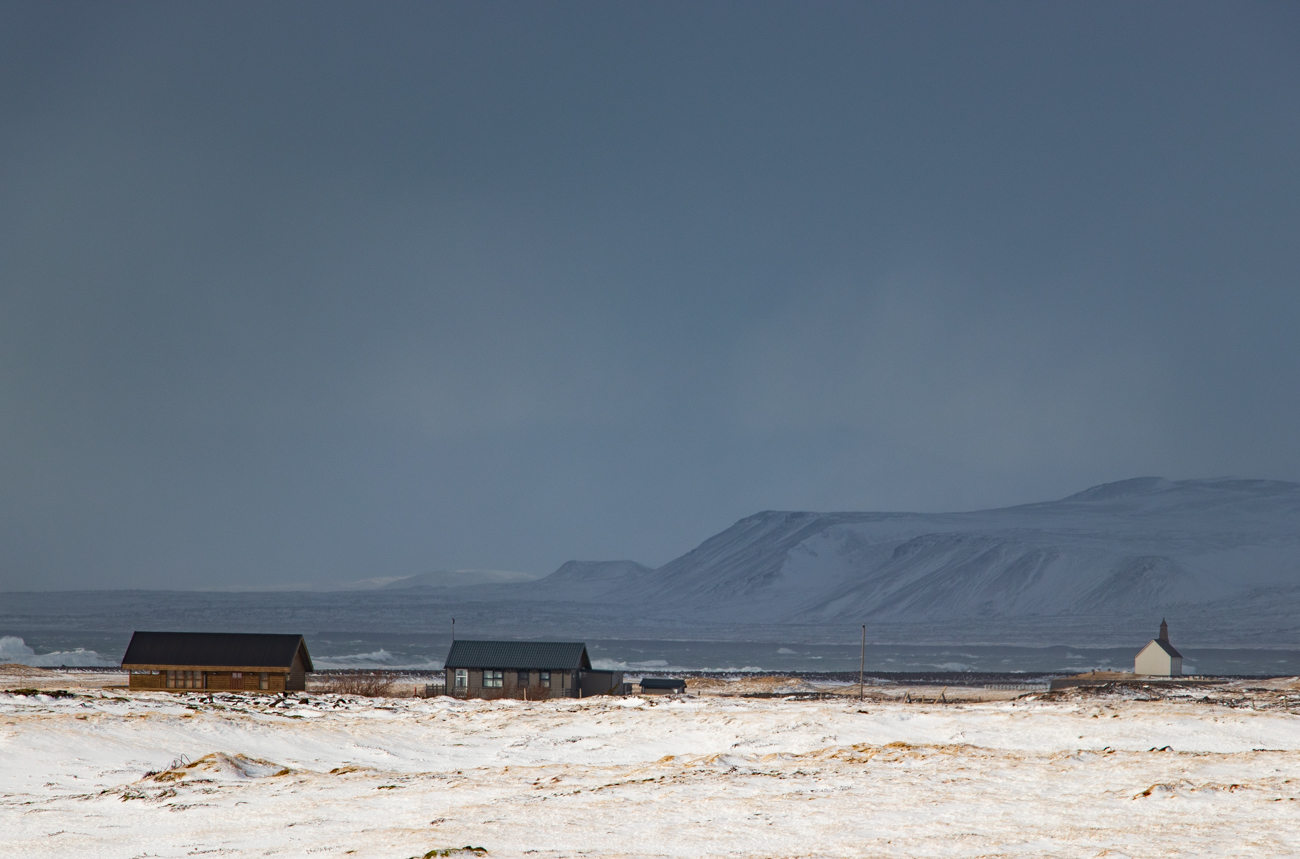 Scossoni del vento a parte, la macchina ha dei problemi: le sospensioni trasmettono vibrazioni al volante e non capisco se derivano dall’asfalto o dagli pneumatici. Poco prima della 10 arriviamo a Grindavik e ci fermiamo per acquistare qualche panino al supermercato “NETTO” che sta aprendo, proseguiamo poi “con la pioggia e con il vento” …. non sino ad un convento, ma ad una chiesetta che scorgiamo da lontano, poi, una volta trovata la deviazione giusta ne raggiungiamo l’ampio posteggio: è StrandarKirkja! “Occhio agli scherzi di Eolo!” Posteggio “Prua al Vento”, indosso il gilet, poi la giacca impermeabile e scendo nella “Pioggia Orizzontale”.