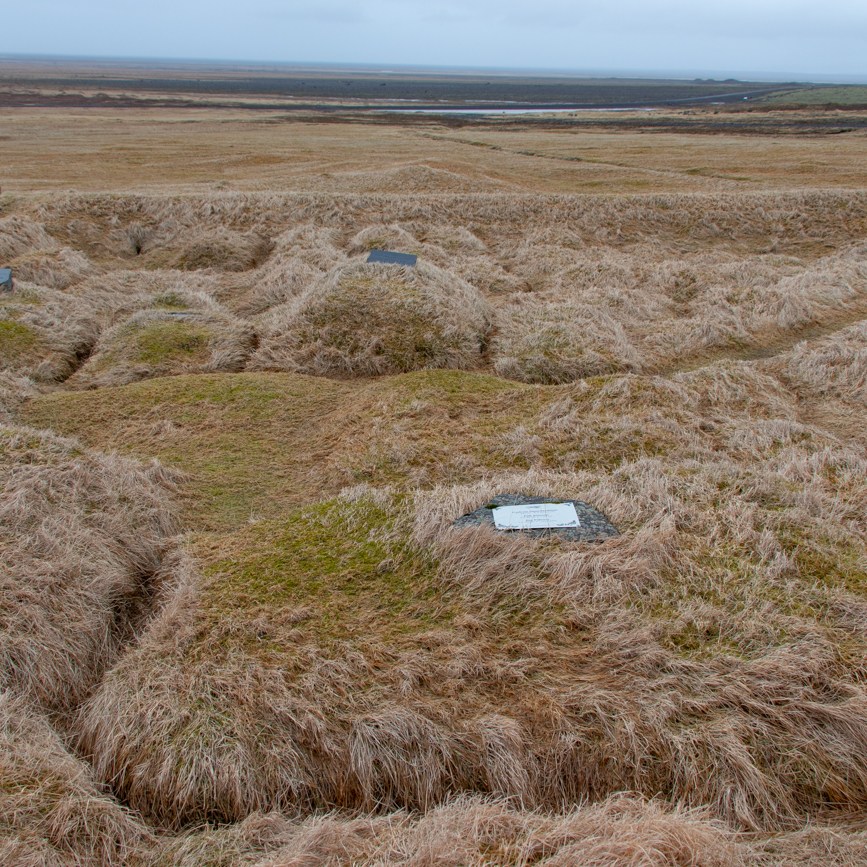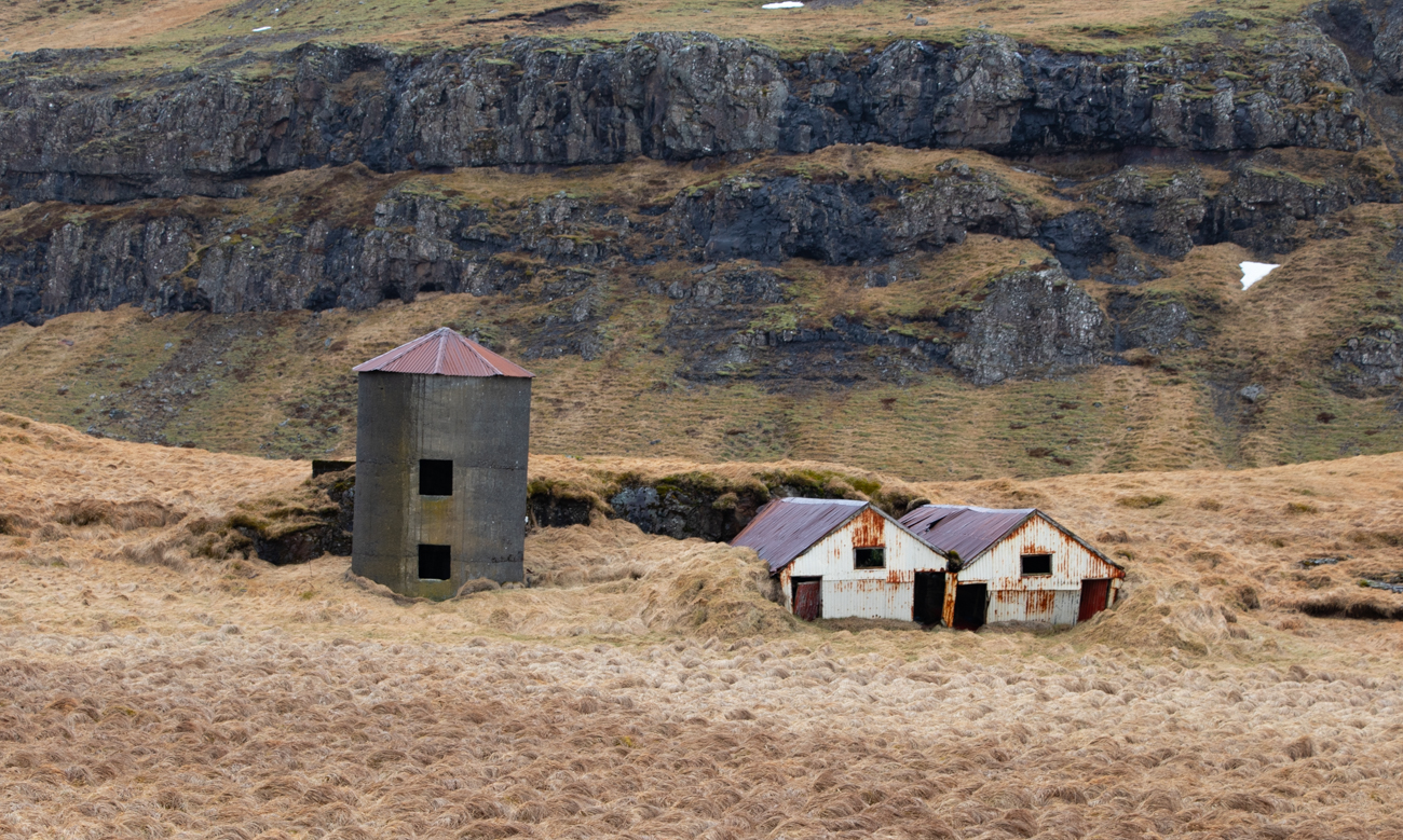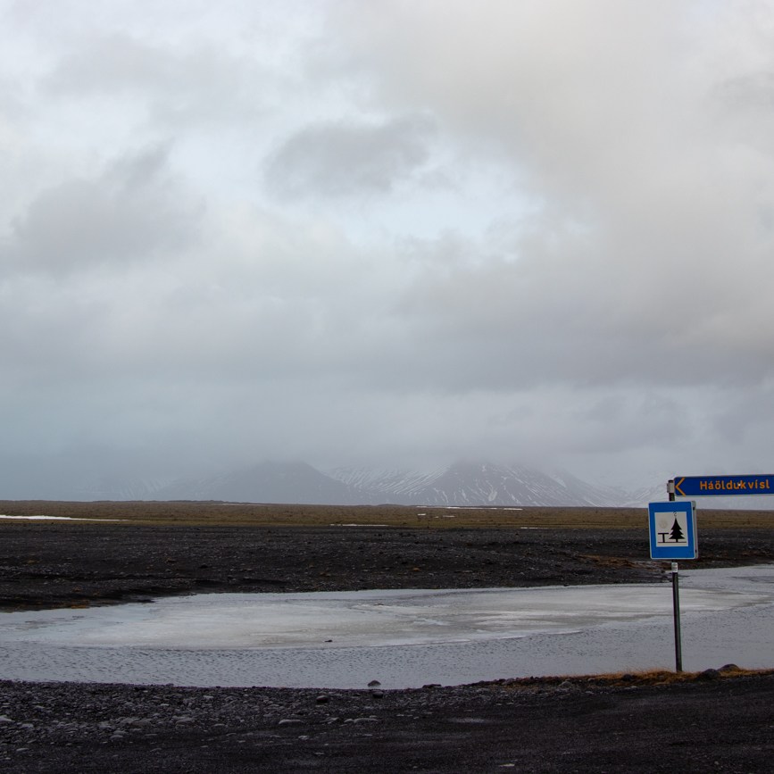 Verso le 14.00 raggiungiamo l’Hotel Skaftafell. Abbiamo abbastanza tempo per la sgambata al vicino ghiacciaio Svinafell. Potremmo partire dal sentiero alle spalle dell’albergo, ma preferiamo raggiungere il posteggio in macchina da dove, calzati gli scarponi, in 10 minuti superiamo la morena del ghiacciaio. Suggerisco ad Assunta di salire subito al punto più alto facendole evitare un passaggio poco consistente su cui mi sono avventurato, poi da solo, inizio la discesa. In pochi passi comprendo cosa un cartello intendesse segnalando “poca consistenza di parte delle morene” e “camminare con passo leggero”: in alcuni punti si sprofonda nella sottile ghiaia melmosa, problema che si riduce con alcune accortezze, appunto, da ”Passo Leggero” oppure camminando sui rari sassi di dimensione maggiore. È la prima volta che raggiungo un fronte di ghiacciaio così, sino ad ora avevo visto solo il Grossglockner ed il vecchio ghiacciaio sul Monte Canin, qui è un altro mondo! I riflessi azzurri mi affascinano, fotografo e scendo ancora facendo attenzione al terreno ed alla sua consistenza per fermarmi quando si ammorbidisce ulteriormente nei pressi del pelo d’acqua. Mi volto per verificare dove si trova Assunta e mi rendo conto che sta arrivando un ulteriore fronte di pioggia, così inizio la risalita dopo aver avvisato Assunta di avviarsi e la raggiungo proprio mentre inizia a piovere, per fortuna debolmente e senza vento. Raggiungiamo la macchina che sta ancora piovigginando, ma è presto per rientrare, decidiamo così di proseguire oltre, nella direzione che prenderemo il giorno seguente per visitare un sito che ho letto essere “storico”. Non ci sono indicazioni, ma l’ho segnato sul mio GPS e sulla mia mappa così prima di raggiungere Hof imbocco una deviazione a sinistra, percorro poche centinaia di metri sino ad un piccolo spiazzo sotto il fianco della montagna e posteggio, da qui si vede uno dei rari alberi della zona ed attorno a questo si trovano le tracce di edifici ricoperti d’erba, di una chiesetta e del cimitero di Sandfell Öræfi.