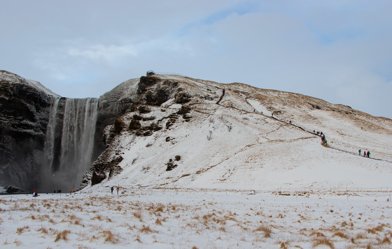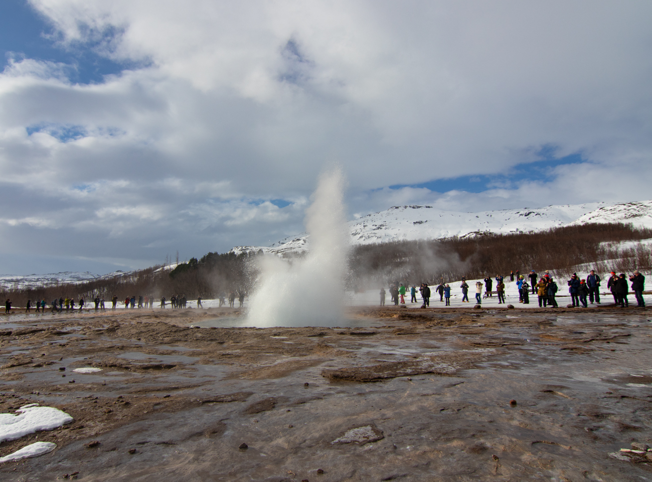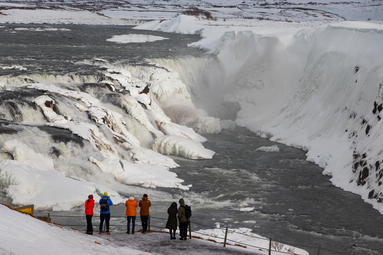 Un’oretta a Geysir ci basta per ammirare alcuni sbuffi del Gayser ed altri piccoli effetti geotermici nei dintorni, affollati di visitatori. Dista poco dal posteggio, percorriamo anche alcuni sentieri nei dintorni, poi ci concediamo un meritato panino ed un po’ di frutta prima di ripartire. Decidiamo di raggiungere subito l’Hotel Gulfoss per lasciare la valigia prima di riavviarci alla volta dellla famosa cascata e dopo soli 2 km siamo al posteggio principale, ghiaccio e neve per terra, cielo nuovamente rannuvolato nel mezzo uno scenario strabiliante… Quanta gente anche qui! Immagino come possa essere affollato in estate.