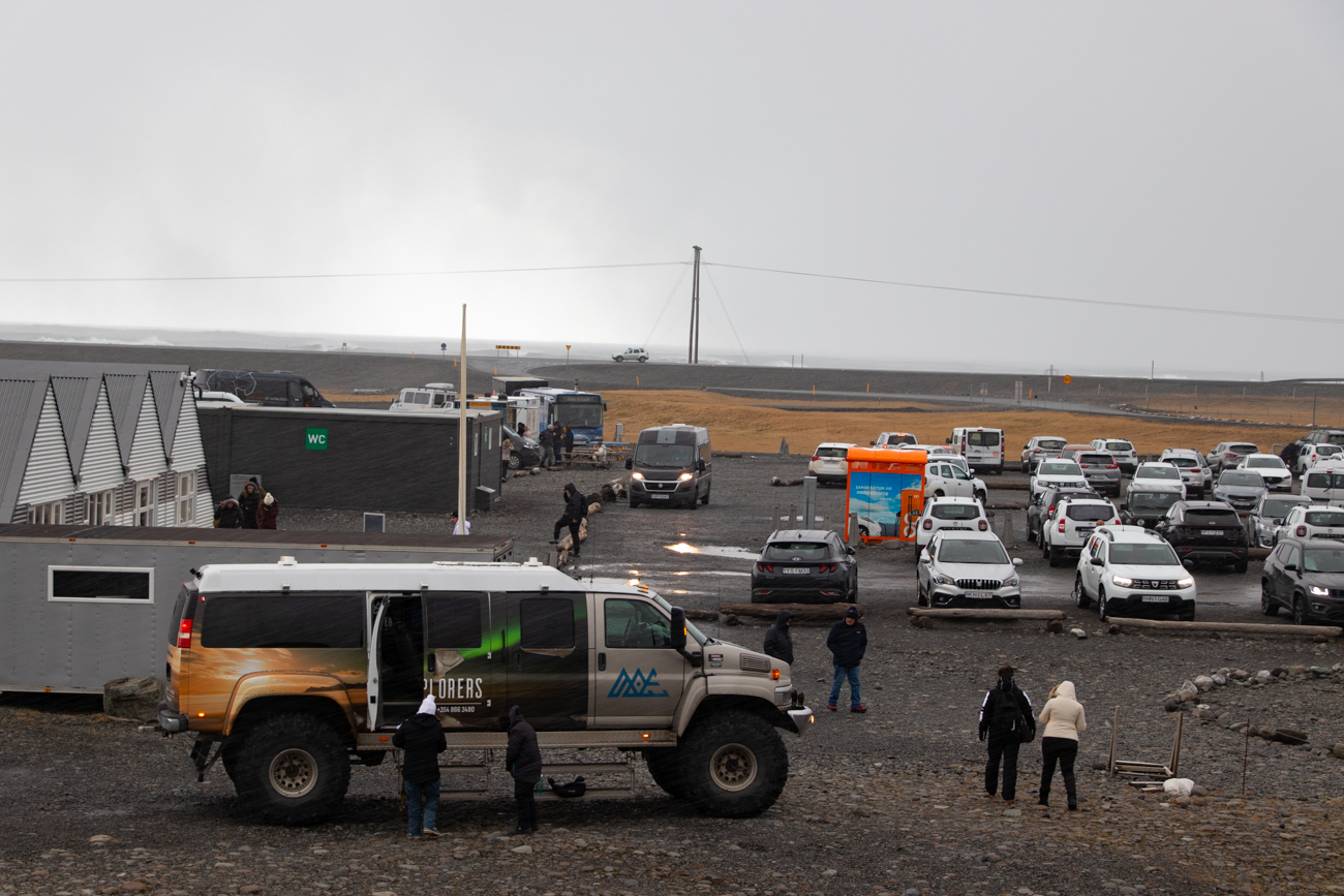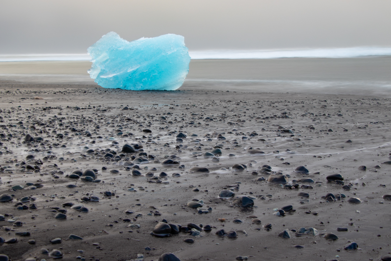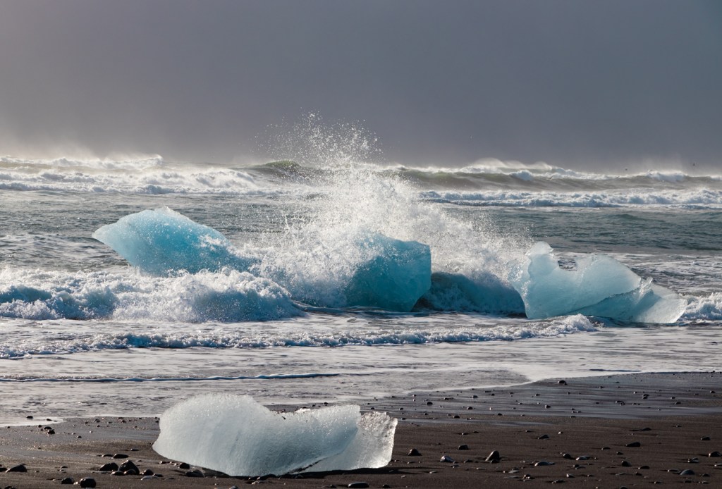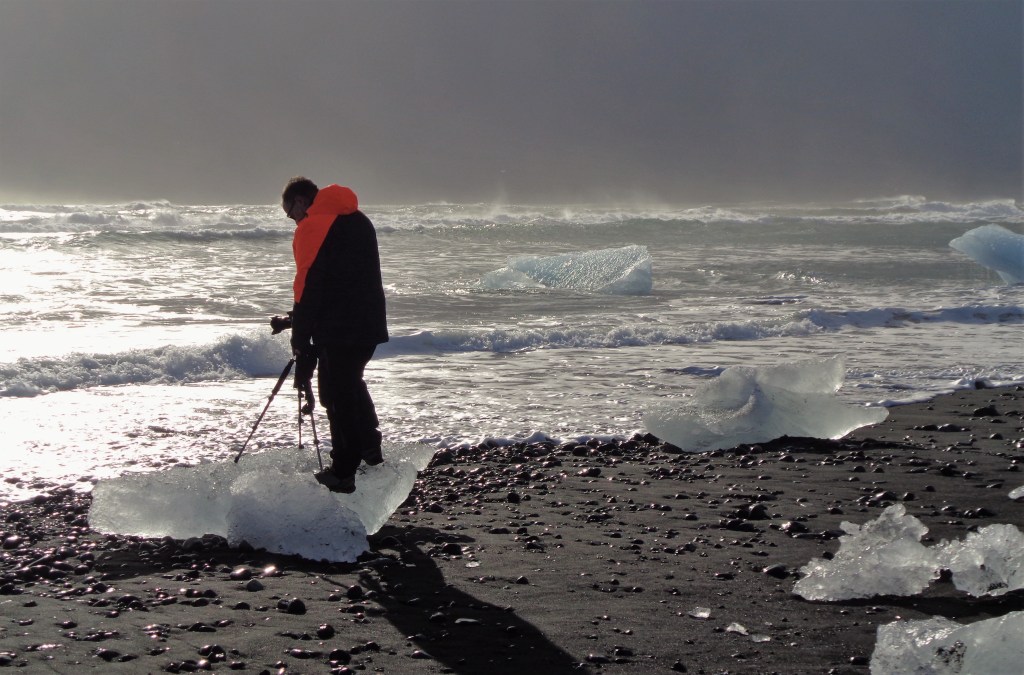 E tempo di proseguire diretti alla più nota Jokulsarlon. Prima del ponte intravvedo sulla sinistra due piccoli posteggi “deserti” ed entro al secondo, anche qui, risalita la Morena, si apre il panorama su una laguna immensa e sull’enorme ghiacciaio in lontananza. Per fortuna ho fatto questa pausa: 1km più avanti, dopo il ponte, inizia la “zona Turistica” dove il posteggio e stracolmo e le code per i bagni pubblici sono…. Lunghissime. Qui optiamo per saltare il luogo andando direttamente alla Diamond Beach; quella si, che nonostante l’affollamento, merita. Affascinante con la luce che va e viene mentre il temporale passa appena oltre la battigia. Alcuni scatti, una mezz’ora di pausa e via.