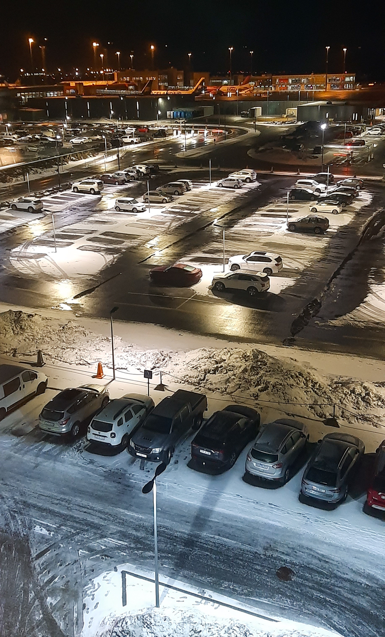 Atterriamo poco prima delle 19 locali, ritiriamo i bagagli e raggiungiamo l’ufficio della Avis/Budget per ritirare la vettura; ci vuole un’eternità così solo dopo quasi 2 ore possiamo raggiungere il posteggio dove ci attende la nostra Dacia 4×4, vettura che dobbiamo controllare al buio con l’ausilio delle lampade frontali, togliendo il ghiaccio dalla carrozzeria e dai cristalli; più tardi invierò al noleggiatore 2 mail con l’elenco dei piccoli difetti da noi riscontrati che non ci avevano comunicato. Era comunque in buone condizioni: 45.000km ed un unico grosso problema, che si manifesterà negli ultimi due giorni del viaggio: la chiodatura degli pneumatici anteriori è ridotta all’osso, quelli posteriori invece sono perfetti. Possiamo quindi iniziare il viaggio alla volta dell’Hotel Aurora, percorrendo i 400 metri che separano il posteggio dall’albergo e dove riorganizziamo i bagagli in modo da scaricarne uno solo ad ogni albergo successivo. Ci resta solo la forza per ammirare la vista sull’aeroporto, poi crolliamo sul letto…. Senza cena!