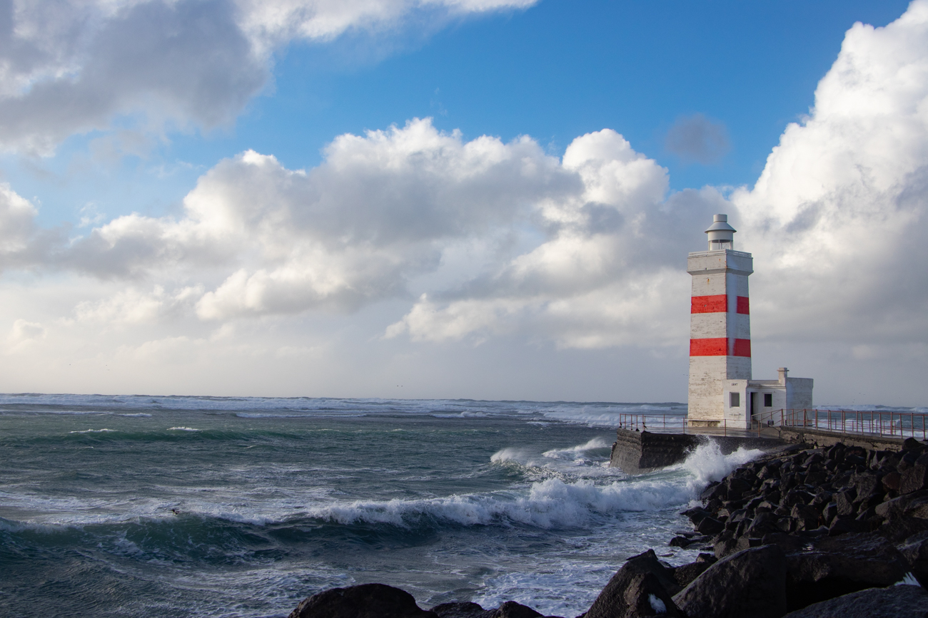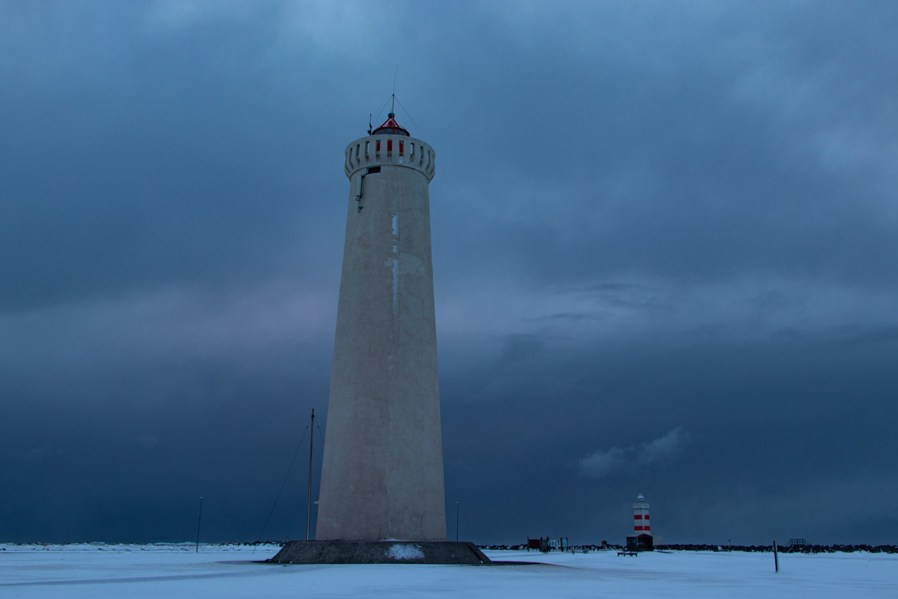 Le App, sconsigliano di andare verso Reykjavik, così ripercorriamo la 427 diretti a Grindavik tra bufere e sprazzi di sole, con alcune macchine ed addirittura una corriera di traverso o ribaltati fuori strada, decidiamo di rivedere Strandakirkya. Il tempo e leggermente migliorato e raggiungiamo Grindavik prima del previsto, le App di cui hoo imparato a fidarmi promettono che resterà così ancora per un’ora, così i due eroi prendono una decisione: “Non risaliamo verso l’aeroporto, ma percorriamo la strada 425 panoramica costeggiando la Penisola di Reykjanes, per raggiungere prima Keflavik e quindi Gardur e pernottare al LIGHTHOUSE INN, all’estremità nord della penisola”. La decisione ci ripagherà con splendidi scorci, raggiungeremo il Faro di Reykjanes, passeremo accanto al “Ponte tra due continenti” dopo aver ammirato il vapore delle stazioni geotermiche e lo strano paesaggio della zona prima di attraversare Keflavik da dove si scatenerà una delle peggiori bufere in cui ho guidato. Da Keflavik all’albergo Ligthouse Inn sono solo 11km ma per tutto il percorso vedo solo bianco che fluttua veloce al traverso sulla strada ed a mezzaria davanti a me, intravvedo i paletti ai bordi della strada e null’altro, nemmeno i segnali stradali, il tutto mentre il vento scuote la “Dacia” invitandomi a provare il brivido del fuoristrada, invito che sono fermamente deciso declinare. Raggiungere l’albergo ed entrare è un piacere appagante! Una breve pausa del vento dopo aver preso possesso della camera ha offerto una schiarita nel corso della quale sono uscito, dapprima da solo ad ammirare l’oceano ed i due fari, poi con Assunta per una squisita cena al ristorante ROSTIN annesso ad un MUSEO, il museo purtroppo era chiuso. Poi, resta solo il tempo per la Buonanotte in una bella ed ampia camera, la 104!