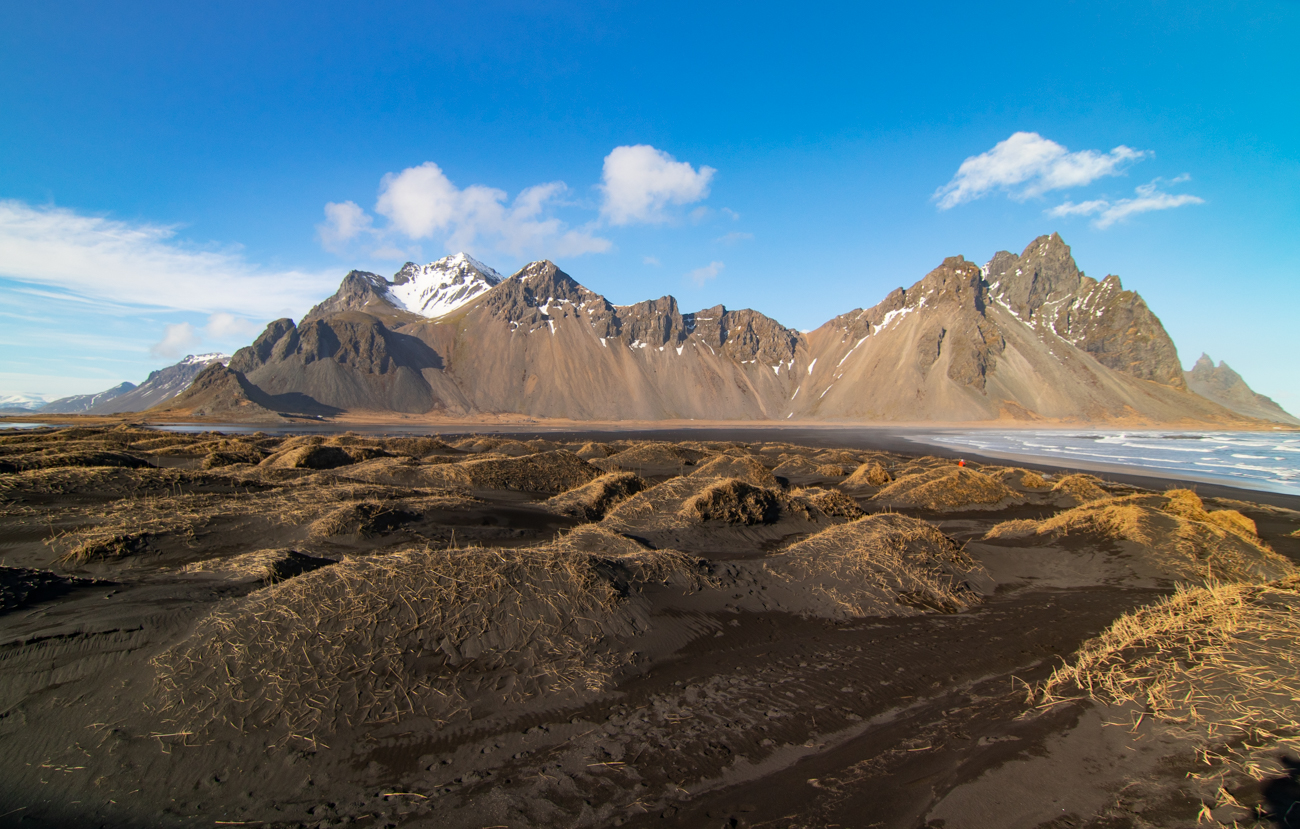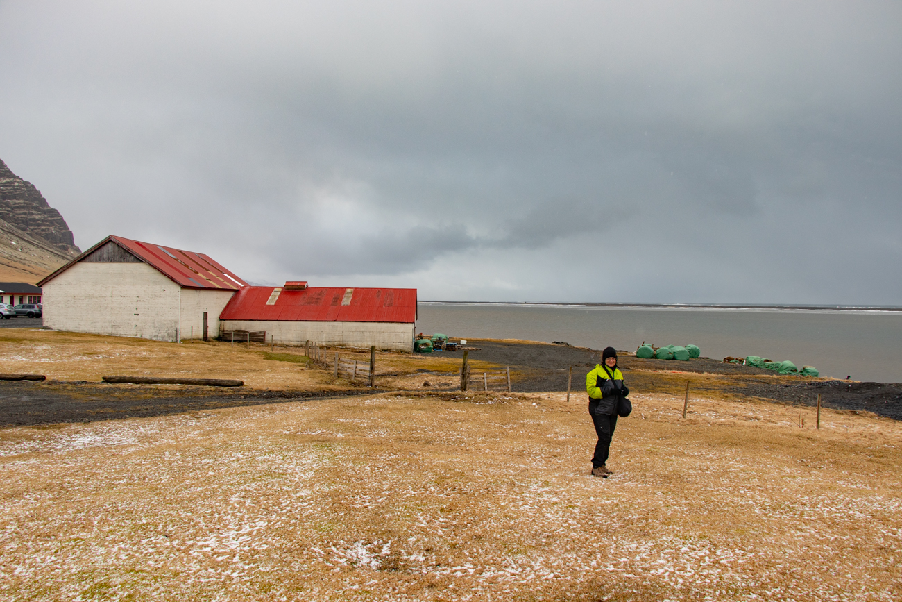 Vestrahorn è una bellissima montagna, la si vede in lontananza da Hofn e per raggiungerla si prosegue senza entrare nell’abitato. Prima della galleria che attraversa la montagna si gira a destra ed in pochi km di buona strada sterrata si raggiunge il Viking Cafe, dove si paga l’ingresso alla penisola di Stokksnes; del Viking Cafe sapevo che gestisce un Camping, non che avesse anche camere disponibili, peccato, da tener presente per una prossima occasione! Facciamo una pausa per una torta accompagnata da una cioccolata calda proprio mentre fuori arriva “temporale” scaricando per qualche minuto grandine mista a neve, in quella breve pausa chiediamo informazioni: l’ingresso a Stokksnes costa 900Kr a persona, si accede sia a piedi che in macchina, se voglio venire di notte è possibile pagare alla Casa Automatica all’ingresso del Caffe, con carta di Credito. Sarebbe la mia intenzione fare una battuta di “Caccia ad Aurora” qui, con poco inquinamento luminoso. Valuterò stasera come sarà il meteo. E’ ora di ripartire, e verso le 16 raggiungiamo l’Hotel Hofn e ci accasiamo. E’ grazioso ma deludente: ditate sulla porta interna della camera, sabbia nera sul top bagno e nessuna scusa dal personale quando lo segnalo portando direttamente la sabbia in un fazzolettino e mostrando le foto. Non parliamo poi della sera, quando tenterò di ordinare al bar, cose indicate sul listino, ma di cui sono sforniti, gelato incluso (e per questo mi rispondono che “la cucina è chiusa”) …… anche l’Irish Coffe lo porteranno senza nè cannuccia nè cucchiaino.