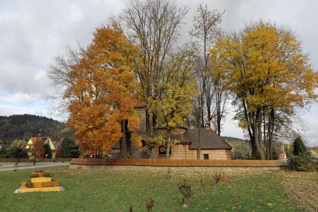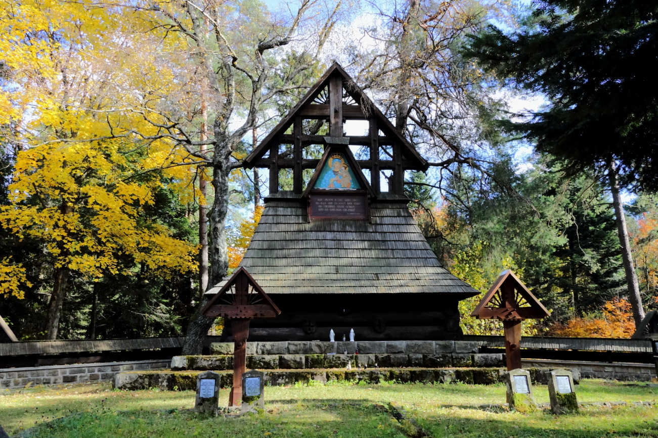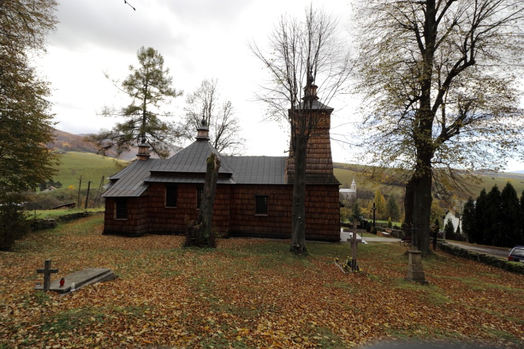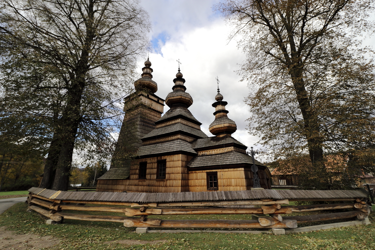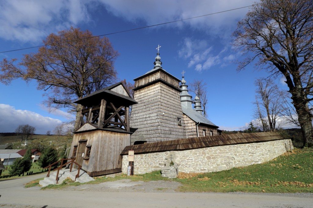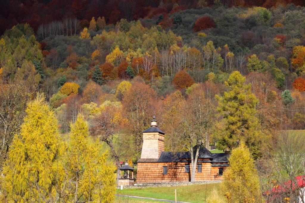 a Pochi km da Bardejov, in direzione Nord-Ovest, nella località di Powroznik. Avevo trovato poche informazioni, tra le quali che si trattava di una chiesa inserita nella lista dei Patrimoni UNESCO, la deviazione comportava pochi km in più, raggiungendo inoltre una seconda chiesa, poco prima del rientro in Slovacchia, mi risultava ne esistesse una terza poco più a nord, ma le informazioni erano confuse. Decidemmo di partir presto, saltare una chiesa slovacca raggiungendo Powroznik, dove arrivammo dopo 33km. Bel percorso anche questo attraverso colline coperte di boschi e con poco traffico. Defilata rispetto alla strada principale ma facilmente raggiungibile, con un ampio posteggio sterrato accanto. Interessante la chiesa che, come l’altra UNESCO vista il giorno precedente, sembrava avesse il rivestimento ed il tetto rifatti da poco e verniciati, comunque impregnati. L’ingresso principale del recinto era nastrato, probabilmente per recenti lavori di muratura, era comunque aperto il Cancello secondario da cui entrammo. Chiesa chiusa, ma molto interessante e gradevole, Molto particolare il banchetto con l’altarino posto all’esterno della chiesa, molto scenico dal prato esterno l’albero con i Colori autunnali abbinato al colore della chiesa. Estremamente interessante poi il grande cartello informativo, nel posteggio adiacente, che presentava una mappa con l’indicazione di altre chiese dei dintorni e le caratteristiche ed immagini di alcune di esse. Tante, talmente tante da Ipotizzare un viaggio esclusivamente per questa area, aggiungendo quella del giorno precedente, magari con Andata via Krakov e rientro via Bardejov…. O viceversa. Con il tarlo della possibilità riprendemmo il percorso in direzione Sud Ovest, per raggiungere, dopo 14km, Leluchov alla ricerca della seconda chiesetta che trovammo poco oltre l’abitato e risalendo una stradina asfaltata per circa 600m sino al comodo posteggio. La chiesa era aperta, intuimmo come stesse per esserci una funzione religiosa, quindi entrammo velocemente, solo per un minuto constatando come sia il Pope che alcuni fedeli fossero già all’interno e, per non disturbare, uscimmo; io mi aggirai ancora per fotografare l’esterno. Il declivio su cui sorge era rivolto a sud e stava uscendo il sole. Mi resi conto che il confine era subito sotto l’abitato, lungo il torrente che divideva Leluchow dal villaggio in Slovacchia che si trovava sulla sponda opposta, sopra questo abitato “oltreconfine” mi pareva di intravvedere una strada che ritengo fosse quella che avrei percorso da Bardejov, se non fossimo entrati in Polonia. Una foto panoramica della chiesa, con il bosco autunnale sullo sfondo, entrambi illuminati dal sole, poteva essere interessante, così, ripartendo, passai il confine alla ricerca di questa immagine… la trovai.
