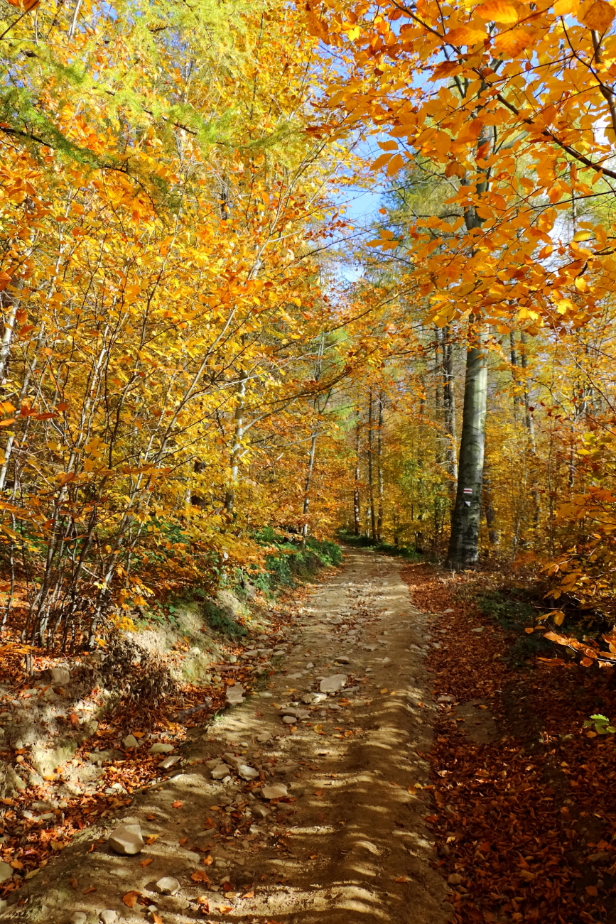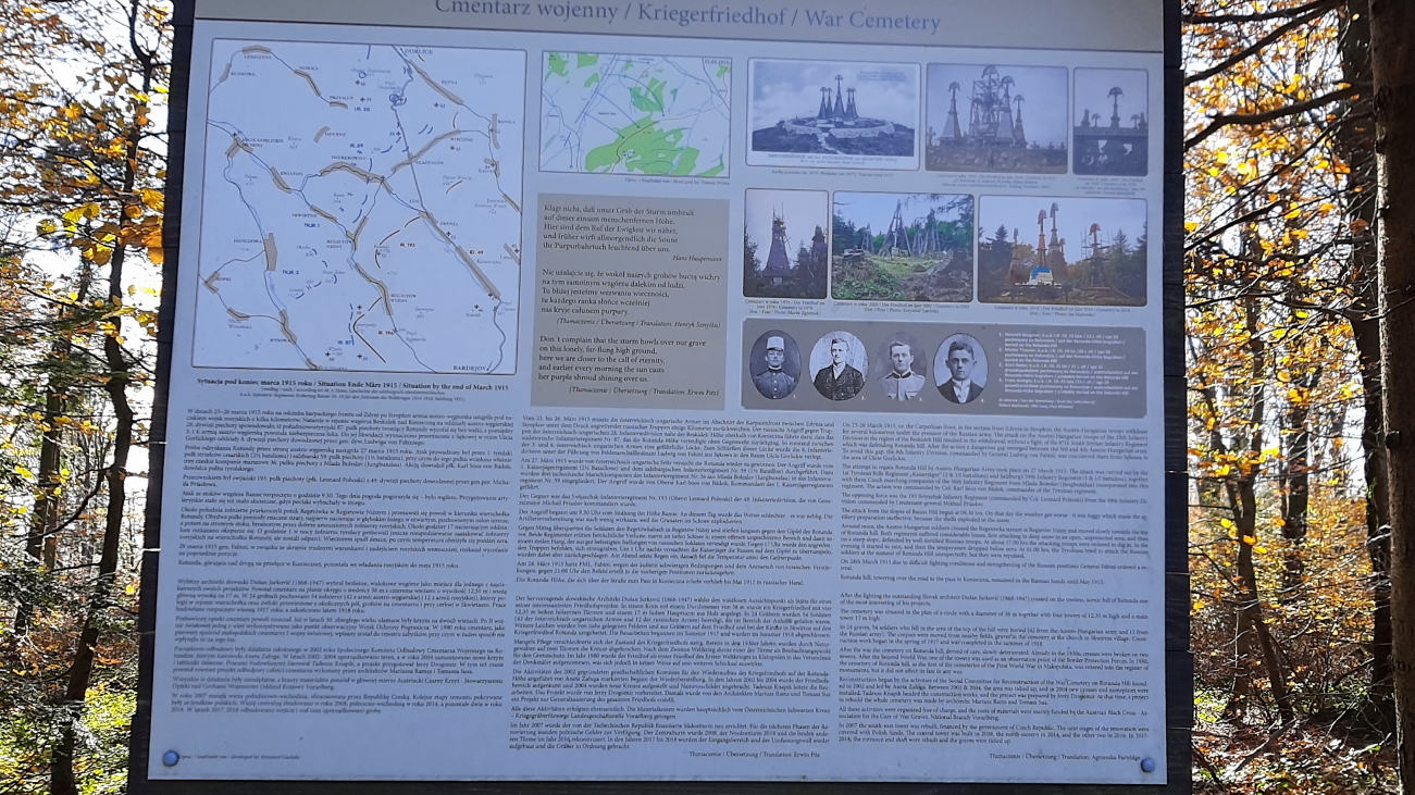 In una splendida mattina di sole autunnale, cosa c’è di meglio di una sgambata nella natura, nei boschi, risalendo colline in aree sconosciute, cercando cimiteri della 1’ guerra mondiale…. in Polonia. Una cosa che chiunque, immagina, organizza e fa: Io sono Chiunque! Rotunda si trova nei pressi del villaggio di Regietow, è conosciuta anche come “Cimitero della Prima guerra mondiale n. 51”. Mi incuriosiva la sua struttura caratteristica, mi attirava la camminata nella natura di 1,6 km per 250m di dislivello. Era il principale motivo del nostro “sconfinamento” cosa mi poteva fermare? Solo le mie paure: quella di non saper dove posteggiare la macchina al sicuro e quella di incontrare un orso oltre al timore che il mio ginocchio non completamente recuperato potesse non concordare con me, la peggior paura era quella del brutto rapporto di Assunta con le salite. Passato il confine seguivo il navigatore, eravamo in zona verso le 9.30, il punto lo avevo registrato approssimativamente mentre la stradina proseguiva ancora oltrepassandolo, fuori mappa e priva di indicazioni. Giunto alle ultime case del villaggio vidi una ragazza che usciva da una casa per salire su una piccola Jeep, indossava una tuta tecnica simile a quelle che avevo quando facevo parte del gruppo di cani da soccorso; cuciti sulla giacca un paio di stemmi ed una bandiera polacca, sembrava sveglia ed attiva, masticava poco l’inglese ed il tedesco mi limitai, così, a chiedere una sola parola: “ROTUNDA”; Lei si illuminò sorridendo ed indicò di proseguire per circa 1,5km e così facemmo. Trovai il ponticello da cui iniziava il sentiero, ma non era opportuno posteggiare per mancanza di spazio, cercai quindi di fare inversione ed a quel punto arrivò la Jeep con la ragazza di prima ed un secondo ragazzo a bordo, parlammo un po’, tra inglese e tedesco e ci spiegarono dove era meglio posteggiare, anche perché di li a poco sarebbero passati un gruppo di cavalli e non era sicuro. Seguimmo le indicazioni ed iniziammo l’opera di vestizione: scarponi, zaini, acqua e passarono i cavalli con i rispettivi cavalieri, circa 50-60. Avanzavano lentamente e ci passarono accanto salutandoci, al loro seguito una decina di carri, trainati da cavalli, con bambini e ragazzi e donne a bordo, probabilmente una festa. Iniziammo la salita che per Assunta fu il secondo Calvario. Un percorso breve, facile, ma con due strappi più ripidi, il secondo dei quali, in mezzo al bosco quando la salita, da mulattiera si era trasformata in sentiero ricoperto di foglie che nascondevano il tracciato e che non permettevano di capire cosa celassero. Comunque, un sentiero ben tracciato, almeno con i segni sugli alberi. Impiegammo un’ora con ripetute pause. Le imprecazioni di Assunta le assorbivano molte energie, ma, come sempre, arrivò anche Lei in cima. Erano circa 11.00 quando arrivammo e c’eravamo solo noi, nel silenzio intramezzato dal rumore del vento che soffiava al di sopra degli alberi. Un cimitero diverso da tutti quelli che ho sempre visto, molto d’effetto. Ai bordi alcune tabelle ne spiegavano la storia su un Fronte di Guerra, lontano ma contemporaneo a quello che noi abbiamo sempre conosciuto, qui la “partita” fu: Austria-Ungheria vs. Russia.