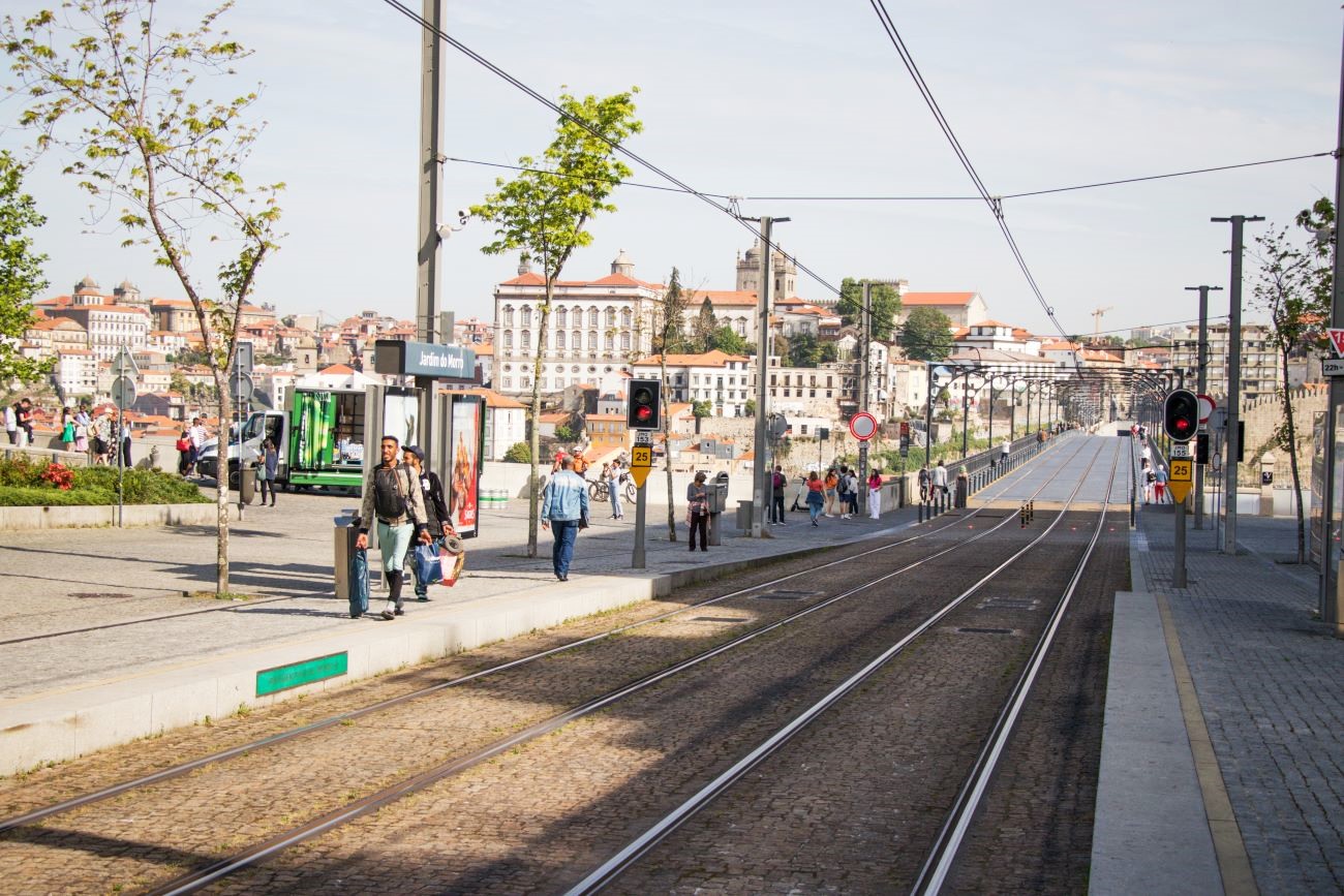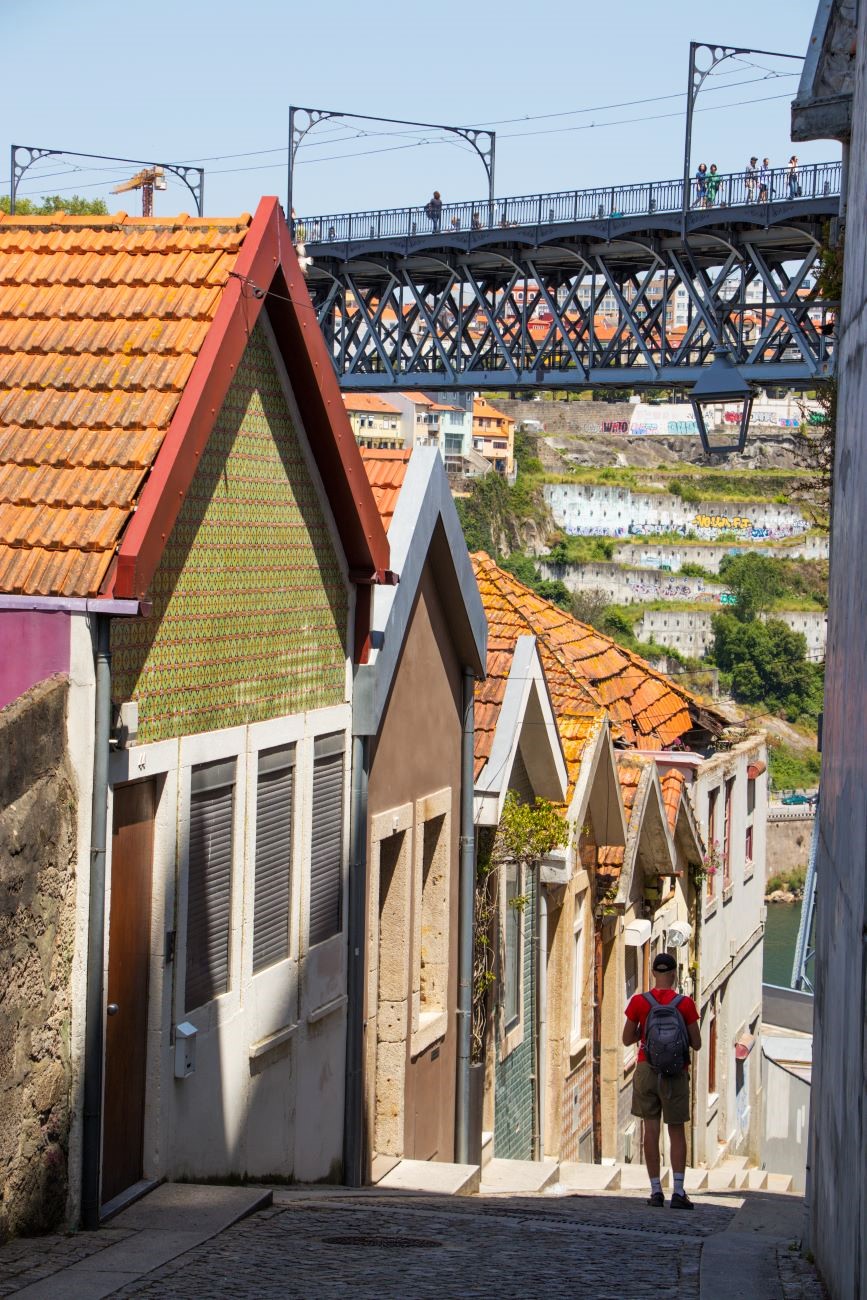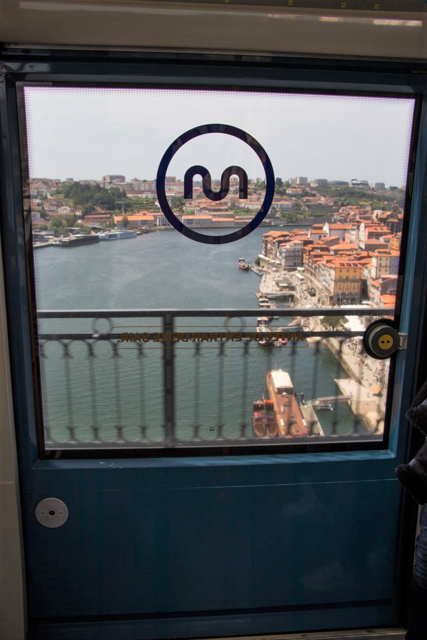La mia indole “nordica” iniziava a soffrire il caldo, comunque, prima di rientrare, decidemmo per una ulteriore deviazione sino al Ponte LUIS I da questo versante per ammirare il panorama approfittando dell’aria limpida e poi rientrare con l’autobus che, costretto dai lavori alla base del ponte, deviava lungo un diverso percorso: Transitava sull’altro ponte, il Dom Infante, offrendo un bellissimo scorcio di quello più famoso, per poi addentrarsi a Vila nova de Gaia, passare nei pressi della stazione ferroviaria General Torres, vicino alla quale, compreso dalla mappa online che utilizzo, la Mapy.cz (molto più affidabile e precisa della più diffusa, MAPS della grande G) scendemmo alla fermata più vicina all’hotel. Per passeggiare, questa volta in discesa, all’ombra delle case lungo la stessa strada su cui si trovava il nostro albergo. Chiacchierammo un po’ con la ragazza della Reception, che ci suggerì una alternativa per raggiungere la stazione della metropolitana senza percorrere tutta la salita a piedi: bastava utilizzare, per 8 piani, l’ascensore: del posteggio a pagamento da cui si accede ai piedi del Ponte LUIS I.