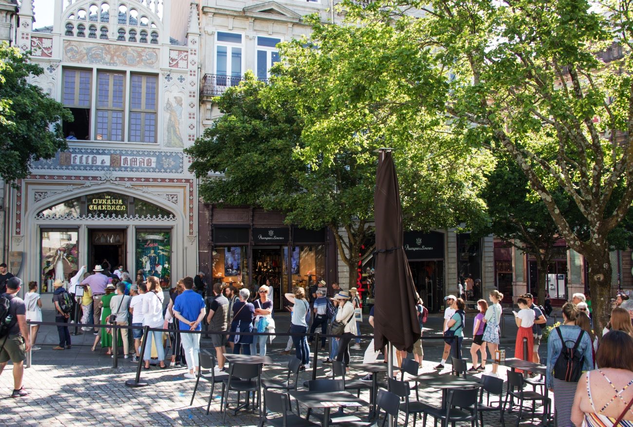 Attraversiamo quindi il “centro Commerciale” con giardino pensile anche per cercare un Locale con bagno. Sono quasi le 10 e quasi tutti i locali sono ancora chiusi, troviamo quindi una graziosa gelateria, con tavolini all’aperto e ci accomodiamo nell’attesa che aprano, così mentre siamo accomodati all’ombra, notiamo una strana, lunga e paziente folla in coda, incredibile quanta gente ci sia, così mi sposto, guardo cosa attendono e scopro che quella coda non la farei neanche se mi pagassero, è la Libreria Lello. Preferisco attendere alla gelateria Amorino, ottimo il gelato!