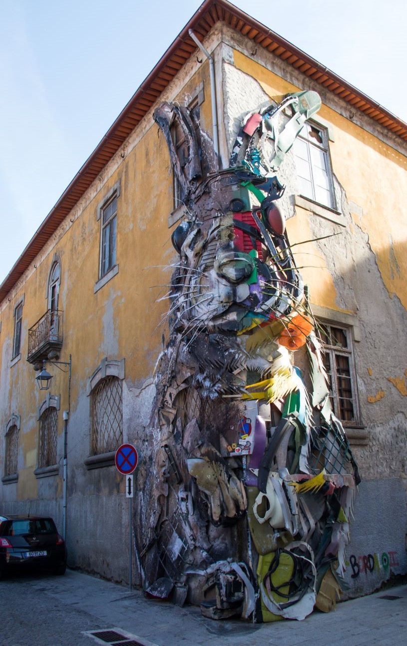 La portineria dell’hotel è presidiata sino alle 17, noi arriviamo alle 18! Poco male, con una telefonata ci danno i codici di accesso, seguiti poi da messaggi WhatsApp con le altre informazioni. Lascio Assunta accasciata e boccheggiante sul letto, le valigie sul tavolo, e mi fiondo al prospicente negozio di alimentari per acquistare Frutta e 2 Bottiglie d’acqua minerale che ci permettono di riprenderci quindi affrontiamo una doccia rigenerante per poi uscire, anche se per sfamarci dovremo attendere sino alle 19.00 quando i Ristoranti apriranno. Poco male, una breve passeggiata lungo i vicoli, dopo aver adocchiato due trattorie a pochi metri dall’albergo, ci offre un primo assaggio della città: passiamo sotto ad una stupenda “Opera D’arte” realizzata con scarti di diverso genere che rappresenta un Coniglio, poi incontriamo il Mercado Beira-Rio che reputiamo “Interessante, ma non per questa sera”, per rientrare lungo la sponda del Douro sino alla cantina Sandeman da dove imbocchiamo la nostra stradina, puntuali, mentre i ristorantini che abbiamo memorizzato stanno aprendo. Una veloce occhiata e ci fiondiamo subito nel più Vicino: NOVO ADEGA in Rua Candido do Reis n. 65. Stuzzicante il Menu dove il “POSTA de VITELA” ci attrae entrambi, infatti e un piatto per due. Facciamo Centro! Un piatto unico, che comprende una abbondante bistecca, tenera e squisita, con patate cotte con la buccia ed altre, simil-Fritte, ma tagliate più spesse. L’antipasto che ci propongono è al medesimo livello: Presunto (Prosciutto) e Rolino di Bachalau. Io non sono un amante del Baccalà, ma questo va giù da solo, aiutato da un’ottima birra.