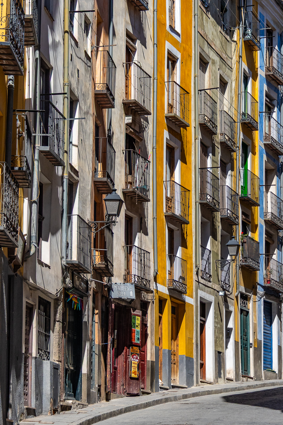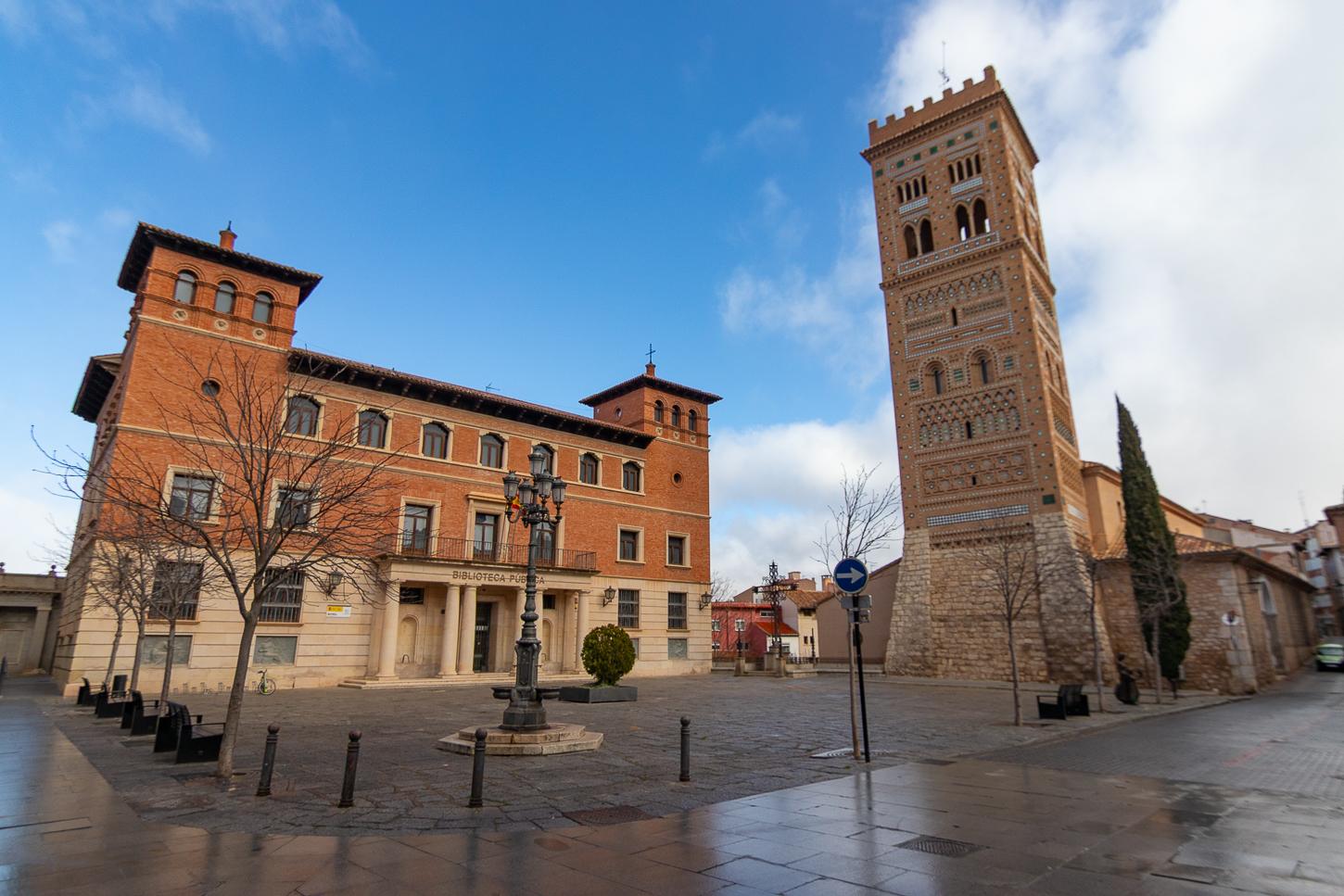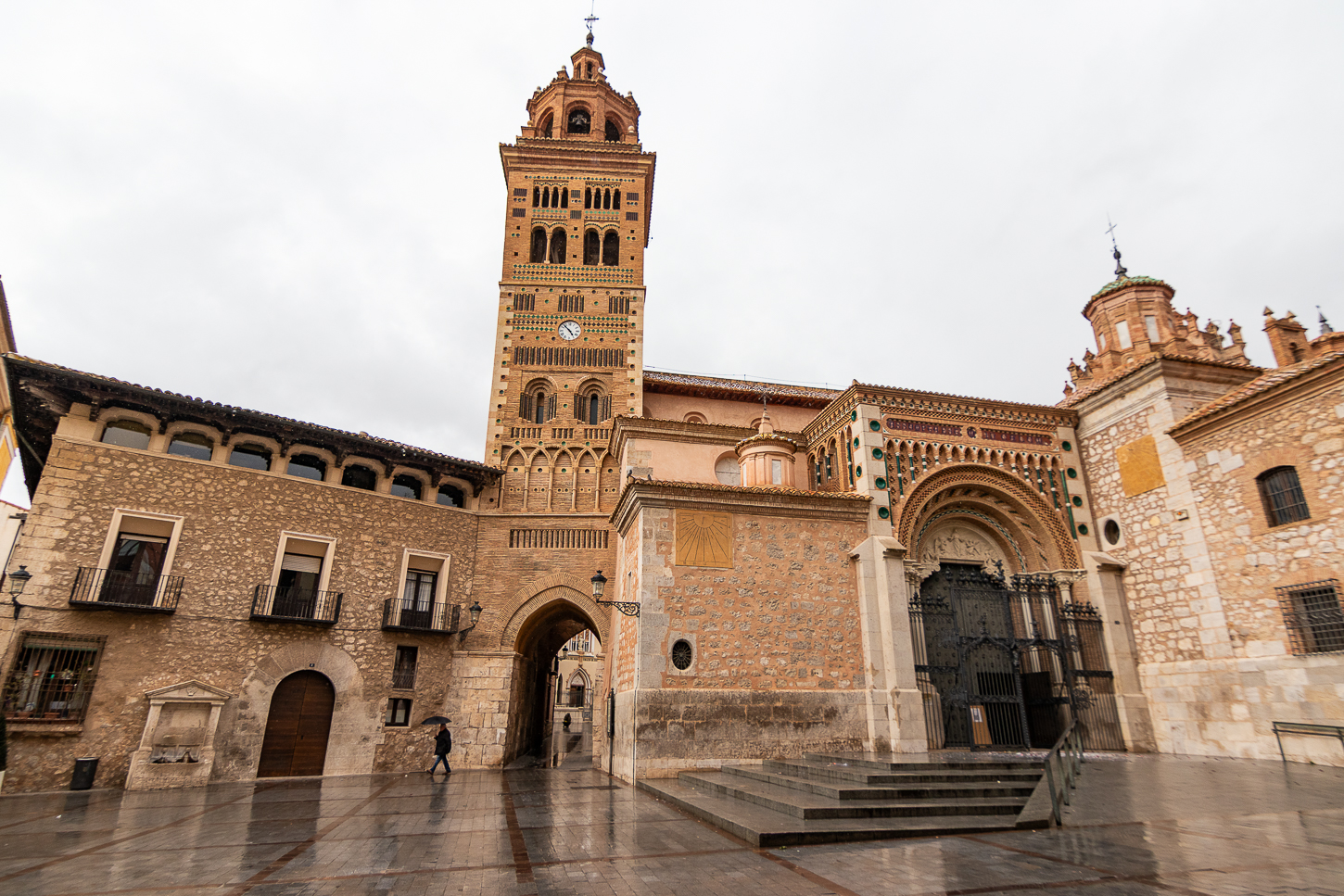 Juan, così si chiama il ragazzo che ci accompagna, parla Francese ed Inglese, anche poche parole di Tedesco, è simpatico; mi chiede dove e come vorrei fotografare e, indicatogli i luoghi concordiamo l’ordine. Torre del Reloy, San Martin de Tours, Piazza della Croce, Casa de la Domi, Chiesa de San Agustin, Casa Aragonesa, e qualche altra pausa tra le facciate. Assunta mi fa da assistente illuminando alcuni settori mentre fotografo, Juan lo fa a Sant Agustin, dove non si può accedere, lo farà Lui, al posto di Assunta per illuminare un paio di settori interni, mentre fotografo dall’esterno.
