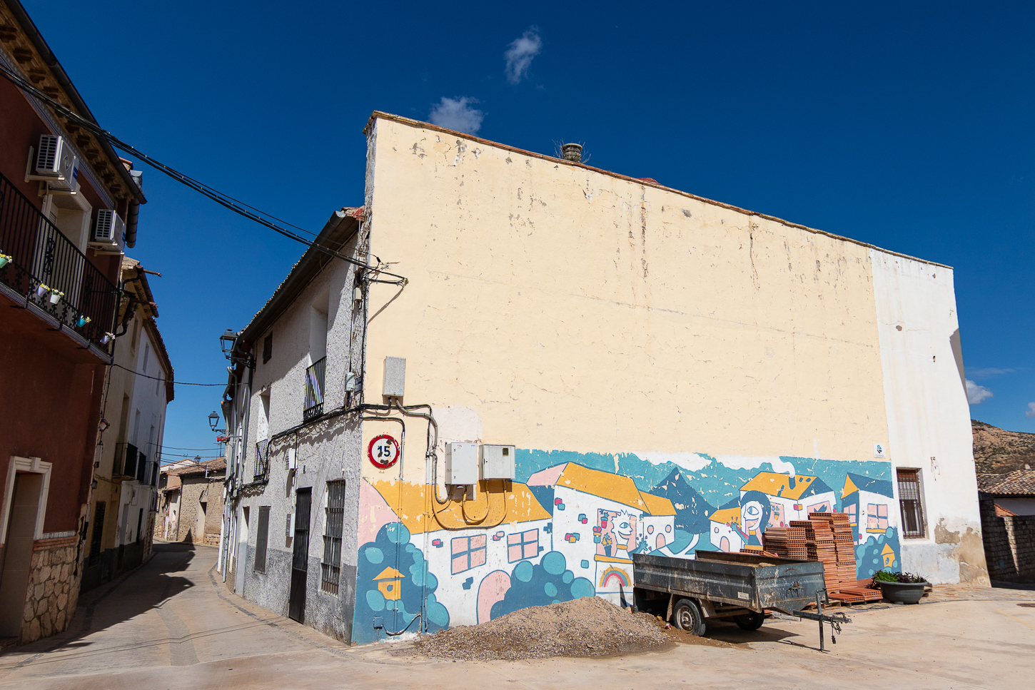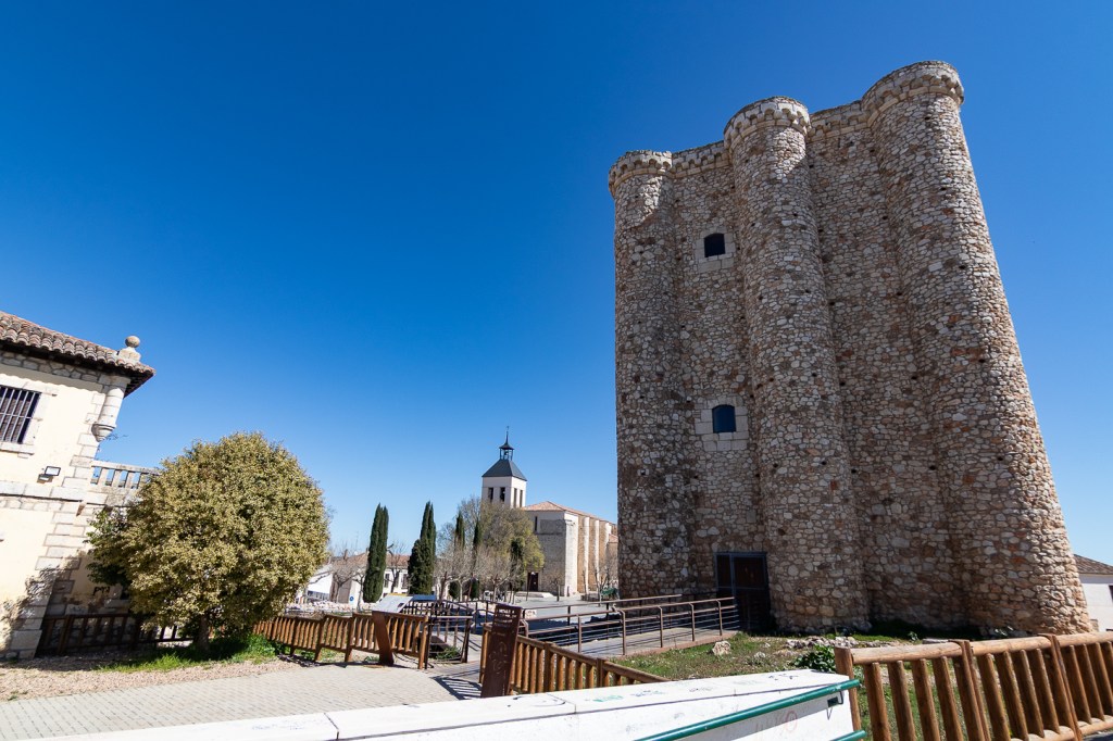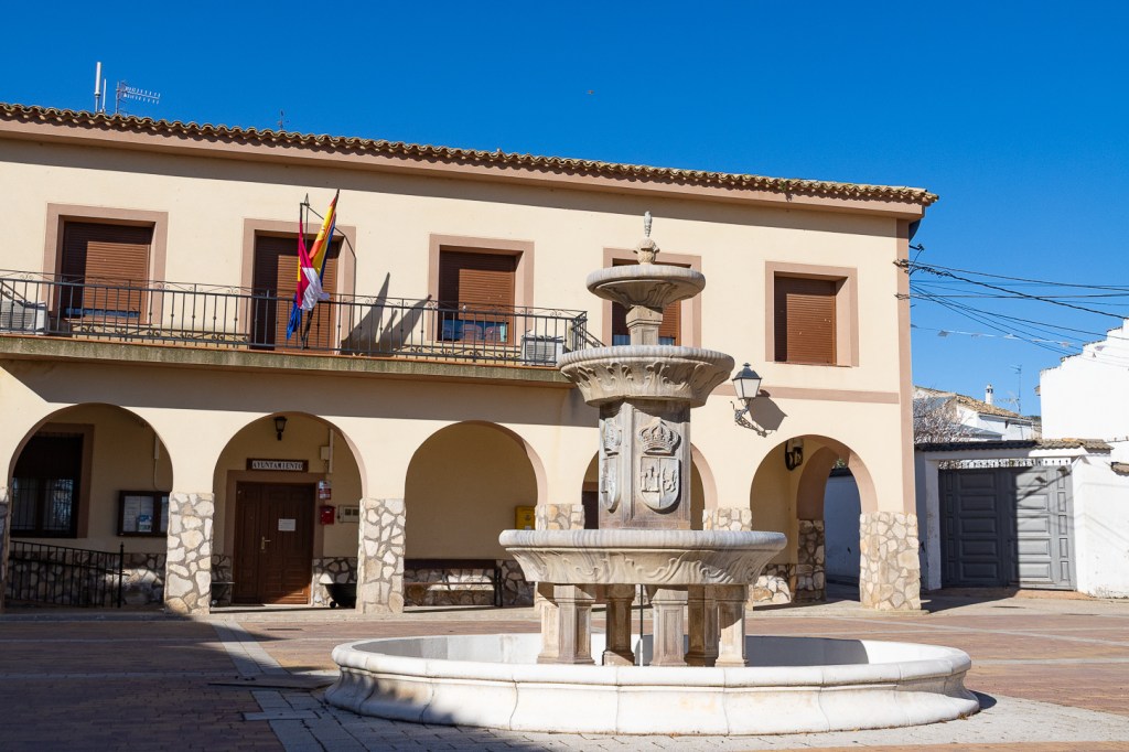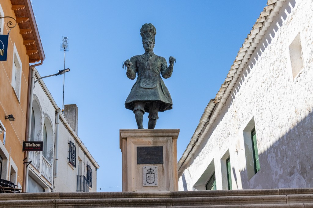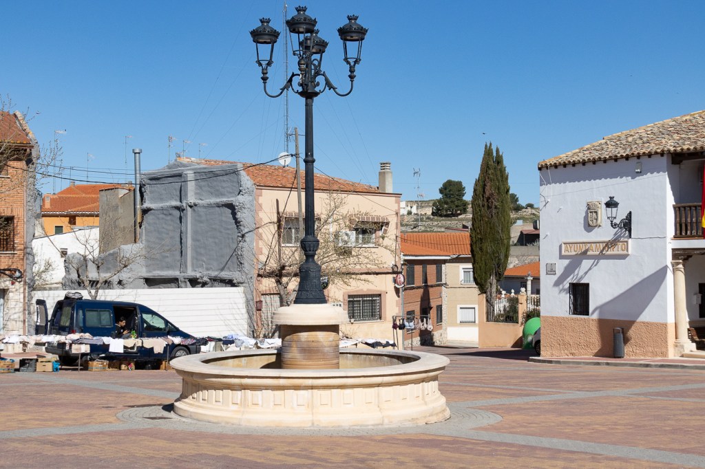 Panorama a parte, decidiamo addentrarci nel paesino per cercare un bar, che troviamo subito. Sulla piazzetta principale si affacciano il Municipio, un negozietto di alimentari, due caffè, c’è una fontana ed un mercatino, da lì una piccola scalinata conduce ad una statua molto curiosa ed al caffè che si trova accanto. Simpatico il caffè e la signora che ci serve, graziosa la bambina che gioca con il telefonino sgranocchiando patatine. E poi, via, verso altre tappe: Fuentiduena de Tajo, Villarejo de Salvanes, dove entriamo nel paesino dopo aver deciso di non raggiungere il Toro Osborne in quanto la strada sterrata è troppo sconnessa.