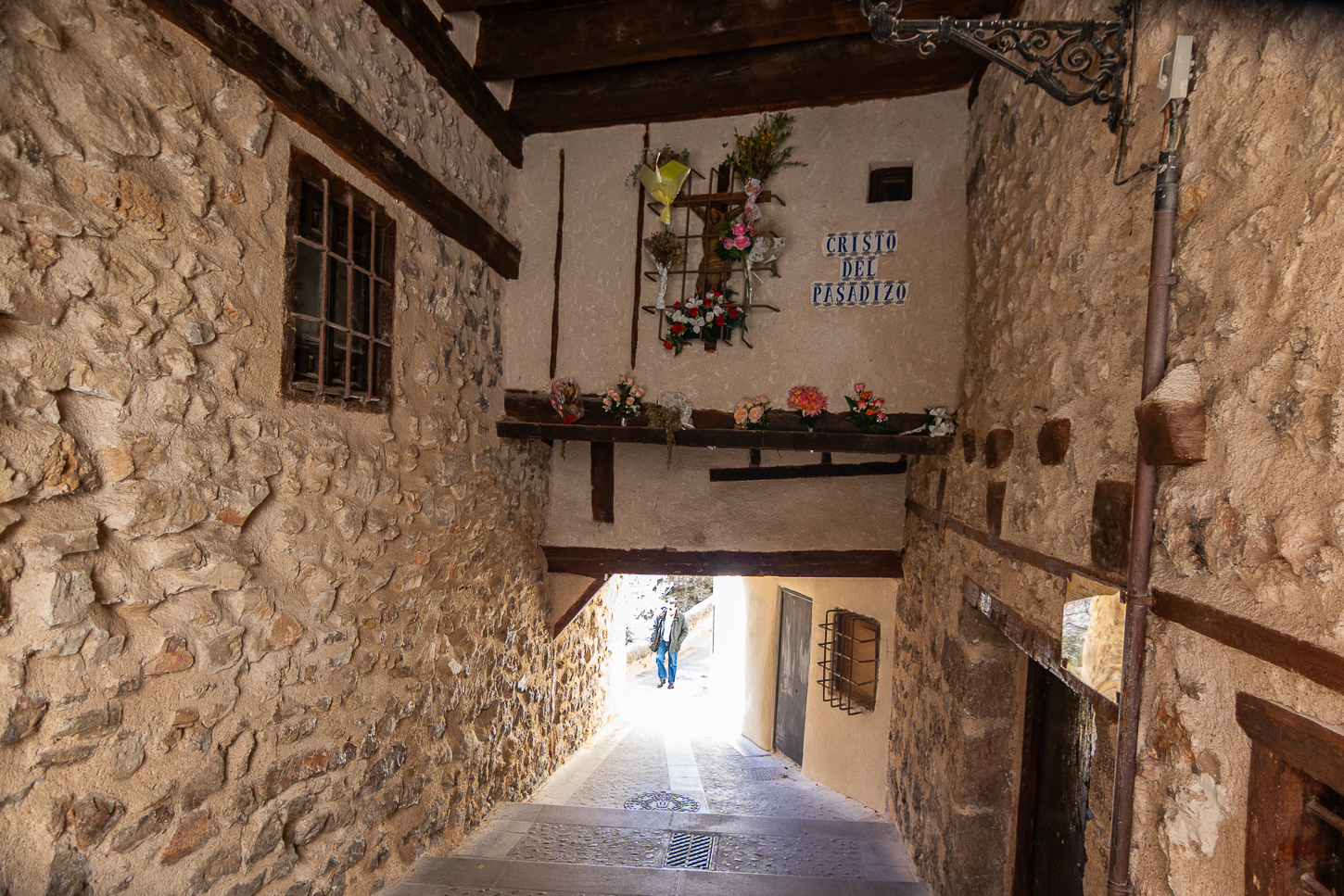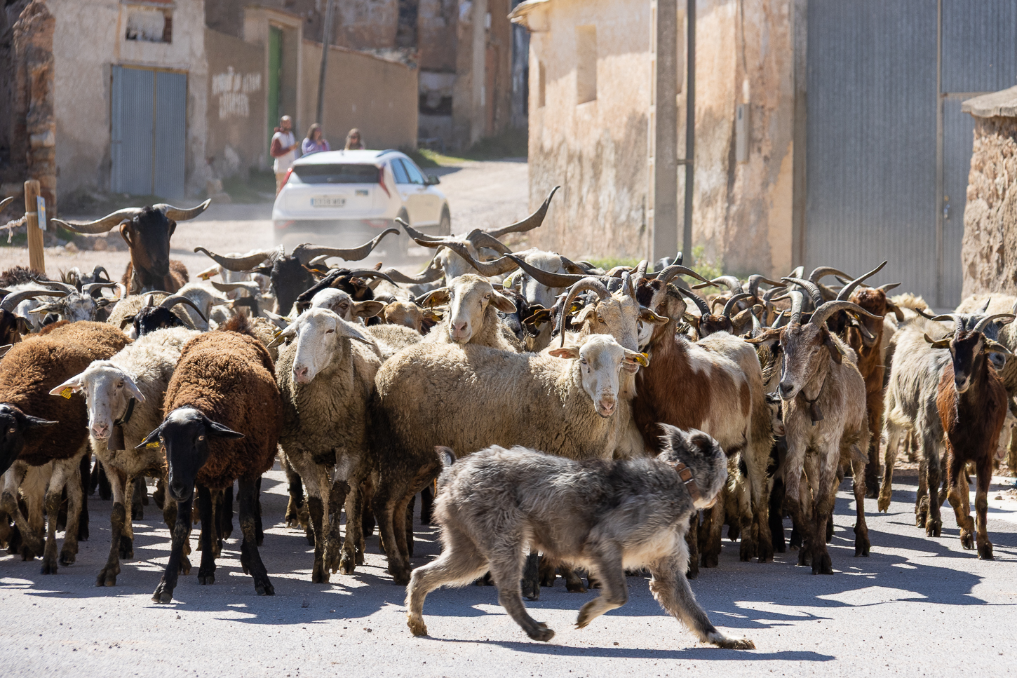 La visita guidata inizierà alle 12, abbiamo oltre un’ora di tempo e decidiamo quindi di dissetarci e rilassarLa, con una spremuta d’arancia, incontreremo così l’Aguas Vivas, un bar a quell’ora, con un bellissimo interno che scopriamo essere anche un ristorante, quindi, informatici sull’orario, comunichiamo che torneremo verso le 14, dopo la visita.La visita inizia dal Portal de la Villa in Piazza Goya; arriviamo in leggero anticipo e posteggiata la macchina ammiriamo la zona, fotografando anche il gregge che passa prima che il portone del “Pueblo” si apra per accedere, presentare i biglietti ed iniziare la visita.