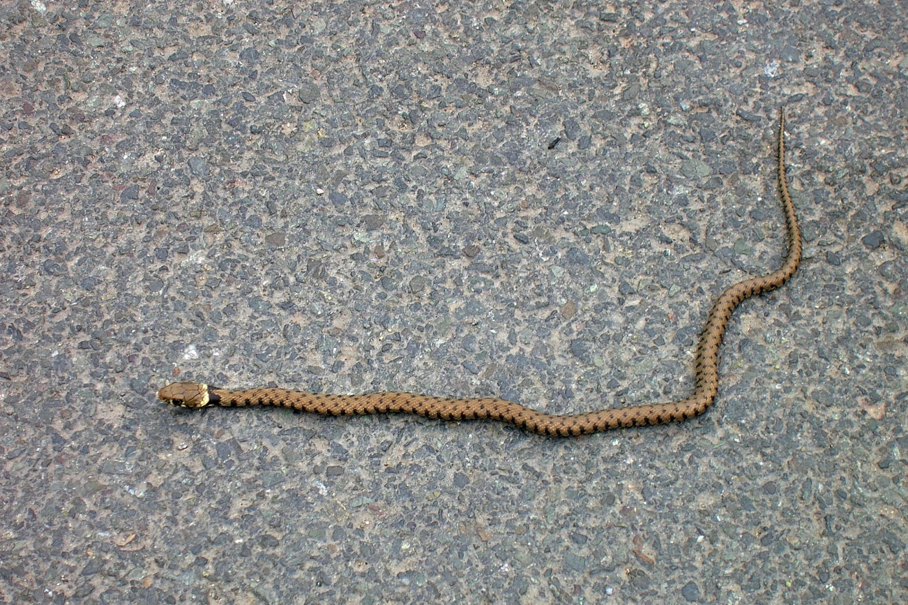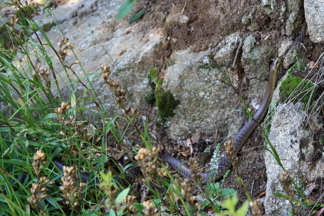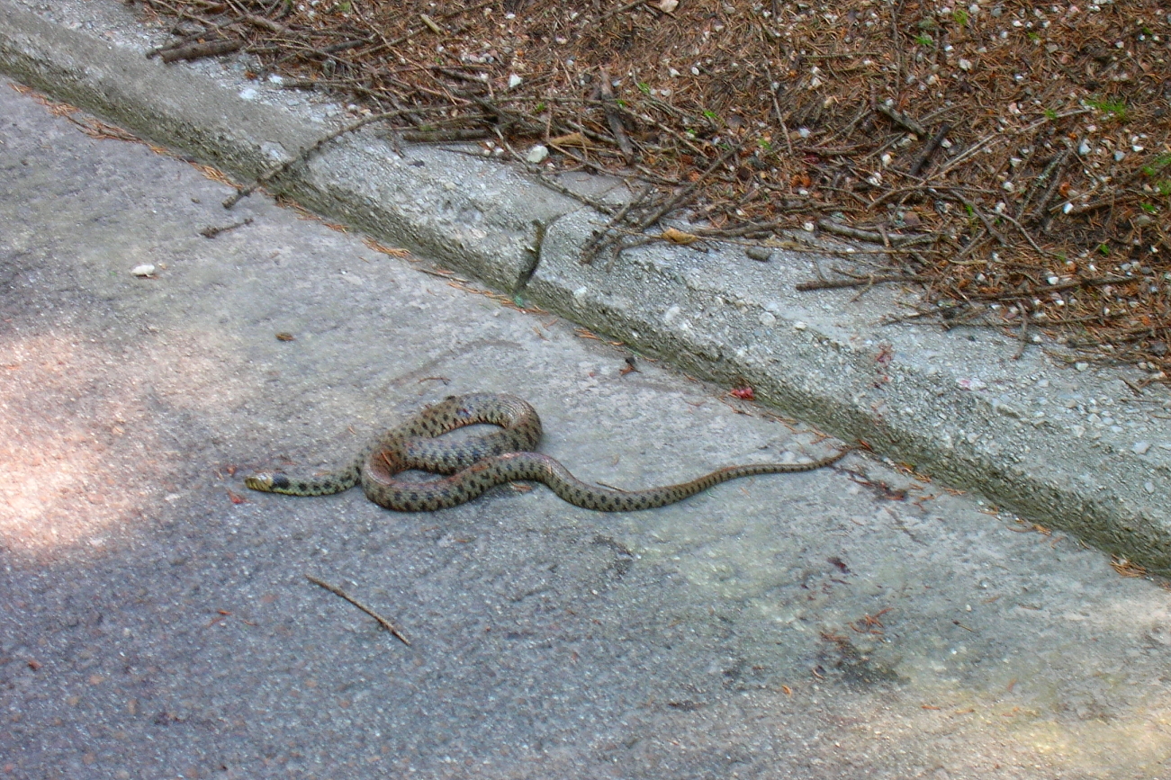 Un secondo incontro, meno adrenalinico, lo feci scendendo dal Rifugio Lambertenghi Romanin in Friuli Venezia-Giulia. Per chi conosce la zona, poco dopo il punto dove il sentiero incrocia il Rio Landri e ci si trova un abbeveratoio. Fermatomi per serrare meglio lo scarpone, mi passò vicino una cosetta da 20cm di lunghezza, questa la vidi bene mentre si avvicinava e mi passava vicino allo scarpone ebbi quindi il tempo di vederla bene, nelle fessure degli occhietti, e restare tranquillo. Tranne questi incontri tutto il resto si riassume in: Carboni, Saettoni (Colubro di Esculapio) Natrici, forse Coronelle, ma non ne avrò mai la certezza. Un caso dubbio (forse Vipera, forse Coronella) mi capitò nel 1999 sopra Cason di Lanza salendo verso il Passo, pochi metri prima della deviazione per la Grotta D’Attila. Era Giugno, una giornata ventosa ma soleggiata, io davanti, Mida mi seguiva come un’ombra, Assunta arrancava 30 metri più indietro. Sul sentiero davanti a me trovai una cosa lunga ed arrotolata, alzò la testa verso me allungando alcune volte la lingua. Mi colpì la colorazione: identica al fondo di terra del sentiero, con le chiazze nere in linea su tutta la schiena, non volli chiedere “chi va là, Amici o Nemici?”, girai sui tacchi, fermai Mida che voleva continuare, raggiunsi Assunta e cambiammo strada!