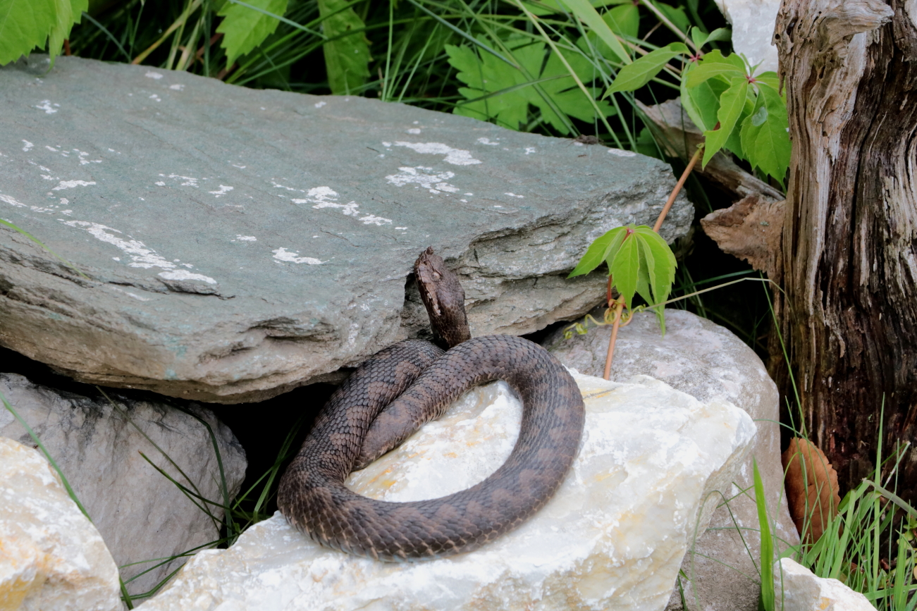 Raramente ho visto Vipere in libertà ne ricordo una, impressa nella memoria e “nell’onore”. Una “domenica delle Palme”, in Slovenia, sul versante sud del Monte Stol. Con l’allora fidanzata camminavamo in salita lungo una carrareccia, era una delle prime tiepide giornate di primavera. Fermatici a guardare il paesaggio stavamo conversando, abbassai lo sguardo proprio mentre questo esserino, non più lungo di 30cm stava tranquillamente zigzagando a pochi centimetri dalla punta del mio scarpone, una colorazione strana, variava tra verdognolo e marrone con macchie scure, in contrasto, sul dorso. URLO + SALTO ALL’INDIETRO mi dimostrarono le mie capacità di fare più cose contemporaneamente: “multitasking”! La fidanzata mi guardò chiedendomi cosa accadesse, ma non riuscendo a risponderle non lo apprese subito, tentai comunque di indicare quella cosa che strisciando aveva raggiunto l’erba al bordo della strada iniziando ad arrampicarsi sulla roccia; solo a quel punto la vide e mi rimproverò per una reazione simile con una cosa così piccola a 3 metri da me. La ragazza la lasciai poco tempo dopo! Per quanto riguarda il serpentello, NON era assolutamente un Colubro di Esculapio data la testa completamente staccata e triangolare e la coda che terminava immediatamente.