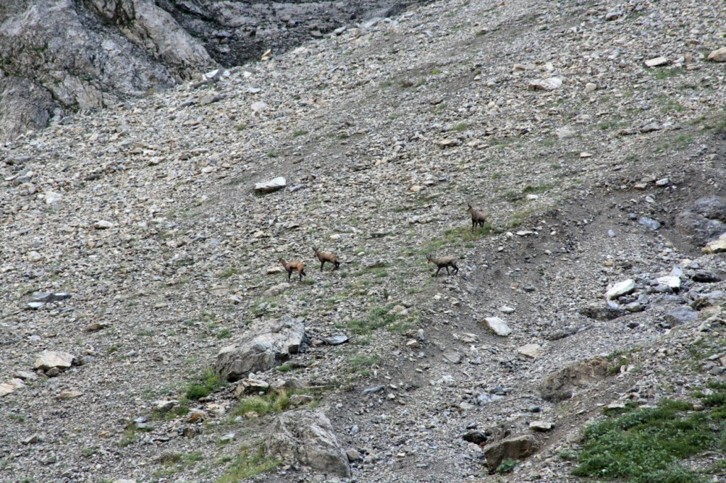 Pochi i Camosci. Salendo verso il passo Volaia dal rifugio Tolazzi, nei pressi dei ruderi della vecchia caserma, ad inizio marzo del 1998 la medesima scena di cui sopra la vissi con un Camoscio, non riuscii a fotografarlo, data la sorpresa ed il piacere di scambiarci sguardi reciproci di curiosità ed ammirazione. Dopo esserci ammirati (almeno spero che il suo fosse uno sguardo di ammirazione) si voltò e risalì velocemente nella direzione del rifugio. Più frequentemente li ho visti, ma mai in incontri ravvicinati, salendo dalla ValentinAlm dal versante austriaco. In un’altra occasione ne ho visto uno, ma da molto lontano, solo con cannocchiale, sopra Malga Pramosio.