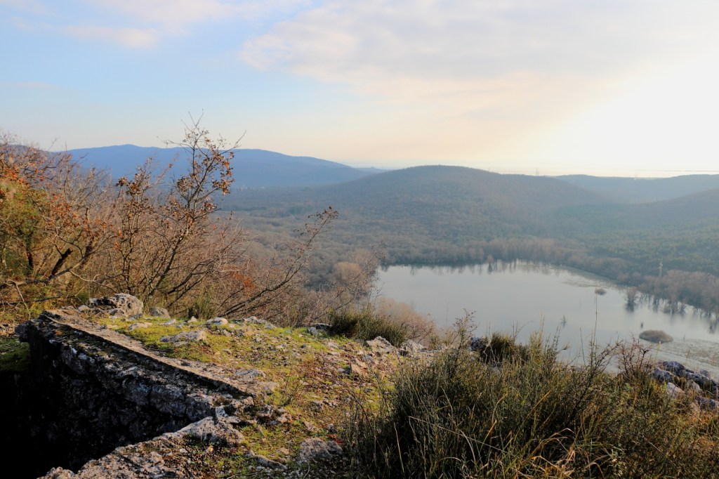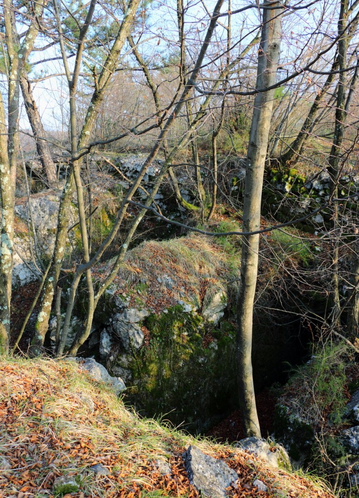 Il Centro Visite GRADINA fu una sorpresa, non ne avevo mai sentito parlare e trovai una struttura attrezzata, con Bar, ristorante, possibilità di pernottamento su una “terrazza” naturale con vista verso il mare e la pianura Goriziana e Friulana. Da qui alcuni percorsi. Da subito ci avviammo verso la Casa Cadorna, girando nell’area della ex Cava, per rientrare. L’ambiente non sembrava particolarmente attraente, lo era piuttosto il panorama sulla piana del Lago di Doberdò, ma volevamo un percorso più…. Vario. Rientrammo, oltrepassammo il Centro Visite e pochi metri dopo iniziamo a risalite per una carrareccia che si avviava in leggera salita verso una zona sassosa ma più vegetata. Appariva subito evidente i terreni ai bordi di quel tratto fossero adibiti a pascolo, il profumo che incontrammo poco oltre lo confermarono. Proseguimmo sino ad un bivio con, sulla destar, un paio di costruzioni abbandonati ed alla biforcazione scelsi di tenere il percorso più a destra ed evidentemente meno frequentato. Un tipico percorso di quelle zone, Rocce calcaree affioranti e terra rossa, vegetazione su entrambi i lati. Pensavo tra me e me come, con la mia ofidofobia, per tutelare le mie coronarie, quell’area possa non essermi consona. Era comunque adatta alla giornata ed alla mia curiosità. Oltre cent’anni prima tutta quell’area brulicava di soldati di diverse nazioni che avrebbero volentieri preferito essere altrove, così osservando la vegetazione, le rocce ed il percorso iniziai a cogliere la presenza di formazioni innaturali che presto iniziai a riconoscere come “trincee”, tante ed ovunque. Dopo circa un km il percorso si ricongiunse al principale che prima avevamo lasciato e da qui iniziammo a trovare alcuni cartelli informativi dai quali apprendemmo come stessimo attraversando aree fortificate di “Seconda Linea”. Proseguimmo per saliscendi e deviazioni. Scorsi nella fitta vegetazione anche un cartello “militare” più recente ma di cui, dato il fogliame non riuscii a leggere il testo. Stavamo percorrendo il Sentiero dei Castellieri, così chiamato per la presenza di un antico Castelliere nei pressi del punto più elevato. Raggiunto un ulteriore bivio, con cartello informativo decidemmo di percorrerli entrambi: Iniziammo con quello che scendeva sulla destra e che conduceva alla Casa Cadorna. Il mio ginocchio non teneva bene cosi optammo per non fare la breve discesa su roccia, anche se attrezzata con corda, proseguii oltre sino ad un terrazzamento naturale con vista sul Lago sottostante per poi rientrare e proseguire sull’altro tratto di sentiero. Il secondo percorso attraversava zona del Castelliere, con poca vegetazione ma un punto di osservazione scavato nella roccia e tratti di trincee. Scendemmo ancora dopo che la “carrareccia” si era trasformata in sentiero, sino ad una ulteriore “terrazza” panoramica, da dove il sentiero scendeva più ripido. A quel punto decidemmo che la breve sgambata era sufficiente ed iniziammo il rientro, questa volta seguendo il percorso principale, fiancheggiato da più Trincee e con più cartelli informativi. Trovammo una deviazione che indicava “stagni di Micoli” ma proseguimmo il rientro. Restava da testare il Bar. Trovammo un bel locale con finestra panoramica affacciata sulla pianura, all’esterno una lavagna menù che invogliava a fermarsi, ma era pomeriggio. Il cappuccino accompagno un’ottima torta. C’erano pochi visitatori ed una ragazza al banco con la quale conversammo gradevolmente apprendendo informazioni sulla struttura e sulla sua gestione. La giornata era stata positiva, avevo scoperto un ambiente interessante sia dal punto di vista naturale che di quello storico. La torta aveva concluso la giornata. Circa 7km di passeggiata con 250m di dislivello complessivo