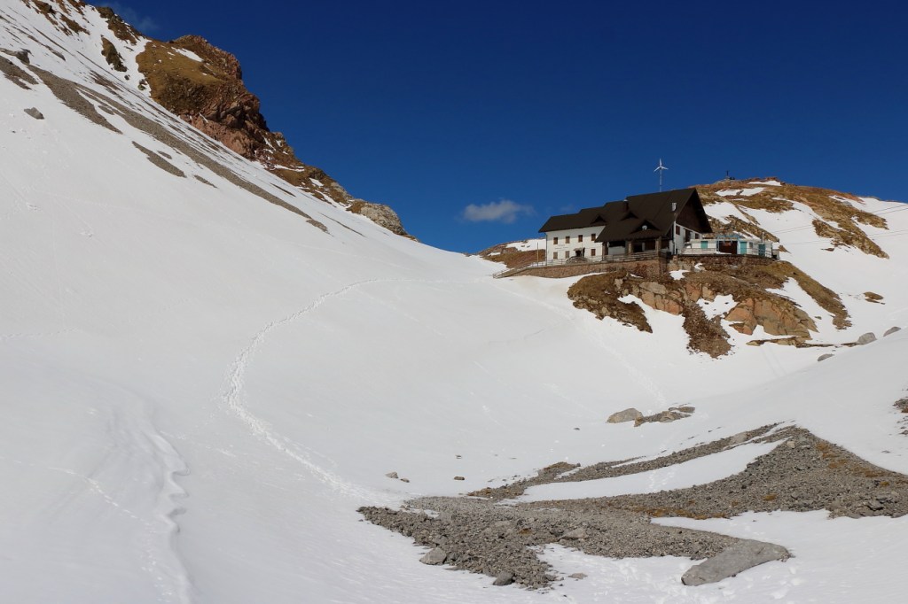 Continuando a salire più e più volte, conscio dei miei problemi di “vertigine” avevo scoperto che un punto in particolare mi metteva “agitazione” specialmente con ghiaccio, così un anno decisi ti togliermi il pensiero; ad inizio marzo un sabato mattina, partii da solo, quando fu necessario indossai i ramponi e proseguii; arrivato al mio “punto” le lastre di ghiaccio erano consistenti così evitando di guardare indietro continuai a carponi passando quei 20metri per poi rialzarmi e proseguire dicendomi, “bene, come sei salito dovrai anche scendere se non vorrai fermarti qui”! Raggiunto il pianoro sotto al rifugio mi fece i complimenti anche un Camoscio, era un bell’esemplare: arrivai a favore di vento, mi vide senza sentirmi, restammo fermi per alcuni intensi secondi a guardarci poi lui risalì mostrandomi la sua agilità con le quattro zampe motrici. Il panino al passo fu come sempre squisito. Al rientro non ebbi più alcun problema.