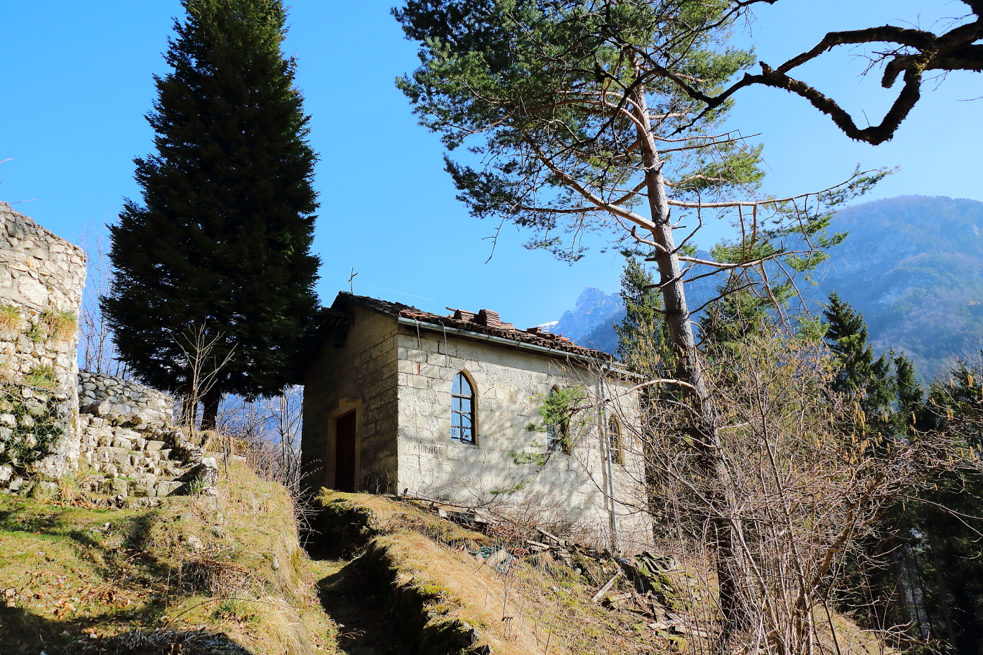 Avevo letto qualche informazione circa la Val Alba, avevo una vaga idea di cosa aspettarmi così decisi di lasciare la macchina prima del “tornante” in un comodo spiazzo con una splendida vista sulle montagne a sud. Da qui risalimmo per constatare come, già dal “tornante”, ci fosse la possibilità di altre deviazioni. Proseguimmo lungo la strada asfaltata per deviare subito dopo, sulla destra per altra strada sterrata che raggiungere i vecchi borghi di Riulade di Sotto e Riulade di Sopra: poche case, alcune danneggiate dall’ “Orcolat” del 1976; di queste alcune sono state recuperate, c’è una piccola cappella restaurata da “Alpini”.