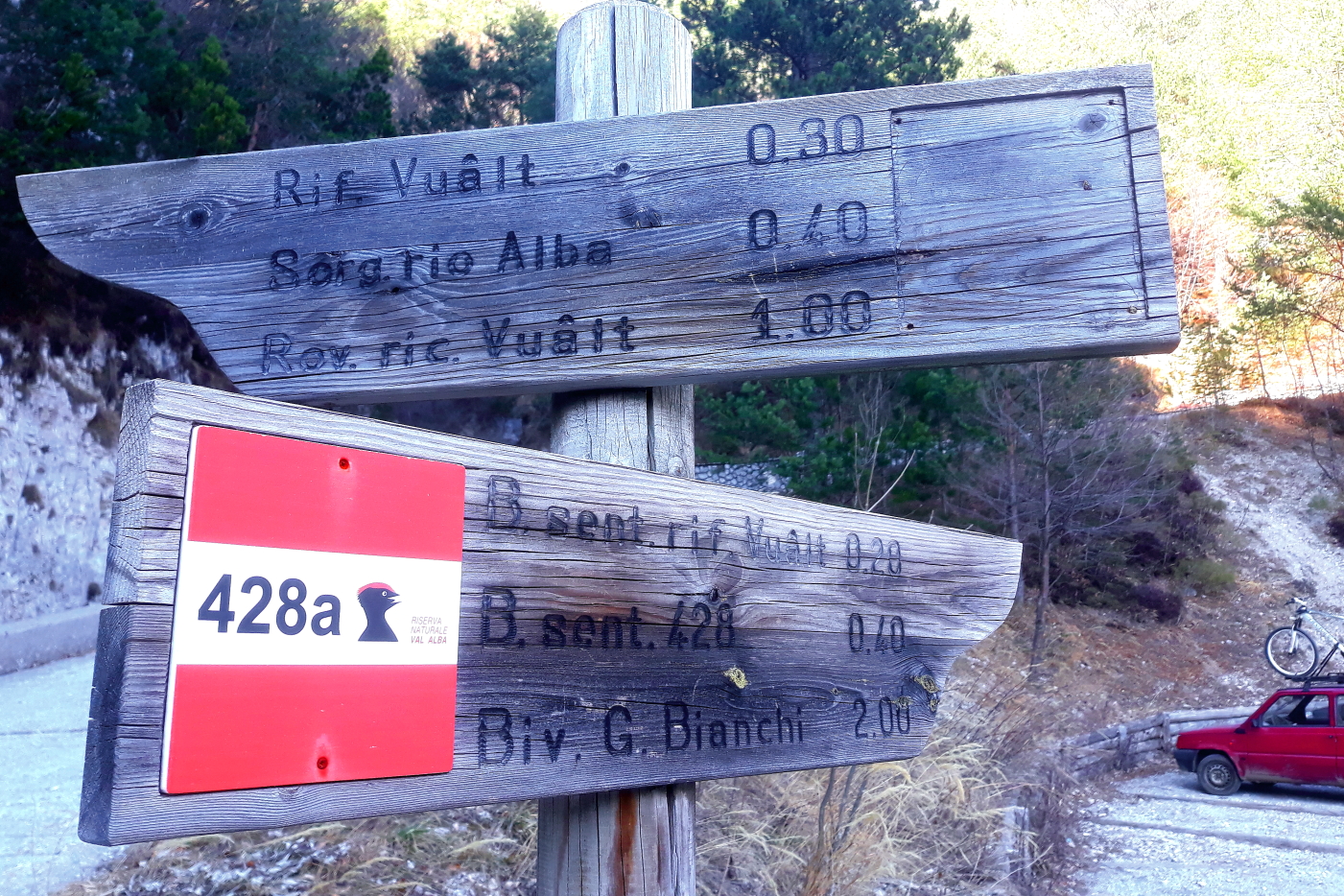 VAL ALBA Dalla località di Pradis un breve tratto di strada asfaltata conduce, in pochi km, ad una selletta ove, oltrepassato un “tornante” il paesaggio cambia, da qui ci si inoltra nella Val Alba, pochi km oltre la strada termina ad un posteggio che può contenere alcune macchine e da dove partono alcuni sentieri, uno dei quali porta in breve al Ricovero Vualt.