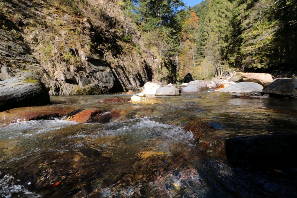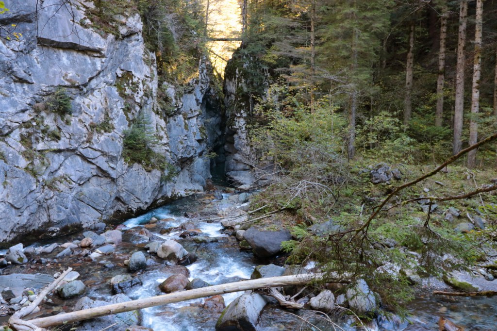 La discesa nel bosco è comoda ed ombreggiata, costeggia alcune pareti di roccia e dopo poco più di 1km di discesa si trova una deviazione del sentiero: proseguendo lungo il principale si raggiunge in breve un ponte metallico che attraversa il torrente, scegliendo invece di scendere più ripidamente alla propria destra, si raggiunge un cumulo di vecchie rocce da cui si può apprezzare una vista del torrente che prosegue verso valle in mezzo a due pareti di roccia e più in alto parte alta si scorge il ponte metallico di cui ho accennato prima; arrivati a questo punto si è già percorso poco più di 1,5km scendendo di circa 270m di quota ed abbiamo raggiunto il letto del torrente che, in quella occasione, abbiamo poi risalito attraversando radure e tratti di vegetazione molto piacevoli. Il precorso si snoda sulla riva sinistra del torrente stesso, sempre molto ombreggiato, con un saliscendi attraverso vecchi detriti ricoperti di vegetazione e muschio, attraversando il rivolo di un piccolo affluente e giungendo ad un primo punto attrezzato con corde fisse per facilitare il percorso.