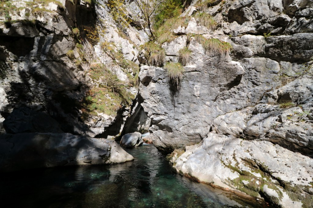 Poco dopo questo passaggio il percorso torna agevole, sino ad un ulteriore accumulo di rocce, passato il quale la vista si “chiude” sulla Forra vera e propria, dopo 2km abbondanti dalla partenza. Da qui il percorso prosegue risalendo lungo il sentiero attrezzato da corde e scavato nella roccia a pochi metri sopra l’azzurro intenso del torrente. Per miei limiti, mi sono fermato dopo pochi metri oltre questo punto, ripromettendomi di provare, alla prima occasione possibile, l’altro ingresso. Era l’ottobre 2017