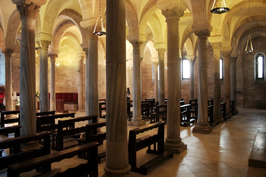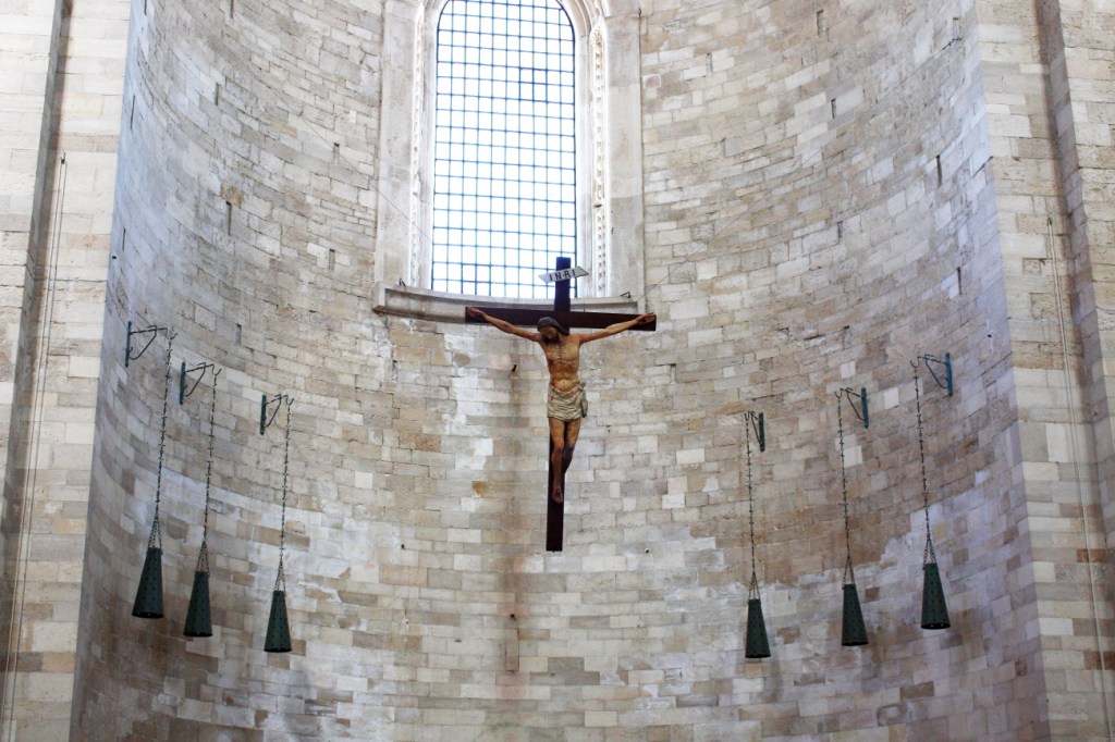 16.07 Lunedì, La colazione, inclusa nel prezzo, è in linea con l’ambiente: Cappuccino, fette biscottate in confezione bar e marmellata industriale; per noi abituati alle colazioni anglosassoni, è una cosa terribile! L’appuntamento alla ditta è in tarda mattinata decidiamo allora di raggiungere il Centro alla ricerca di un Caffe/Pasticceria dove disintossicarci. Trovo posteggio in Piazza Repubblica e da qui ci addentriamo nel centro: bello, discretamente curato, tranquillo, si gira con piacere. Stanno preparando le luminarie per una festa, ottimo il cappuccino buone le pastine e le brioches, ora sono pronto per andare al Lavoro! Raggiungiamo la ditta dove ho appuntamento con una persona cordiale, piacevole, ma le ditta è deserta, nessuna attività :-O , ci dice che “è estate e che iniziano nel pomeriggio”, sono basito! Parliamo della produzione e della mia precedente pessima esperienza con altro fornitore della zona. Non mi trasmettono una grande fiducia, ma cosa son venuto a fare qui? A vedere Trani mi dico, ok, allora torniamo a Piazza Repubblica, ritroviamo subito il posteggio e via di nuovo a passeggiare lungo Il Porto fino la Cattedrale, è molto bella come la cripta e l’interno. Fotografo tranquillamente, è una bella posizione, affacciata sul mare. Dopo un lungo pomeriggio a passeggio, in serata rientriamo all’albergo, che supplizio! Doccia tiepida, ci cambiamo: è ora di cenare. Siamo abituati a non pranzare, ma a cenare presto, ci dobbiamo adattare agli orari che qui sono diversi. Percorriamo il Lungomare Colombo, guardando ristoranti che non ci ispirano e passando oltre, sino a quando, arriva l’ispirazione ed entriamo, perplessi dall’esperienza della sera precedente. Ci guardiamo attorno e ci invitano ad accomodarci, “dove preferiamo” siamo i primi clienti e possiamo scegliere ci dicono; “siamo ancora a Trani?” domando ed il titolare, sveglio, capisce che qualche cosa ci frena ed inizia a chiacchierare informandosi, apprende così che siamo “Lagunari” e sa di cosa parliamo, gli raccontiamo allora la pessima esperienza della sera precedente e, dopo essersi informato anche sui nostri gusti, prende le ordinazioni e ci propone anche di provare qualche cosa che la sera prima ci aveva delusi, ovviamente il tutto compare sul menù che ci presenta. Il risultato della serata sarà il nostro riappacificamento con la Città: ottima cena accompagnata da buon vino con bel servizio e prezzo inferiore a quello della sera precedente. Grazie per la cortesia, dimenticavo, il Ristorante era il FALCONE !