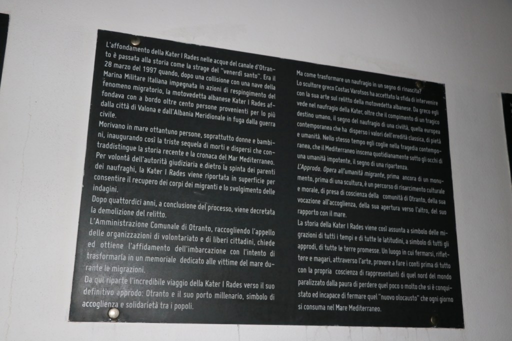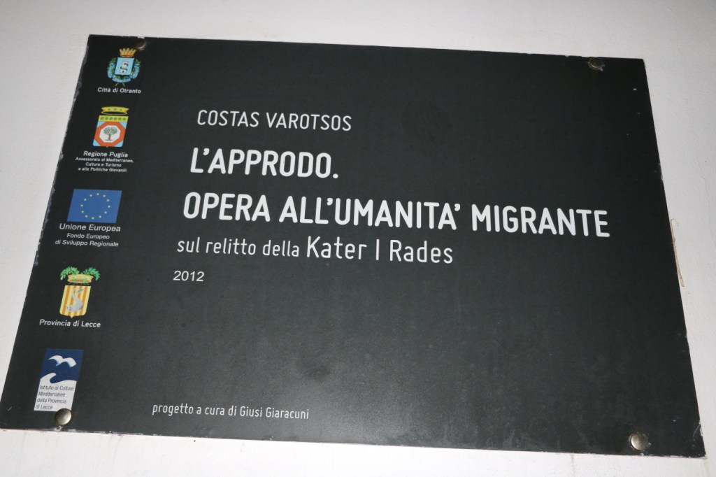 6.11 Lunedì Per colazione andremo in Piazza Libertà, poi all’appuntamento di lavoro. Trasformatomi da Turista a Professionista spiego all’altra parte cosa mi serve quali problemi che ho avuto con altri fornitori della zona e che voglio evitare, si parla della produzione, che non mi permettono di vedere, poi, terminata la riunione partiamo alla volta di Otranto dove pernotteremo. Ho scelto Otranto per un motivo specifico, che non è il trovarsi a 40 km dall’appuntamento, ma per la vicinanza al punto più ad Est d’Italia, PUNTA PALASCIA. Per strada ha piovuto e sono in ritardo, quando siamo in zona c’è una schiarita e decido di arrivare direttamente a Punta Palascia, posteggio vicino alla base militare, ci cambiamo prendiamo le giacche a vento e giù veloci per il sentiero, tornerà pioggia, la si vede chiaramente in lontananza ed il vento la porta verso di noi. Posto bellissimo, bel paesaggio, immagino come può essere al mattino presto od in giornate limpide, mi gusto il momento! Salgo anche alla terrazza dopo aver camminato sugli scogli poi, sento il cambio del vento e dò l’ordine: “RIENTRIAMO VELOCI, ARRIVA !” Risaliamo il sentiero di gran carriera e dopo il tornante arriva, ringraziamo “San Gore-Tex” protettore degli escursionisti esperti e previdenti! Ora si può raggiungere la B&B il programma della giornata è concluso. Il diluvio durerà circa un’ora, il tempo di raggiungere la B&B, posteggiare, entrare, cambiarci e sta già smettendo e si fa buio. Che dici, andiamo a scoprire Otranto? Certamente! Sono circa le 18, la passeggiata è piacevole, ha smesso di piovere, purtroppo in paese è tutto chiuso, Negozi, Ristoranti, Chiese, il Castello chiude mentre arriviamo. E’ comunque bello. Dopo la giornata in macchina abbiamo voglia di camminare, così proseguiamo verso la parte nuova cercando ristoranti, tra chiusi e non invitanti perdiamo fiducia, poi la luce: stanno facendo le pulizie in uno che ci ispira e ci dicono che aprono 30 minuti più tardi, la porta adiacente è l’ingresso di una pasticceria: MARTINUCCI, dove ordiniamo Aperitivo e Stuzzichini, poi sarà cena! DAL BAFFO. Il dolce no, per quello torniamo da MARTINUCCI ! Rientreremo attraversando il centro storico, completamente deserto, una sensazione strana, arrivando alla zona del porto con una piazza ampia e moderna ed una stranissima scultura, non poi così strana, da lontano ricorda una nave, ha la forma di una nave anzi è proprio una piccola nave. La guardo e mi ricordo che alcuni anni prima era affondata una nave albanese in quelle zone, se ben ricordo si era “toccata” con una militare, i ricordi sono vaghi ma trovo una lapide con la spiegazione e mi aiuta a ricordare: Venerdì Santo del 1997 si chiamava Kater i Rader, ricordo i servizi alla televisione sull’affondamento, sul recupero. Le migrazioni ci sono sempre state, infatti l’uomo ha le gambe per muoversi, altrimenti avrebbe avuto radici. La storia ne è fatta da migrazioni, ricordo che mi veniva insegnato sin dai primi anni di scuola nelle lezioni di storia. La nostra stessa popolazione è il frutto di incroci che nei secoli si sono ripetuti ed accavallati: Normanni, Unni (ed il Friuli con Aquileia ne sa qualche cosa), Longobardi, Franchi, Visigoti, ci sono stati anche Spagnoli ed Arabi, in Friuli anche cosacchi, ora sono altri, ma è curioso, hanno tutti hanno la dotazione standard di 2 gambe e 2 braccia, esattamente come i nostri antenati, quelli che sono andati in giro per l’Europa, Nord e Sud America, ed Australia dove tutt’ora molti emigrano; questo senza parlare di casi diversi di movimenti “interni” comunque forzati per chi si doveva spostare: mia nonna nella 1′ Guerra Mondiale era stata “migrata” da Budoia ad Aversa come profuga e da quanto mi era stato raccontato a sua volta da mia mamma, non pare fossero stati accolti a braccia aperte, i Profughi Giuliani, arrivati in Italia dall’Istria e Dalmazia non raccontavano di accoglienze calorose. Il punto è semplicemente che l’estraneo o lo sconosciuto fa sempre paura. Nel ’68 mi pare che una parte degli abitanti del Belice siano stati “aiutati” a trasferirsi, altri concittadini si sono spostati dal Sud al Nord in cerca di lavoro, dal Veneto e Friuli alle paludi Pontine tra le due Guerre. Dal Friuli alla Romania dopo la 1′ guerra mondiale, qualcuno lo sa? Ho incontrato diversi nomi di origine friulana in Romania …. a continuare non si finirebbe più con gli esempi! Ma molti ottusi rispondono: non è cosa mia, oppure “I nostri andavano rispettando le leggi”. Conoscendo la storia qualche cosa si capisce anche del presente ignorandola invece…. ,ma la storia non a tutti conviene ricordarla e spesso non la si conosce affatto. Dormiremo in una B&B li vicina, bella struttura ma il servizio piuttosto debole.