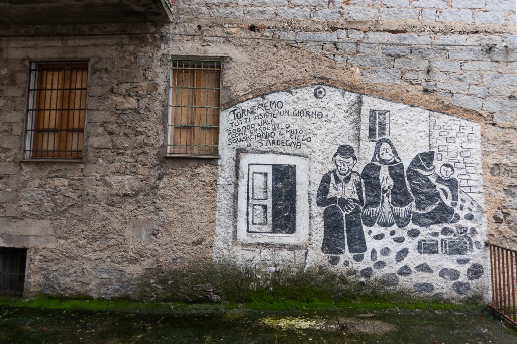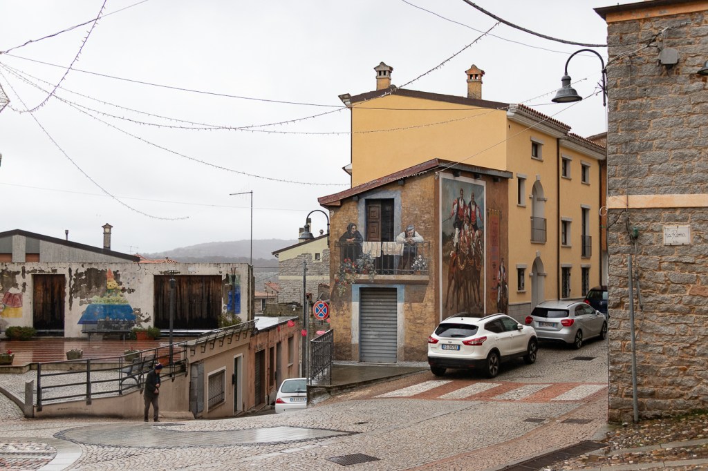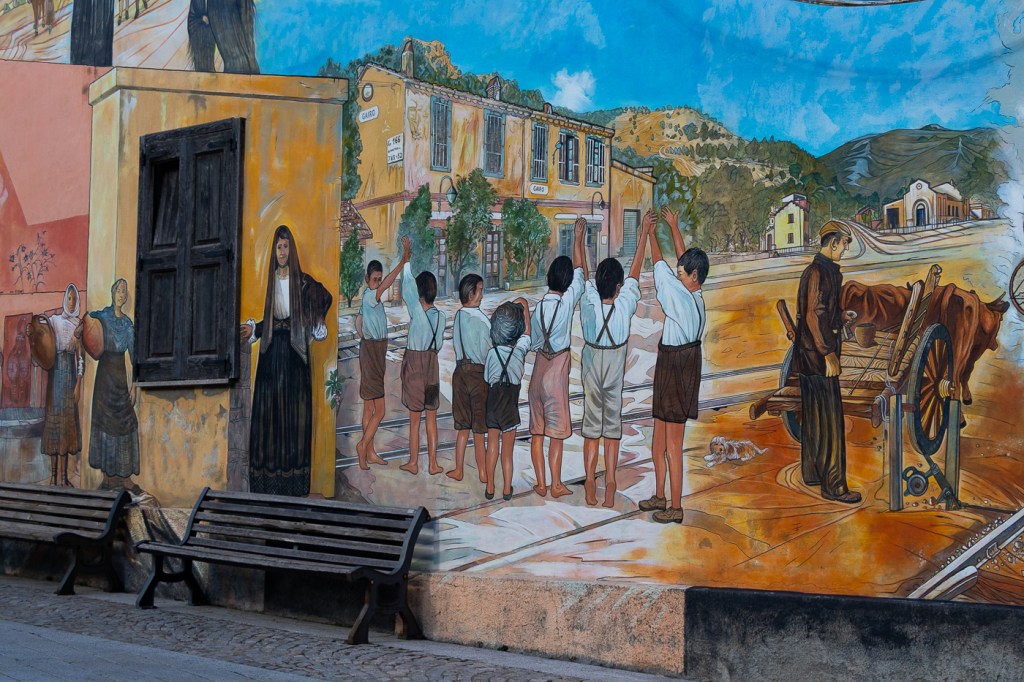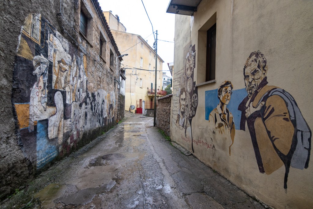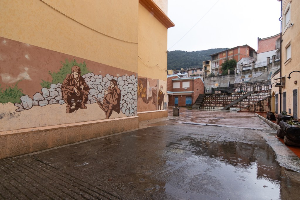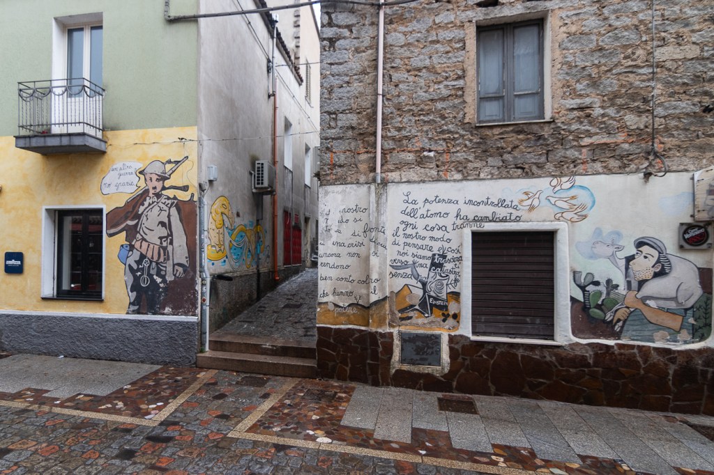 Ci arriviamo che piove, entriamo in un caffè che diluvia, ne usciamo che pioggerella… ma i murales sono molti, alcuni sono eccezionali, alcuni rammentano la storia d’Italia oppure rappresentano l’opinione di alcuni sardi nei confronti di Politici, locali e non, altri raccontano particolari della storia Sarda: un museo a cielo aperto si può dire, forse anche opere d’arte dico io.