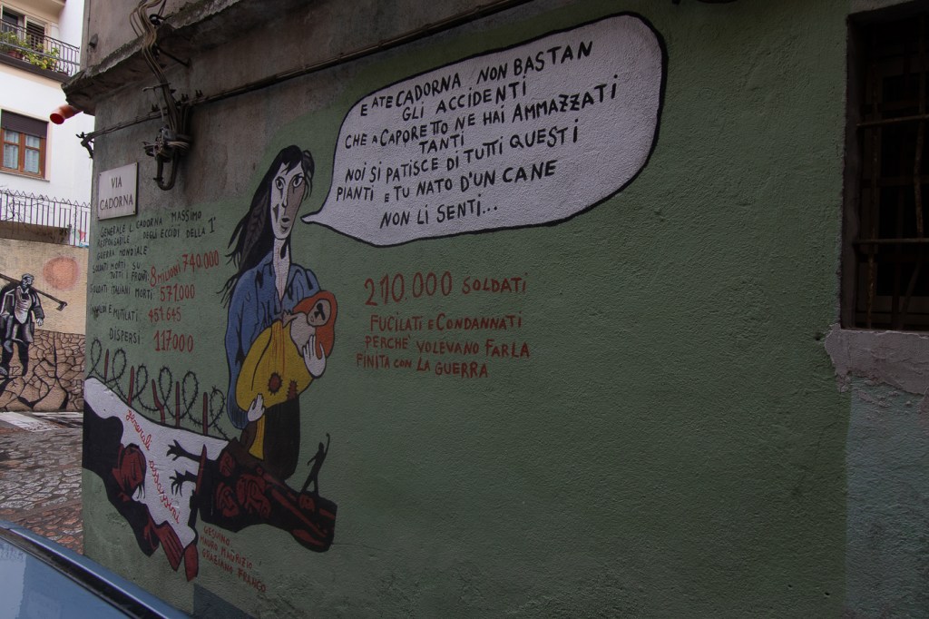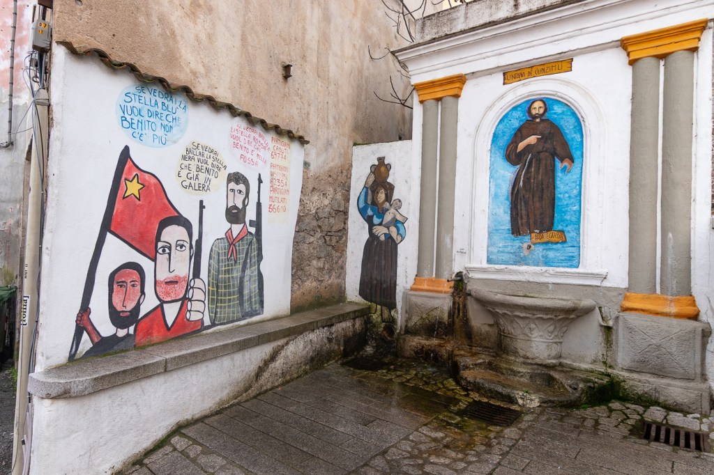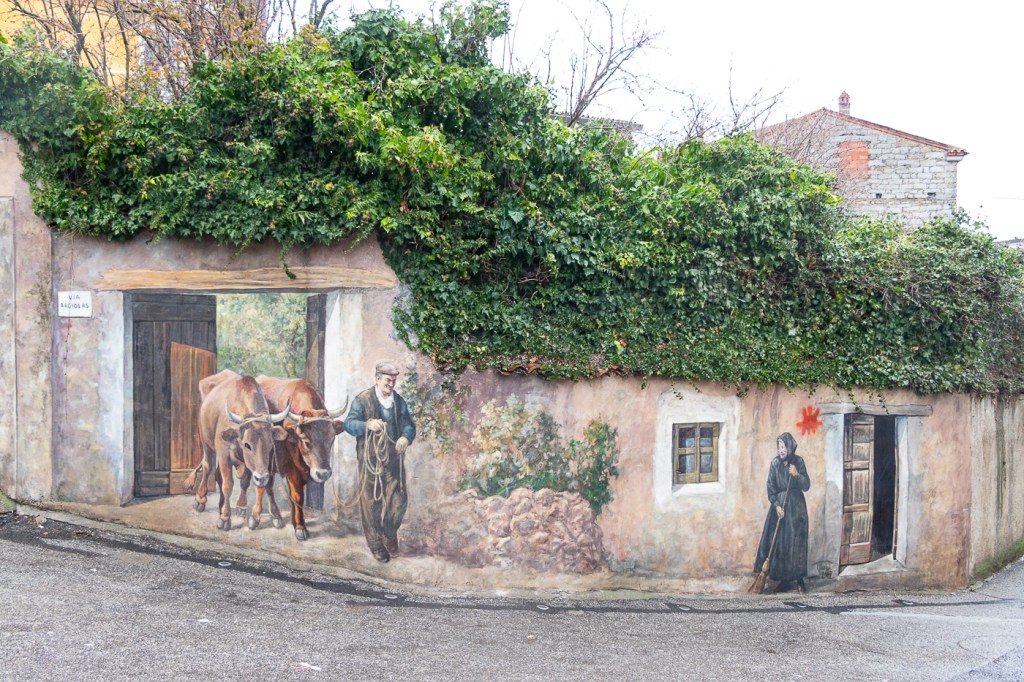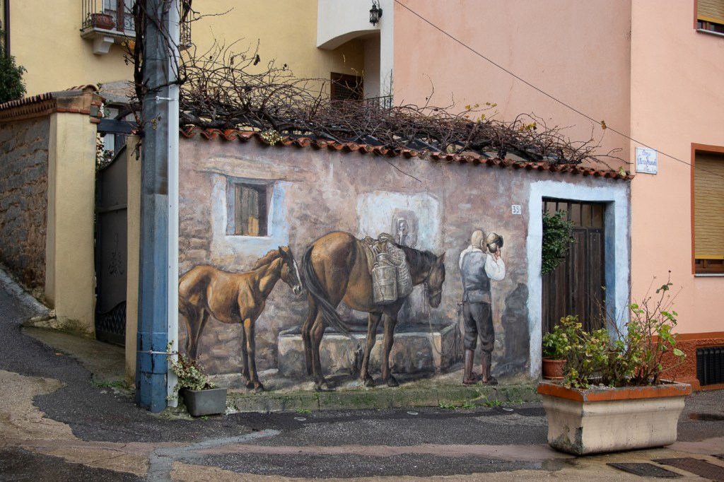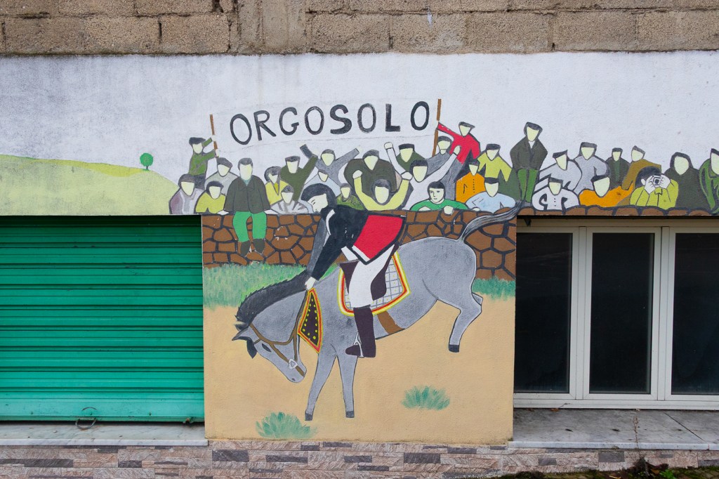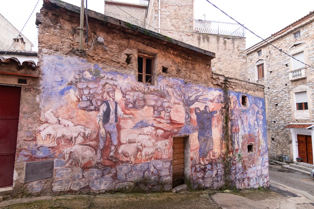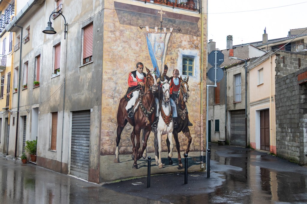 Ci arriviamo che piove, entriamo in un caffè che diluvia, ne usciamo che pioggerella… ma i murales sono molti, alcuni sono eccezionali, alcuni rammentano la storia d’Italia oppure rappresentano l’opinione di alcuni sardi nei confronti di Politici, locali e non, altri raccontano particolari della storia Sarda: un museo a cielo aperto si può dire, forse anche opere d’arte dico io.