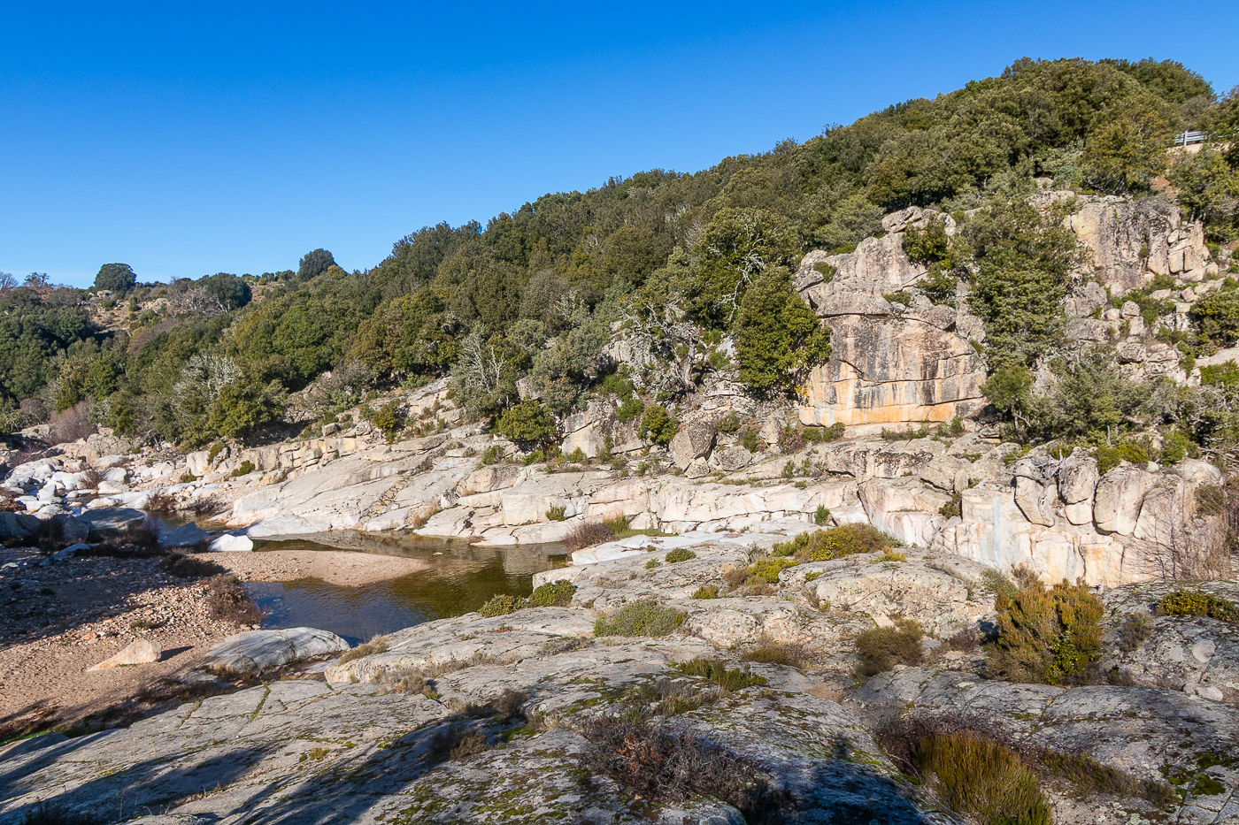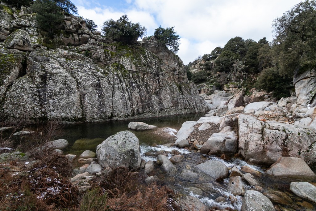 Lasciata la strada per scendere a Bau mela, troviamo anche i Maiali selvatici e poi, per un attimo, vediamo una Volpe sarda. Assunta ha una sua avversione per tutto ciò che è scivoloso, avversione derivante da innumerevoli tonfi succedutisi negli anni, così quando posteggio per imboccare il breve sentiero, Lei preferisce attendermi alla macchina. Il percorso è breve e reso scivoloso dalla pioggia e per il fango, ma le “piscine” sono interessanti.