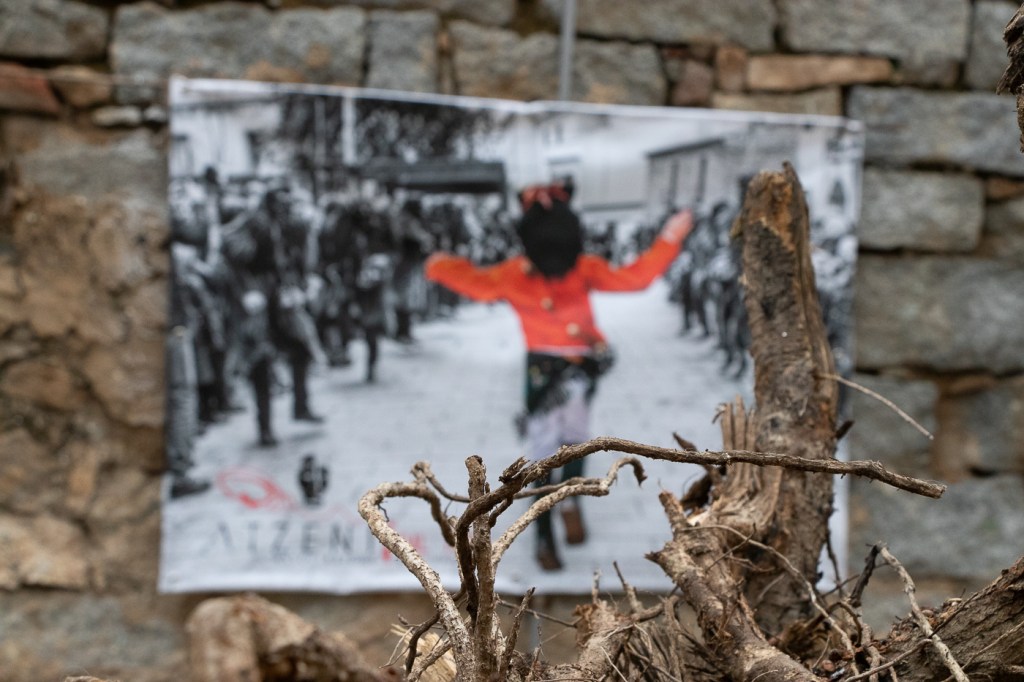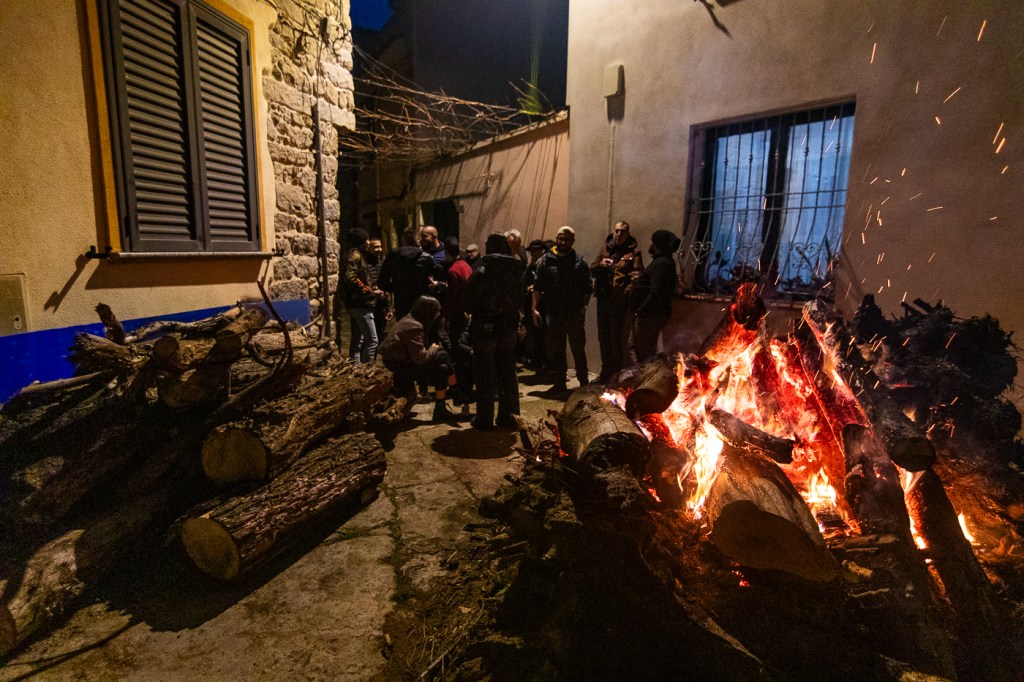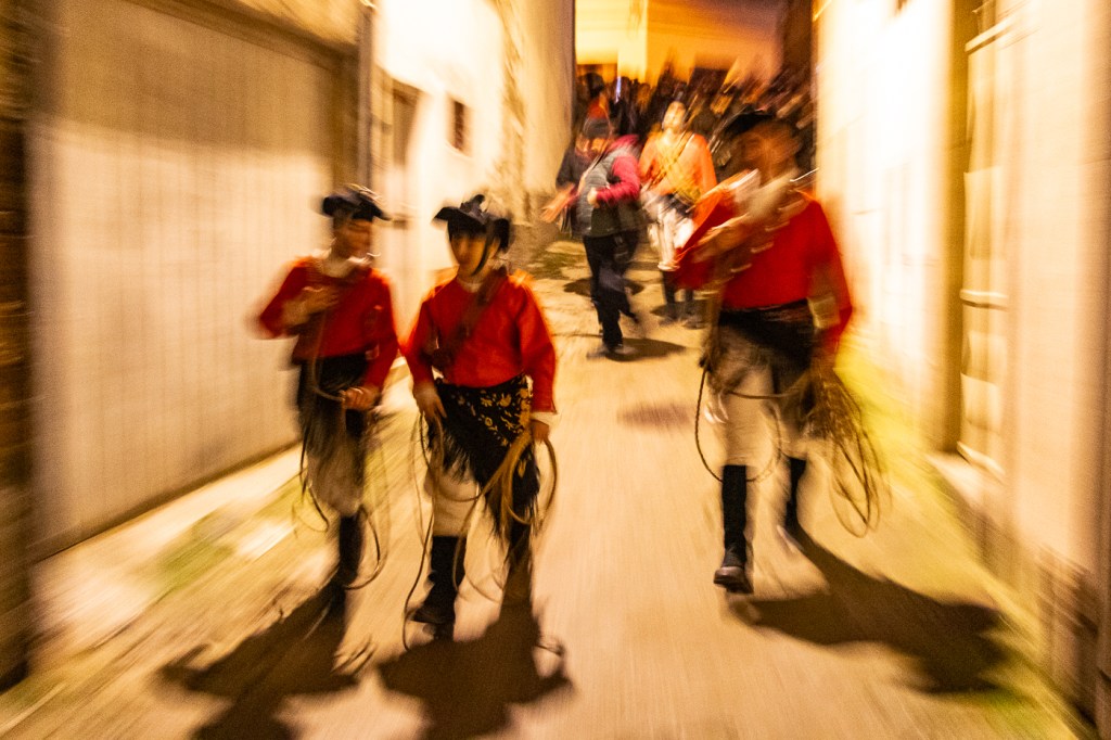 All’apertura del portone mi sono guadagnato una posizione vicina ai Mamuthones, ma la ressa che trovo fuori mi sorprende, Delphina davanti a me ed io restiamo sopraffatti, emarginati dalla folla che attende fuori; ci facciamo sorprendere e, senza accorgercene li abbiamo persi! Delfina è sorpresa e rimane quasi immobile così la sorpasso ed accelero attraversando la folla, diretto alla chiesa di Santa Maria Assunta dove raggiungo il gruppo che sta già “Omaggiando” il Falò principale, 2 minuti e ripartono e li perdo nuovamente. Decido allora di tornare sui miei pasi, verso la sede della Associazione, proprio mentre l’altra compagnia arriva a sua volta alla Chiesa. Oggi le due associazioni, con i loro Mamuthones e Issohadores, gireranno il paese fino a sera, raggiungendo ognuno dei circa 40 falò del paese, per portare l’augurio di una nuova buona annata, risvegliando la terra e la natura dopo l’inverno. Le associazioni si sono divise il paese, Atzeni quest’anno attraversa il centro e la parte Alta. Nei pressi dell’associazione spiego di averli persi e mi danno una indicazione generica del percorso, così, ripartito velocemente, li ritrovo quasi subito.
