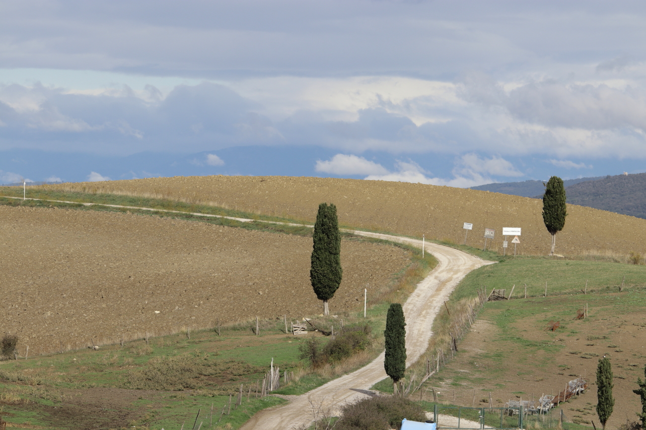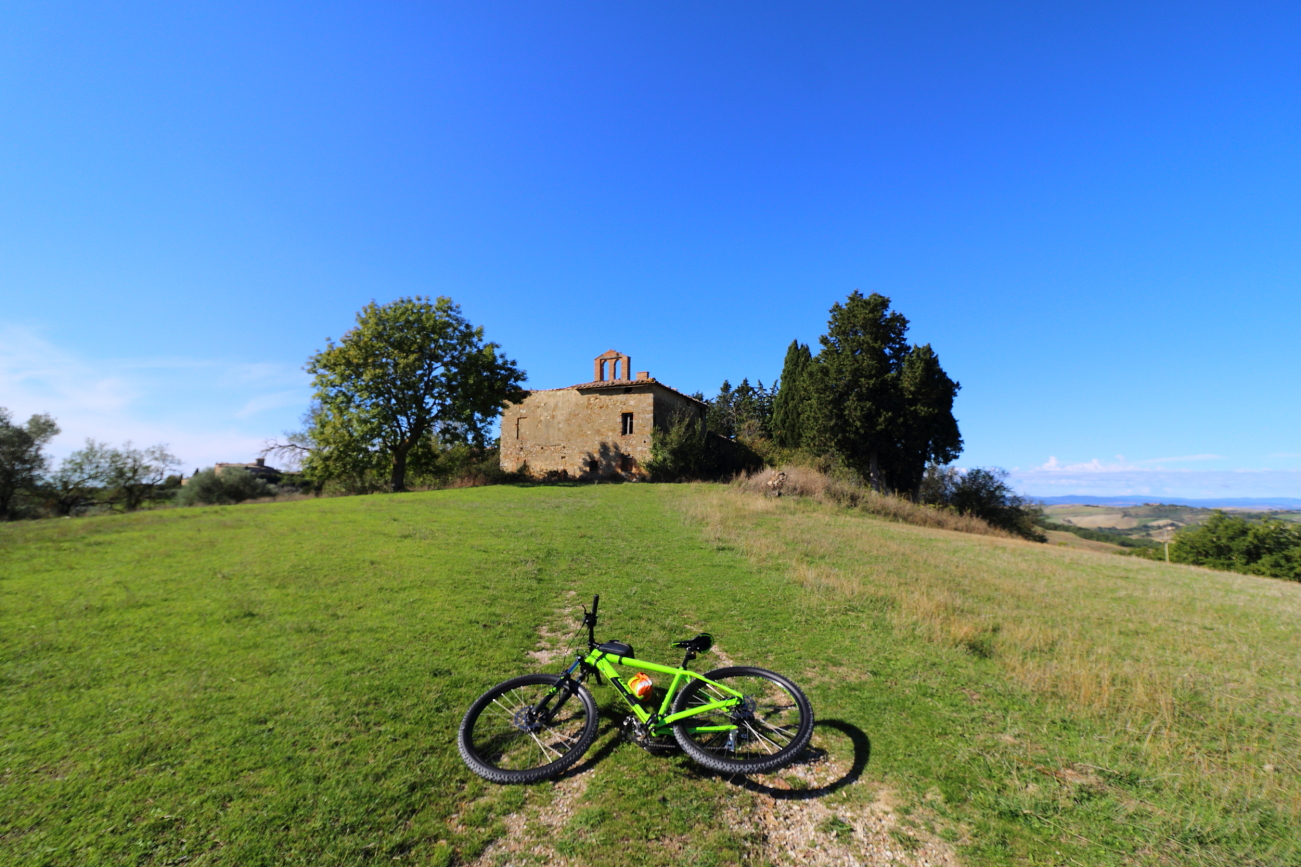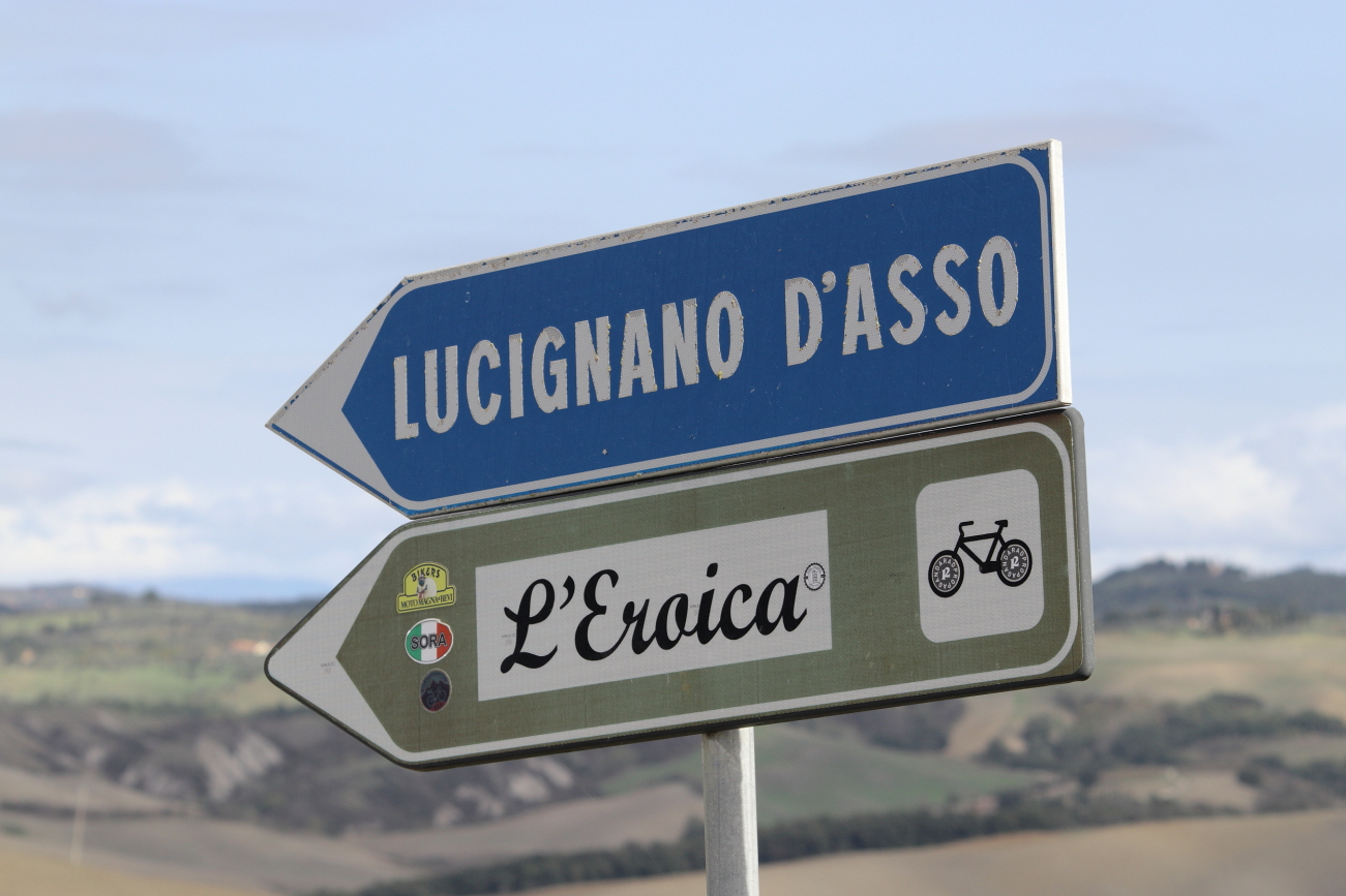 LUCIGNANO D’ASSO e dintorni – IL 2020 un “Anno Orribilis”! era per me iniziato con la rottura di un menisco, certificata ad inizio marzo e quindi messo in Lista d’attesa, poi… “Lockdown”, i camion militari in partenza da Bergamo, alcuni diretti anche in Friuli, notizie, speranze, timori… e chi più ne ha piu ne metta. Quella primavera in cui tutti eravamo stati messi in “pausa” avevo scoperto che, nonostante il menisco, potevo pedalare così, appena ci fu possibile uscire di casa, smisi di farlo tra gli alberi del giardino per aumentare le distanze su strade più lunghe. Ad ottobre mi ero ripreso dai “danni collaterali” dalla sfortunata artroscopia di luglio, nel frattempo avevo letto di qualche cosa che prima non conoscevo: l’ Eroica. In ottobre poi c’è una data che per i più informati dovrebbe ricordare la scoperta dell’America, per noi è sopprattutto altro. Decidemmo allora di festeggiare in modo diverso, distanziati, evitando assembramenti: qualche chilometro di pedalata sugli sterrati dell’Eroica, tra Torrenieri, Sant’Anna di Camperna e San Giovanni d’Asso a testare le mie ginocchia ed il mio fiato. L’aver lasciato la macchina per scaricare le nuove MTB al posteggio attrezzato di Torrenieri, in comune di Montalcino, ci ha costretti ad una partenza “in Salita”, così, giusto per rompere il fiato! Da qui, imboccata la SP137 e porcorse alcune qualche curve in salita, abbiamo seguito le indicazioni imboccando lo sterrato. Dopo una breve ripida salita con “tornantino spaccaginocchia” abbiamo iniziato un percorso panoramico, lungo crinali di colline, percorrendo salite e discese ed attraversando vecchi borghi come il Cosona sempre con campi ai due lati, sino a raggiungere un bivio, in posizione soprelevata da dove il panorama inclideva il monastero di Sant’Anna di Camprena, raggiungibile proseguendo dritto in leggera costante discesa; l’alternativa è girare a sinistra, in direzione Lucignano d’Asso dove si giunge, in pochi km.