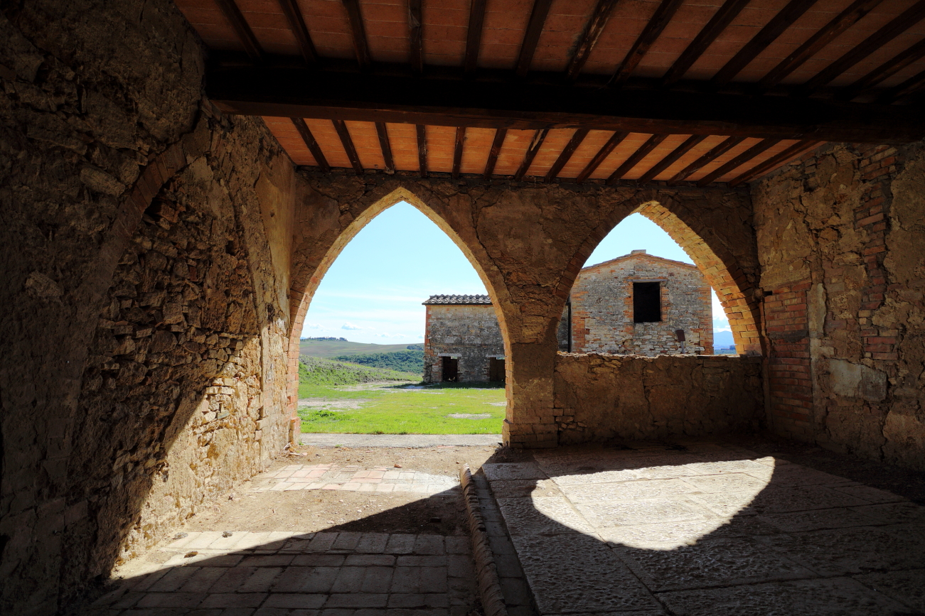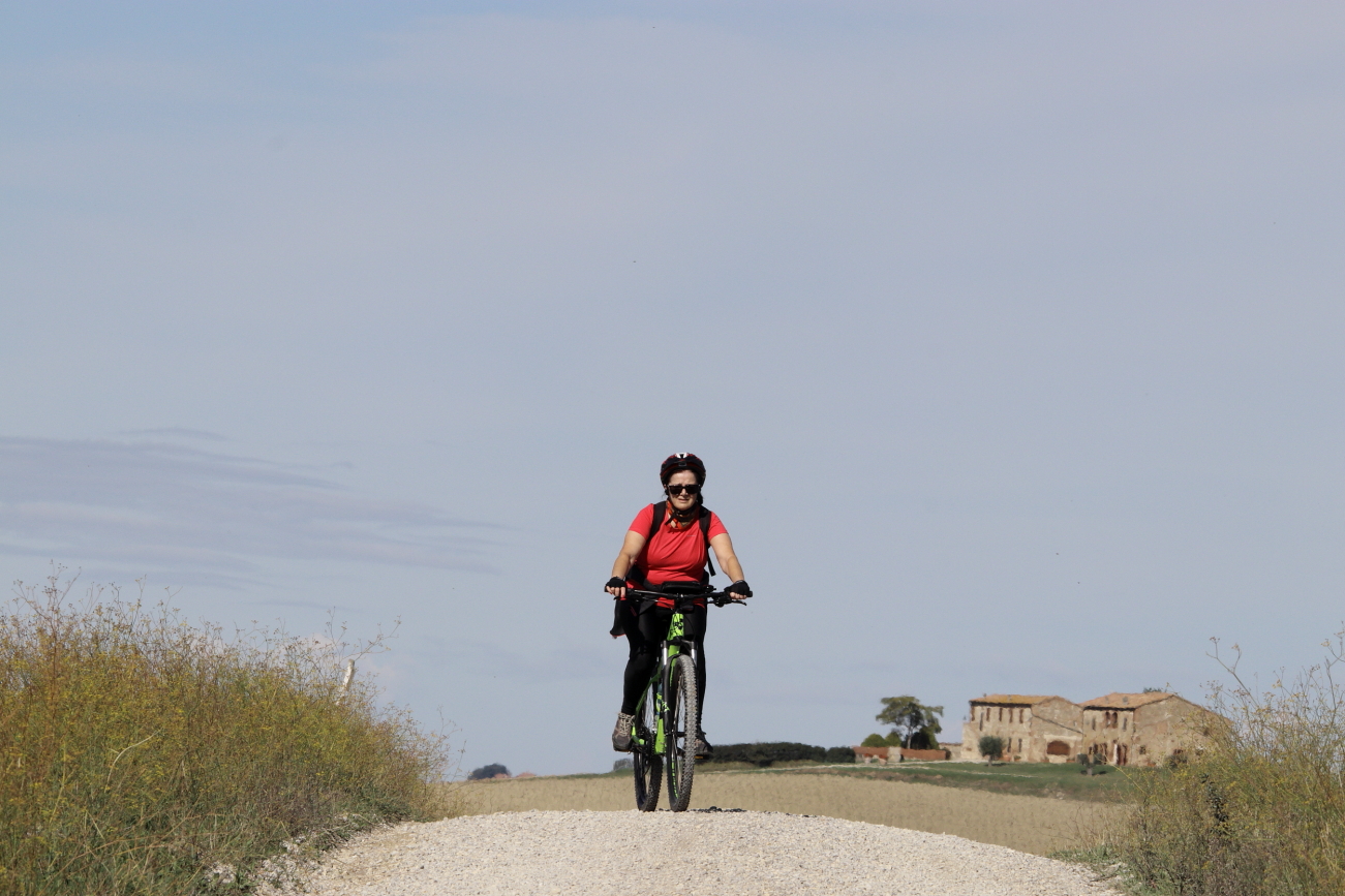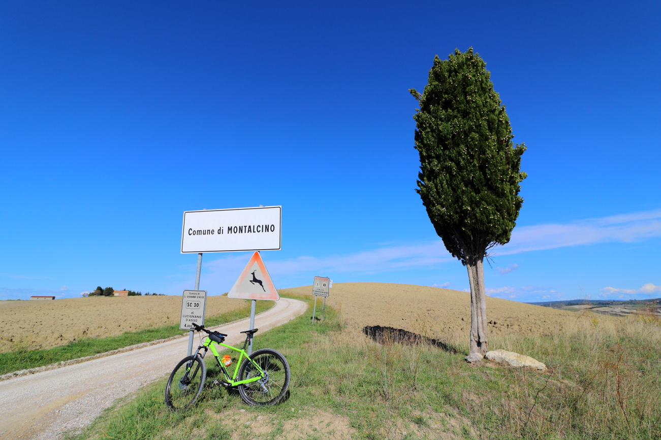LUCIGNANO D’ASSO e dintorni – IL 2020 un “Anno Orribilis”! era per me iniziato con la rottura di un menisco, certificata ad inizio marzo e quindi messo in Lista d’attesa, poi… “Lockdown”, i camion militari in partenza da Bergamo, alcuni diretti anche in Friuli, notizie, speranze, timori… e chi più ne ha piu ne metta. Quella primavera in cui tutti eravamo stati messi in “pausa” avevo scoperto che, nonostante il menisco, potevo pedalare così, appena ci fu possibile uscire di casa, smisi di farlo tra gli alberi del giardino per aumentare le distanze su strade più lunghe. Ad ottobre mi ero ripreso dai “danni collaterali” dalla sfortunata artroscopia di luglio, nel frattempo avevo letto di qualche cosa che prima non conoscevo: l’ Eroica. In ottobre poi c’è una data che per i più informati dovrebbe ricordare la scoperta dell’America, per noi è sopprattutto altro. Decidemmo allora di festeggiare in modo diverso, distanziati, evitando assembramenti: qualche chilometro di pedalata sugli sterrati dell’Eroica, tra Torrenieri, Sant’Anna di Camperna e San Giovanni d’Asso a testare le mie ginocchia ed il mio fiato. L’aver lasciato la macchina per scaricare le nuove MTB al posteggio attrezzato di Torrenieri, in comune di Montalcino, ci ha costretti ad una partenza “in Salita”, così, giusto per rompere il fiato! Da qui, imboccata la SP137 e porcorse alcune qualche curve in salita, abbiamo seguito le indicazioni imboccando lo sterrato. Dopo una breve ripida salita con “tornantino spaccaginocchia” abbiamo iniziato un percorso panoramico, lungo crinali di colline, percorrendo salite e discese ed attraversando vecchi borghi come il Cosona sempre con campi ai due lati, sino a raggiungere un bivio, in posizione soprelevata da dove il panorama inclideva il monastero di Sant’Anna di Camprena, raggiungibile proseguendo dritto in leggera costante discesa; l’alternativa è girare a sinistra, in direzione Lucignano d’Asso dove si giunge, in pochi km.